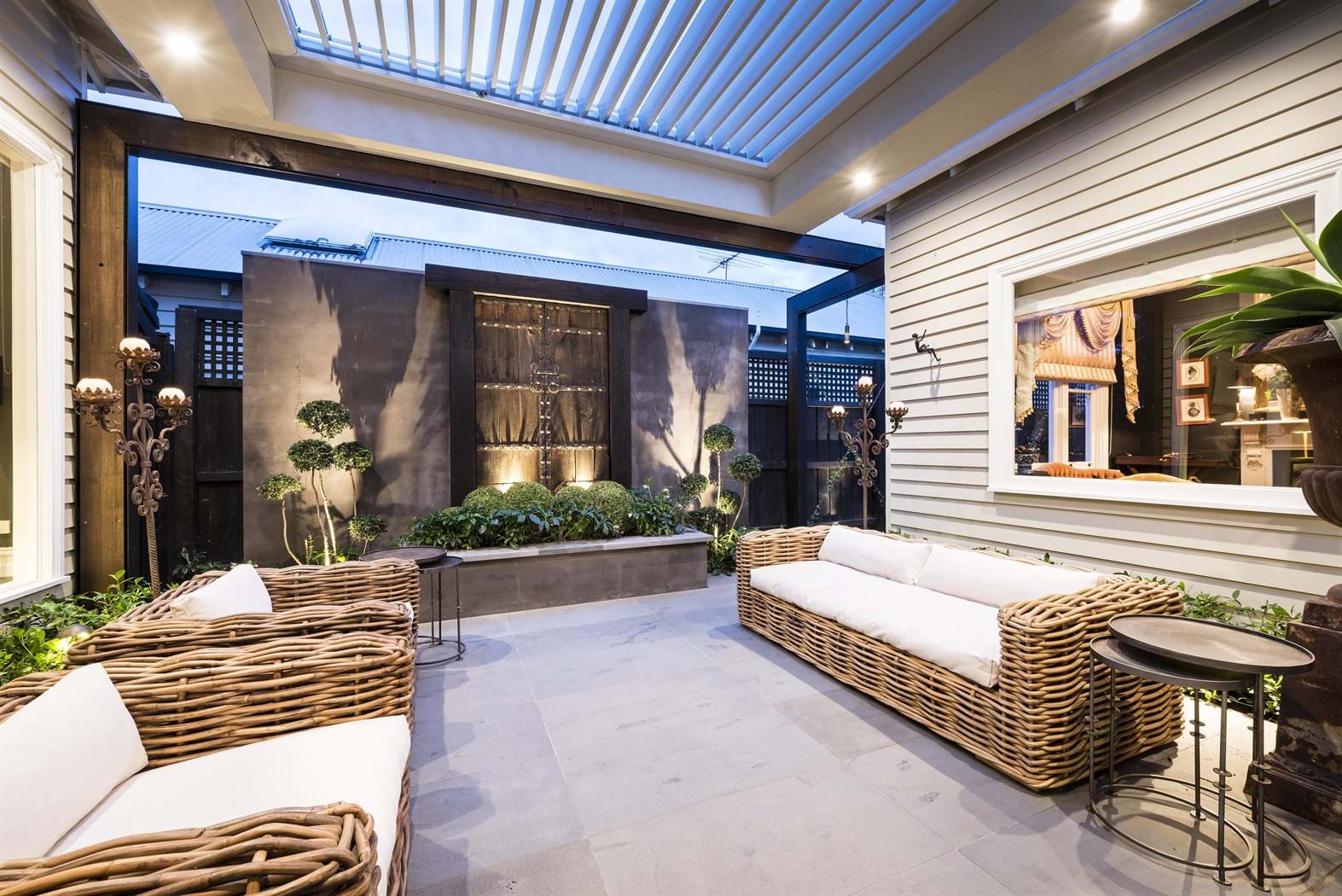 The clients wanted the transformation of a cluttered, underused and tired courtyard into a relaxed outdoor lounge. With improved access from the home, a flexible roof cover, a special focal point (to take the emphasis away from the neighbours roof) and an overall visual impression that would become a permanent invitation to use the once never used courtyard.