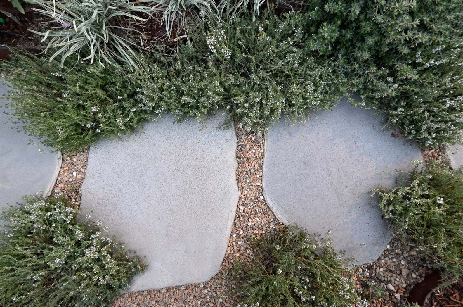 Recycle and reuse items within the garden such as the vertical production spirals were 'upcycled'. The paving dimensions were selected for minimum cuts and wastage and groundcover. Recycled gravels created fantastic mulch, allowing for maximum water penetration for the garden beds.