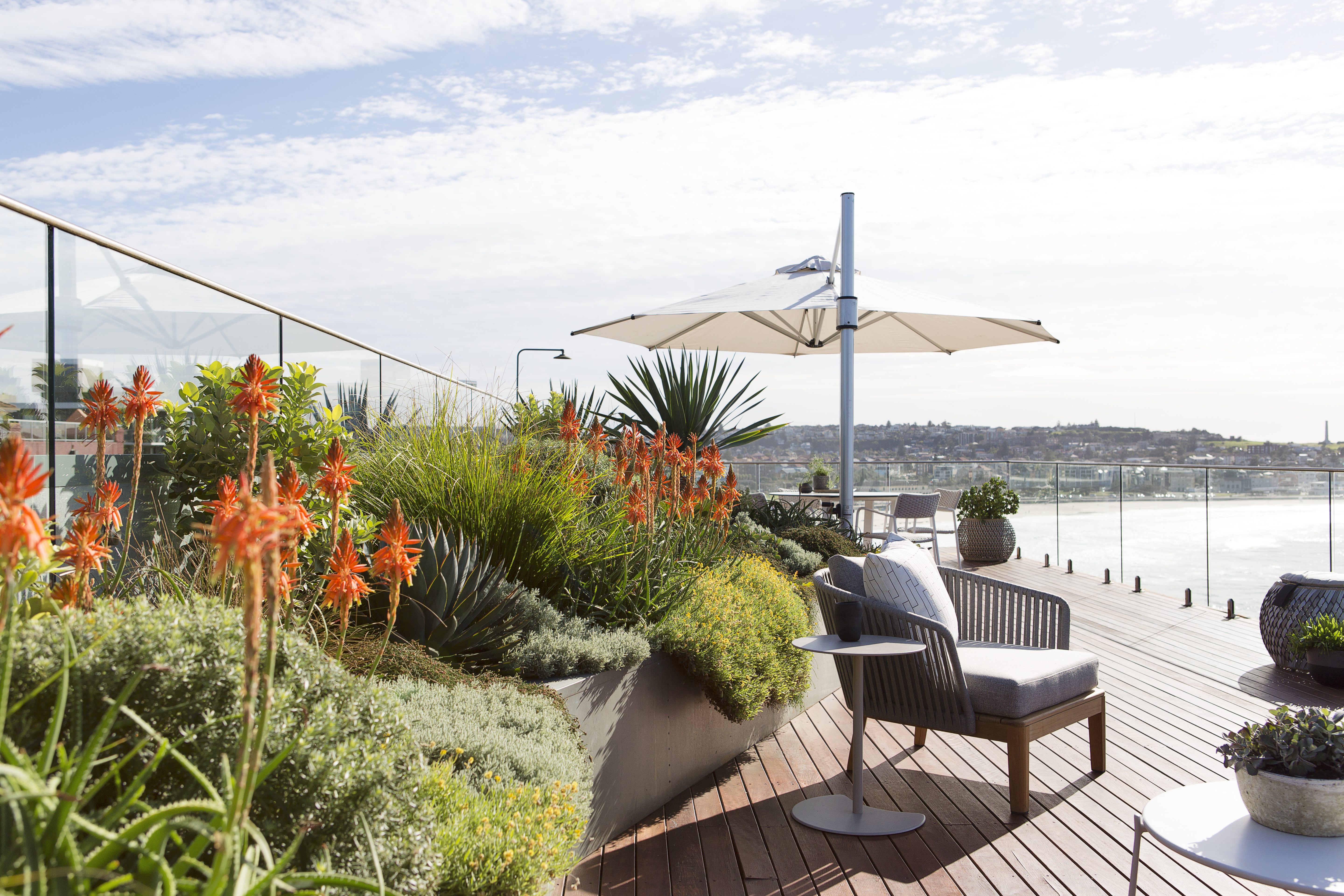 The brief from this client was to create a planting design for a rooftop with spectacular ocean views. The planting was to soften the view back towards other nearby apartment buildings, forming a visual barrier that helps to orientate the space towards the ocean and distract from the buildings behind.