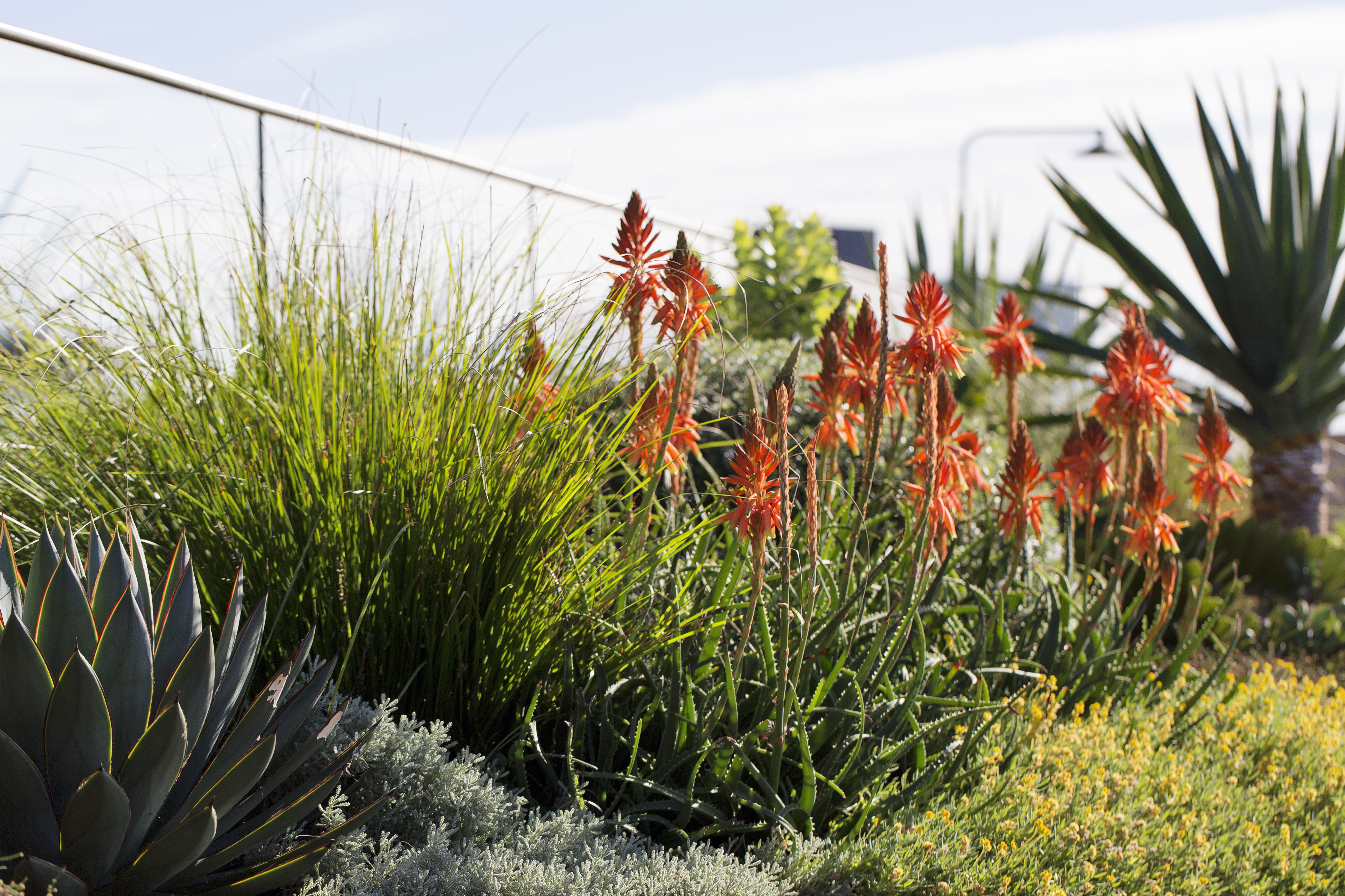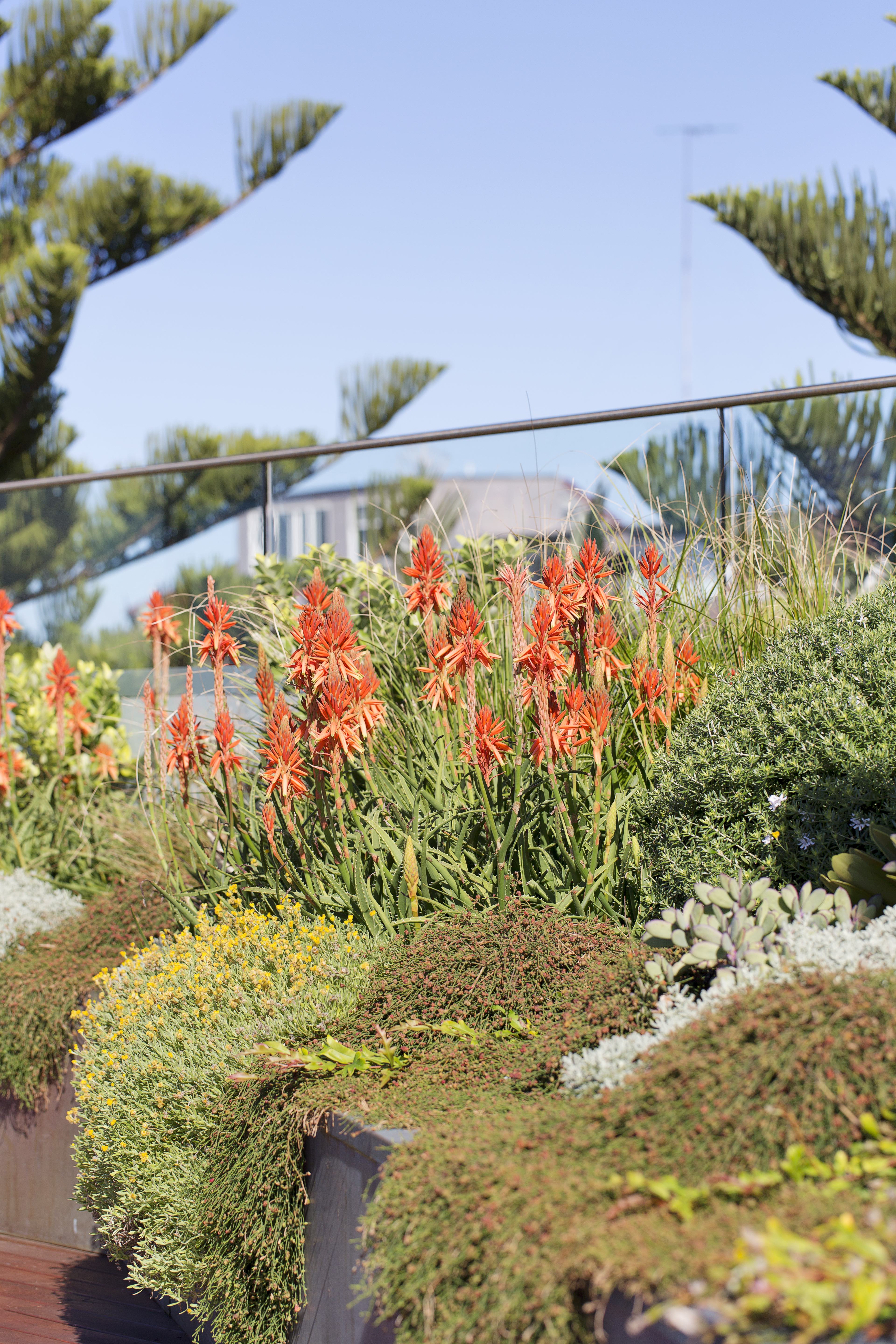 A statement, contemporary design was desired, with plants that could tolerate the intense and variable weather conditions that come with a rooftop right on the coast.