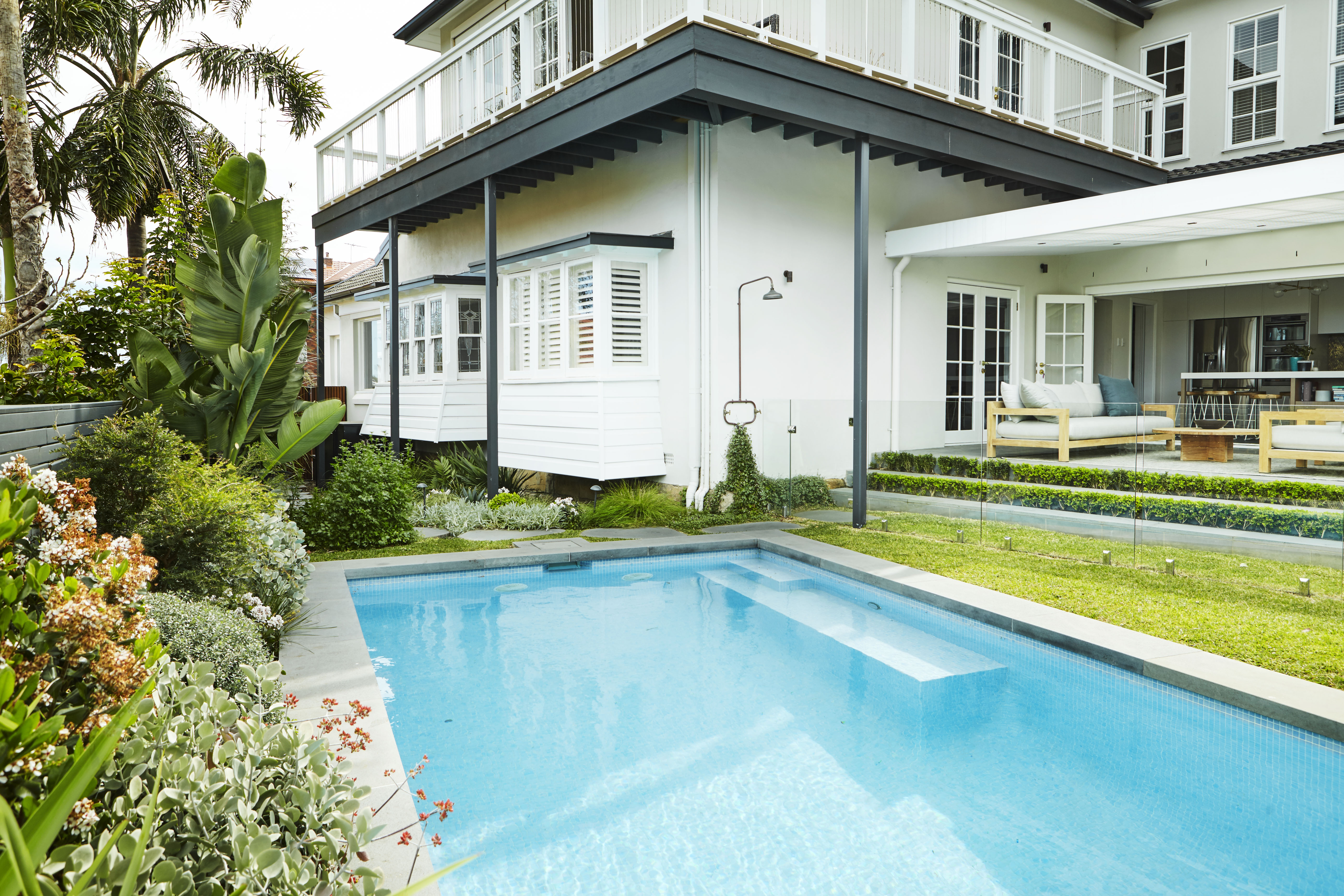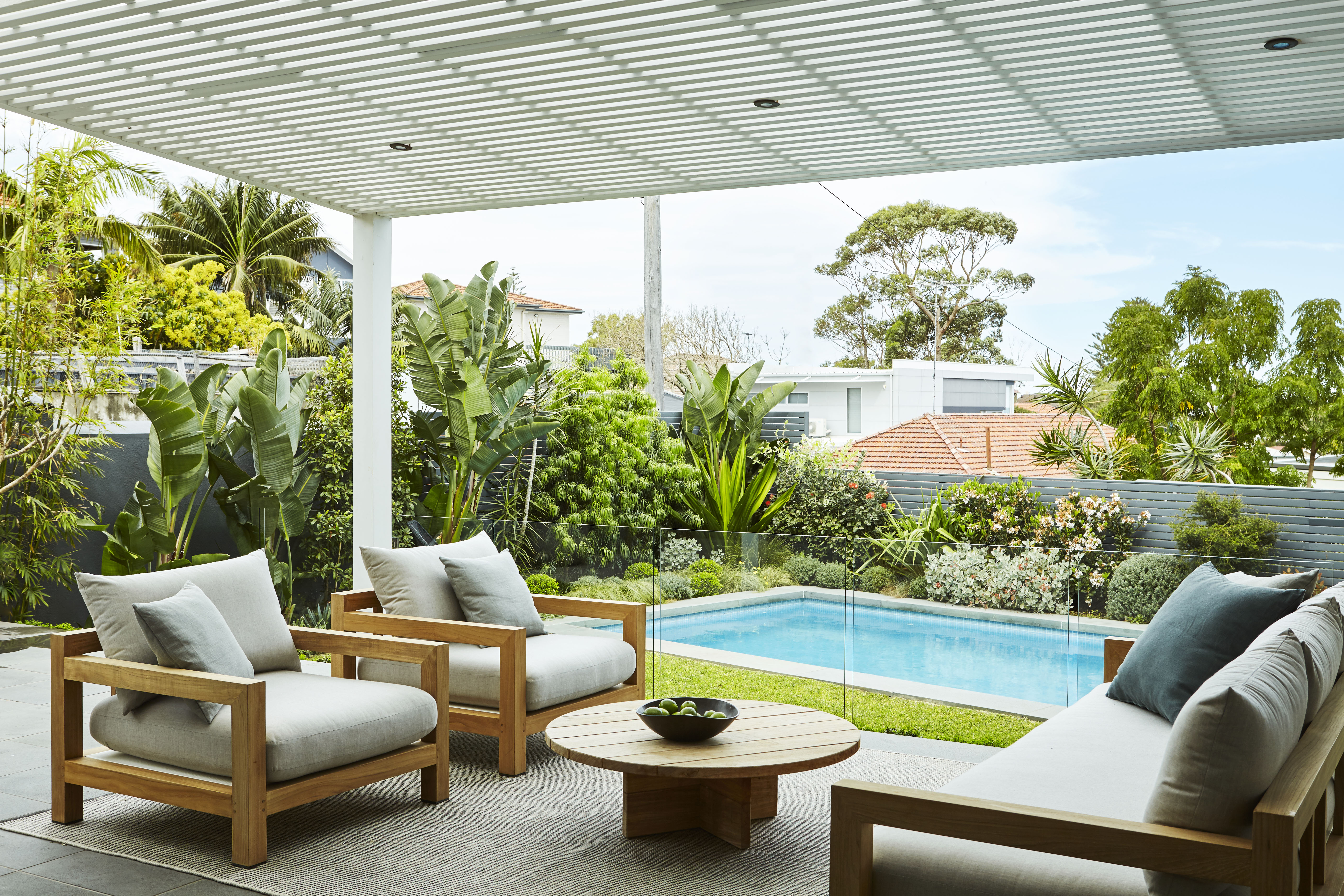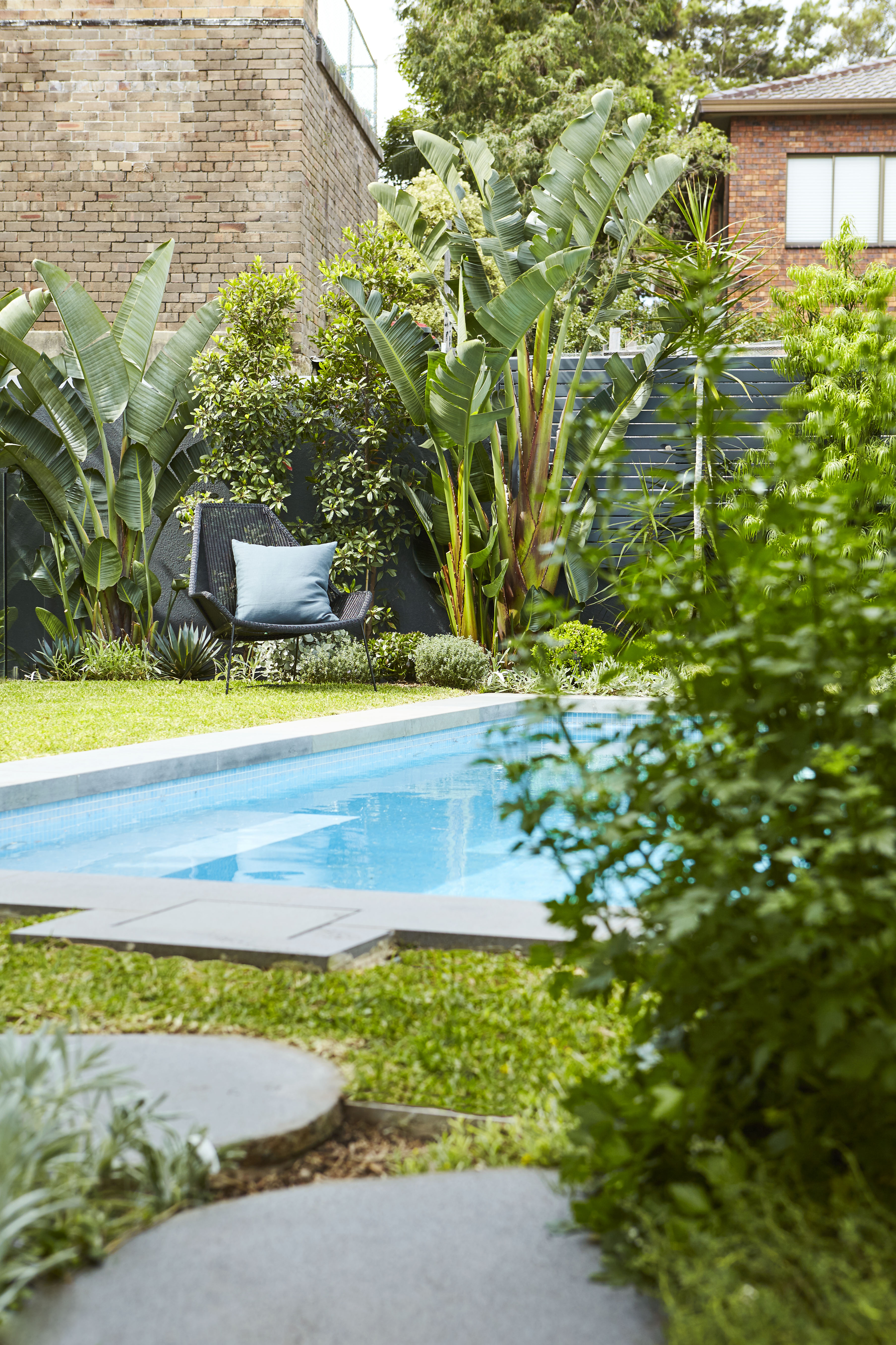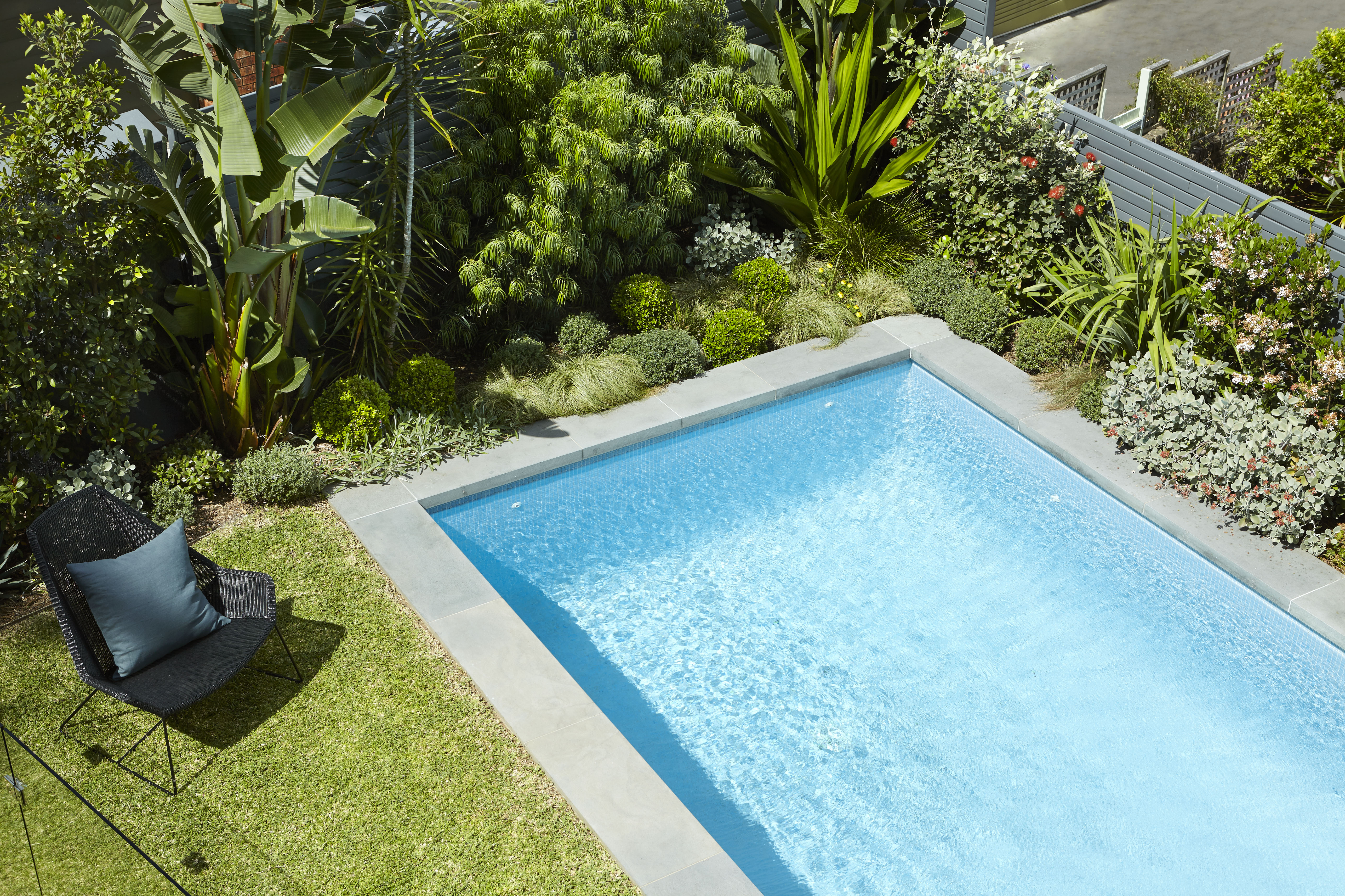 The client wanted their new garden to be contemporary, inviting, and connected to the house. A pool was desired, as was a covered space for lounging, a dining area and a built in BBQ for entertaining. In terms of planting, the client wanted a complete redesign that would better reflect Coogee’s coastal setting, appearing lush while also affording for space for the pool and for a small lawn.