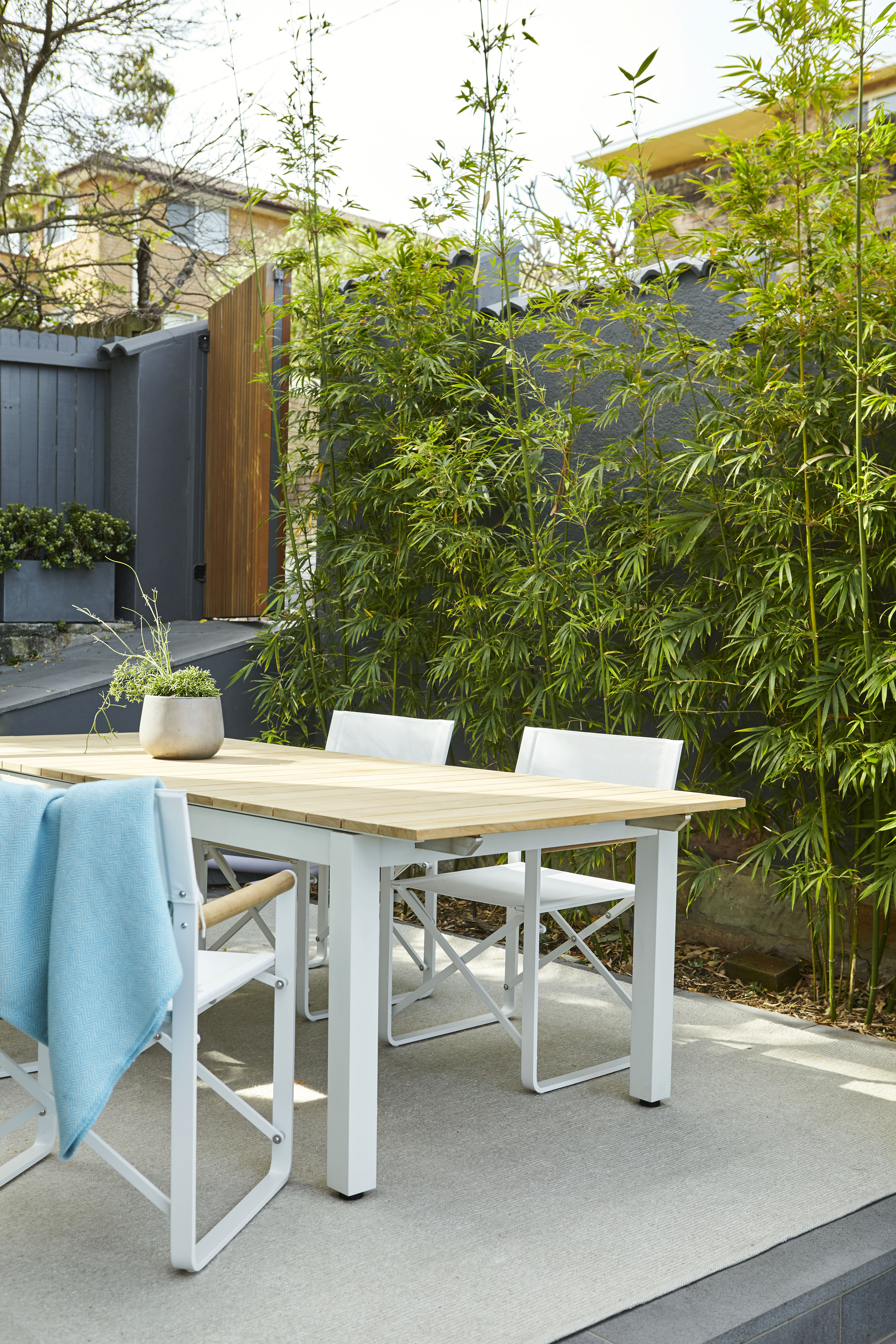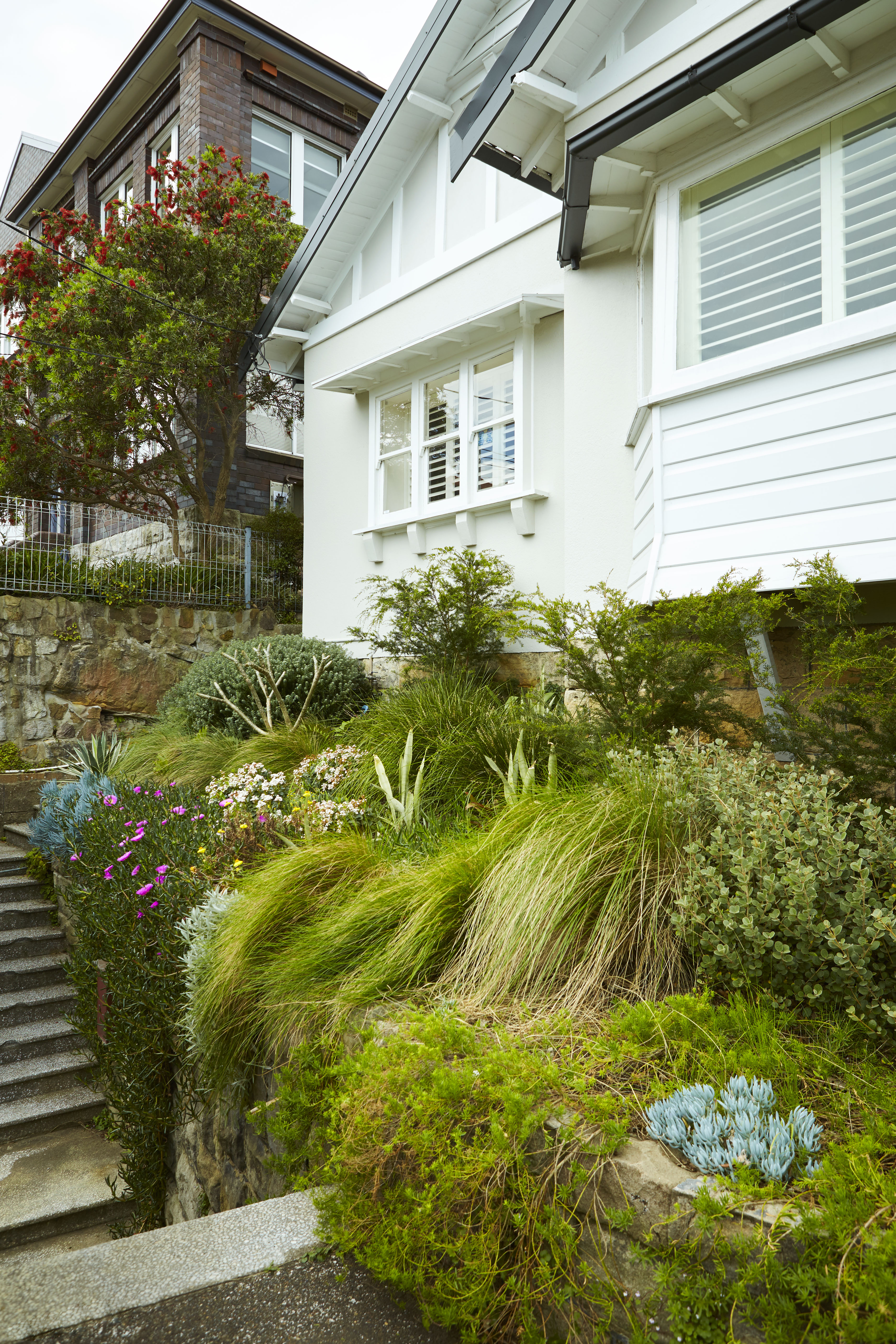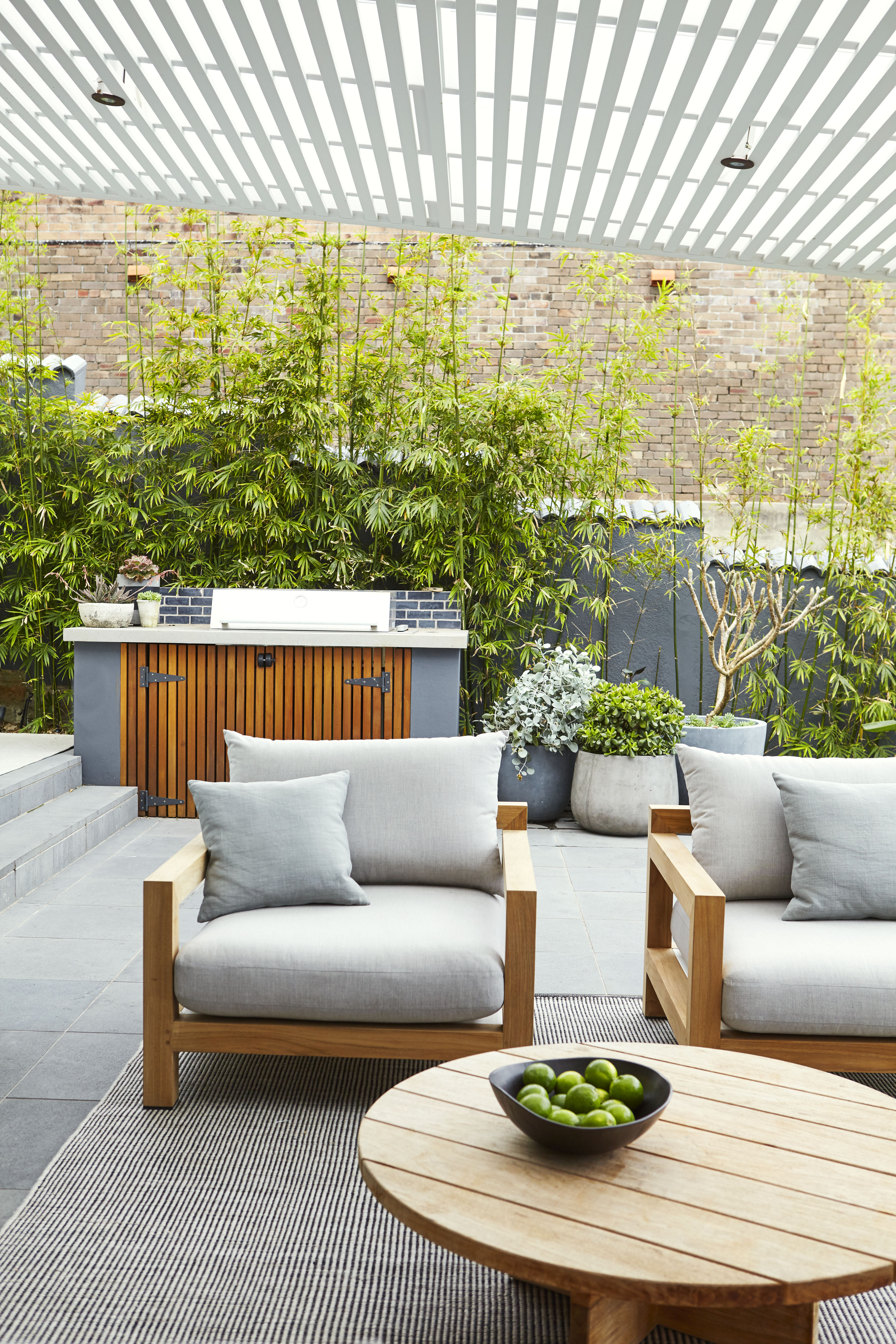 Nestled between the house and the bamboo hedge, the dining space feels nice and intimate. Hard surfaces were to be softened with vegetation, creating the sense of a private oasis. Planting along the street frontage was also to be refreshed to soften the front walls & create a much more inviting entry.