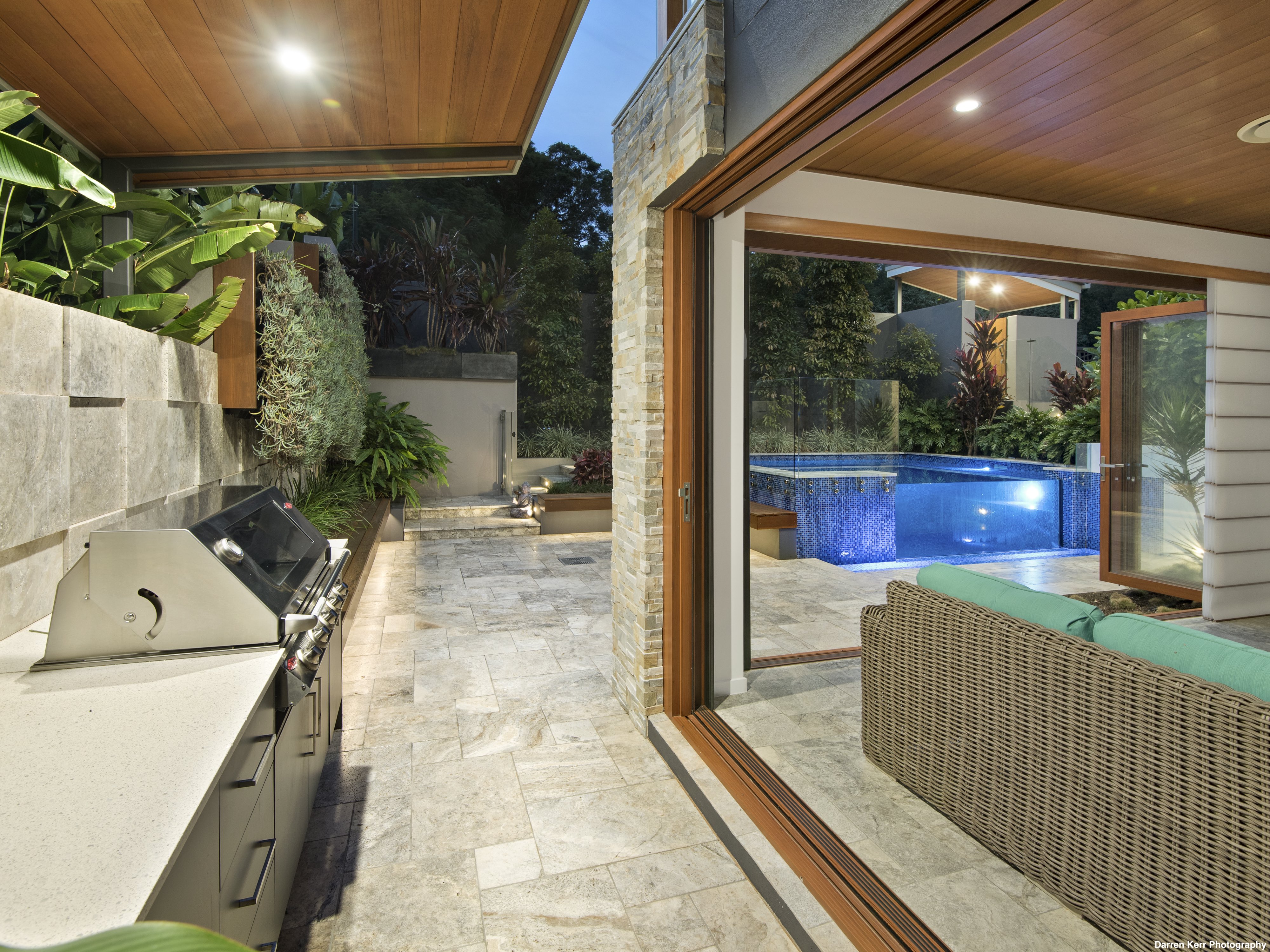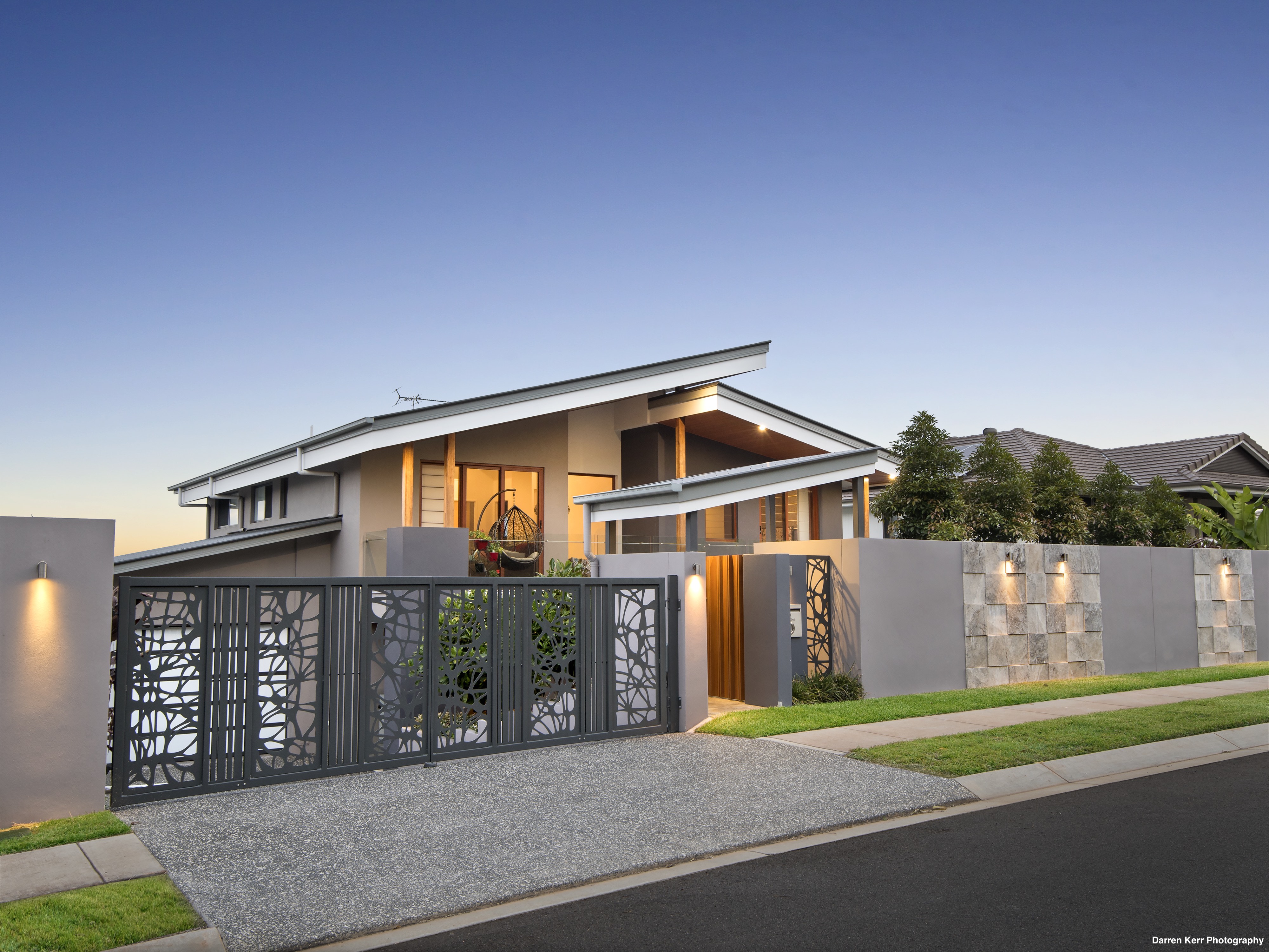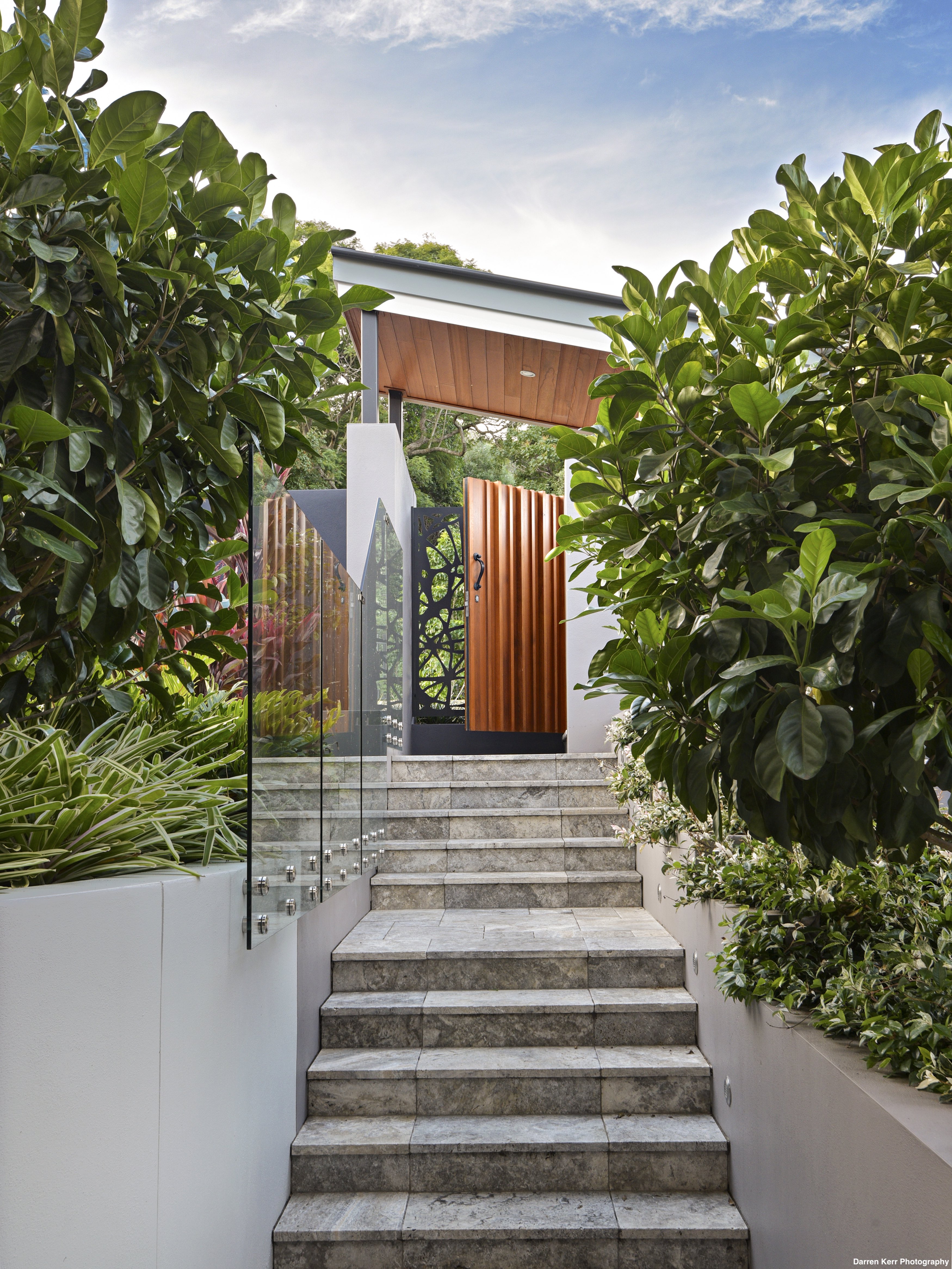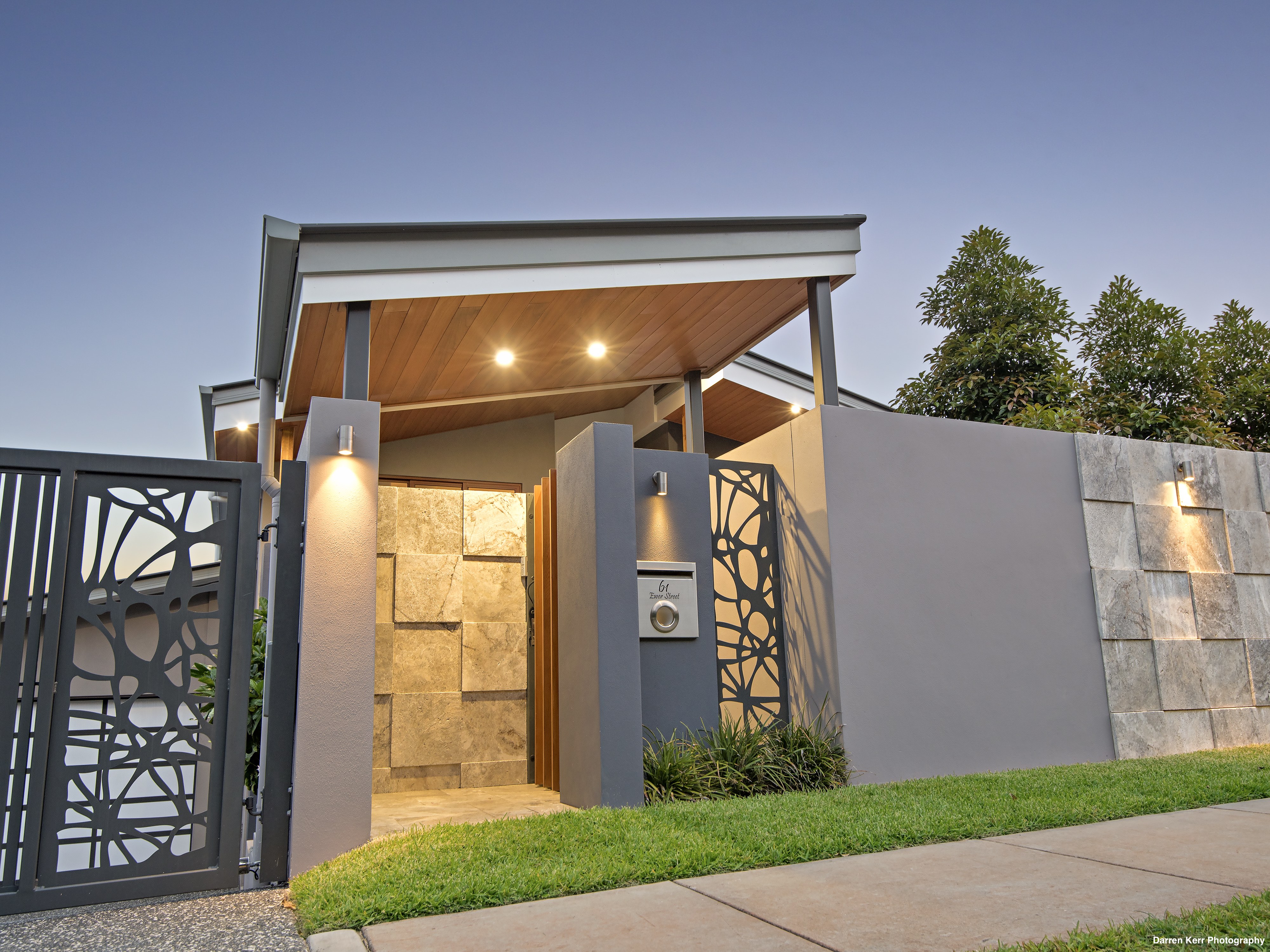 rear and an additional alfresco room at the front, which the client hoped could be used in conjunction with a pool and outdoor entertaining. In addition, they were seeking a formal pedestrian entry which along with driveway access to the garage was secure but provided a great entry statement for the property.