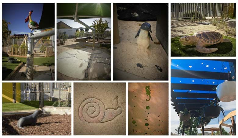 Create environments which invite open ended interactions, spontaneity, risk taking, exploration, and discovery all within a nature based environment. Names had been assigned to each of the age groups to help with identification and sense of belonging. With an ocean based theme, jelly fish, seals, seahorse etc. provided a fun design element to tap into and opportunity to bring the namesakes to physical form in the play spaces.