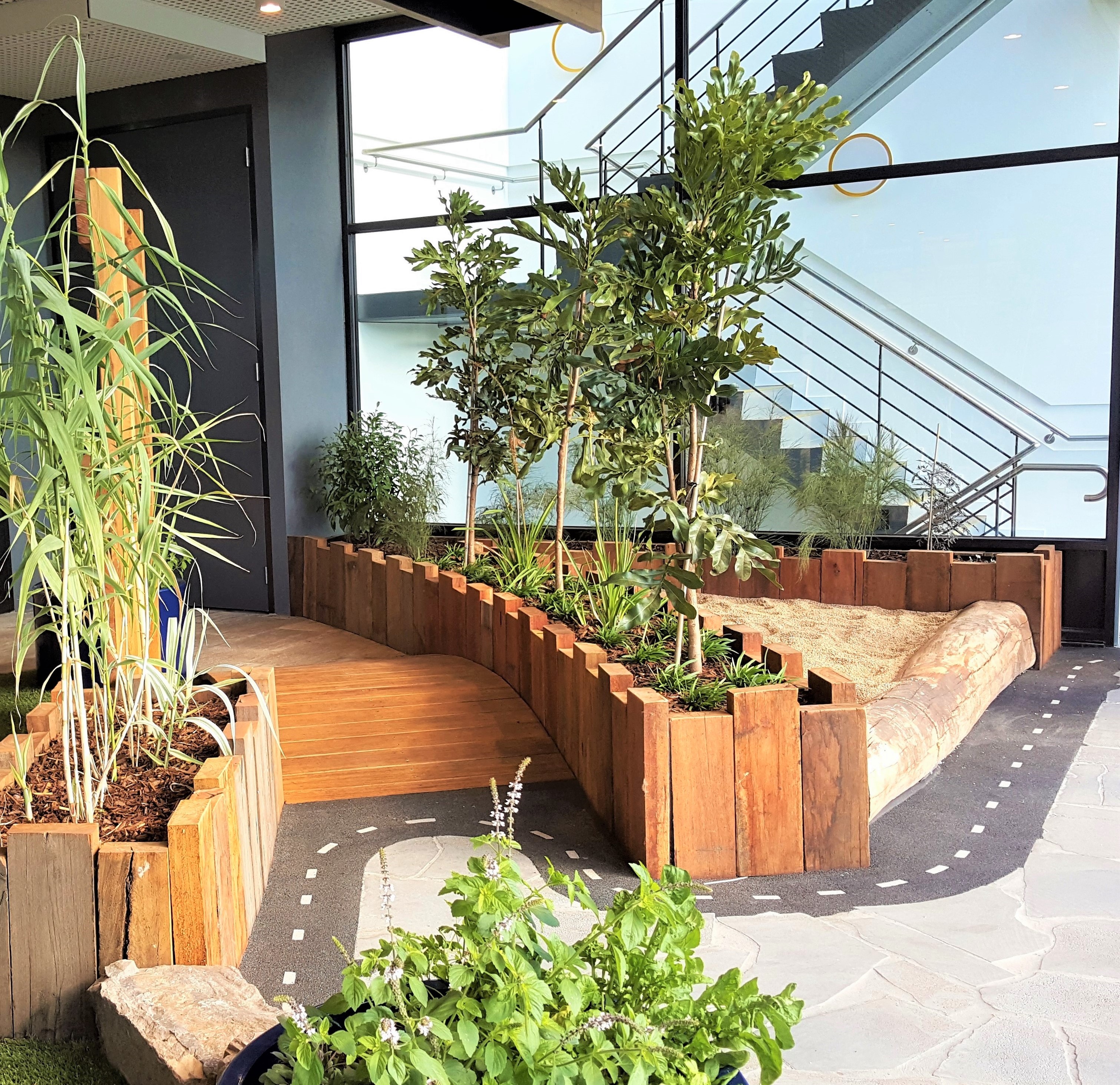 surface level changes to add interest such as step-down wet play areas, bridges/mounds, and sandpits accessible via steps, beach entries and decking. Raised planters serve to section off areas for safety (designated swing area) and use.
