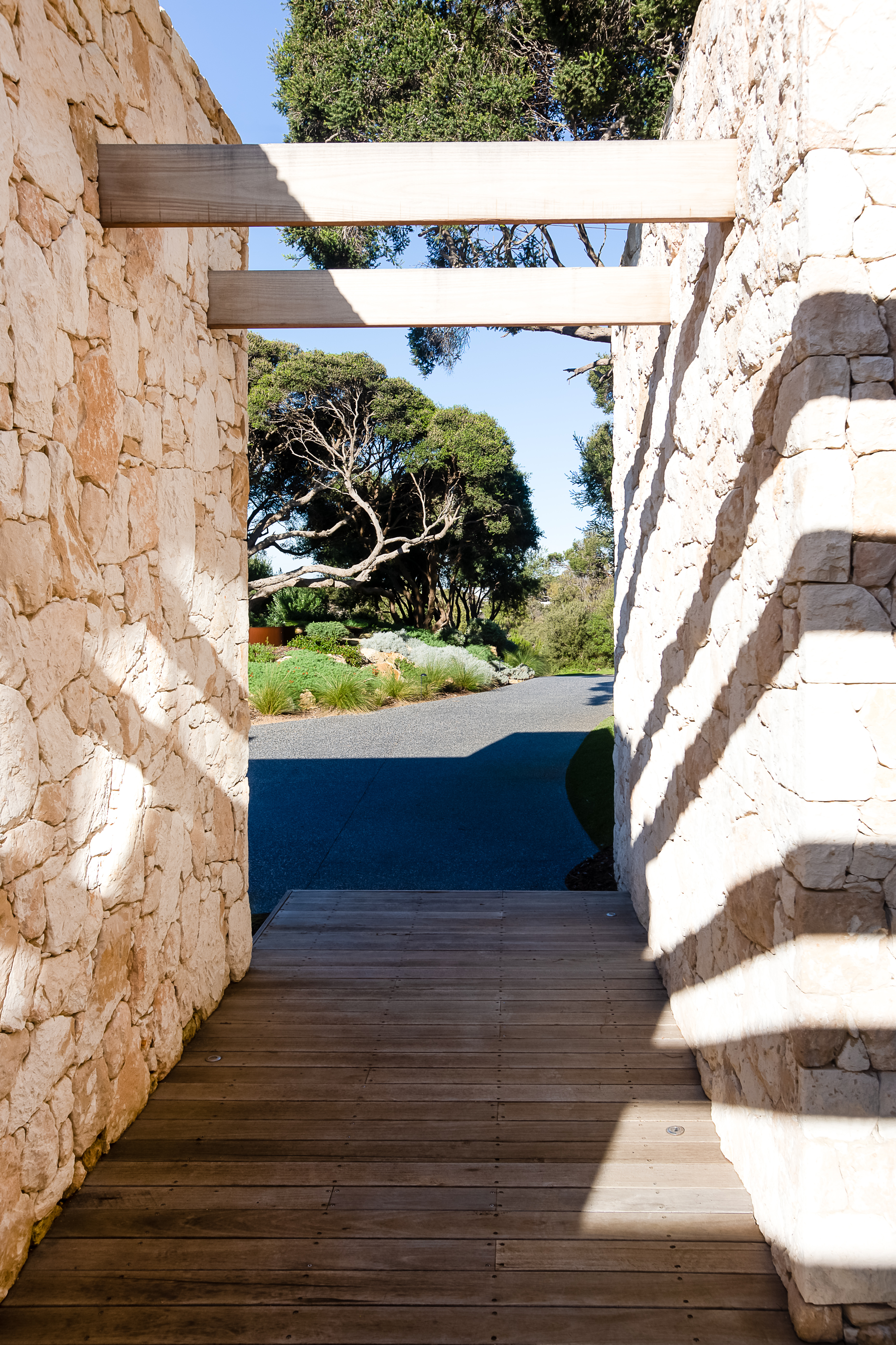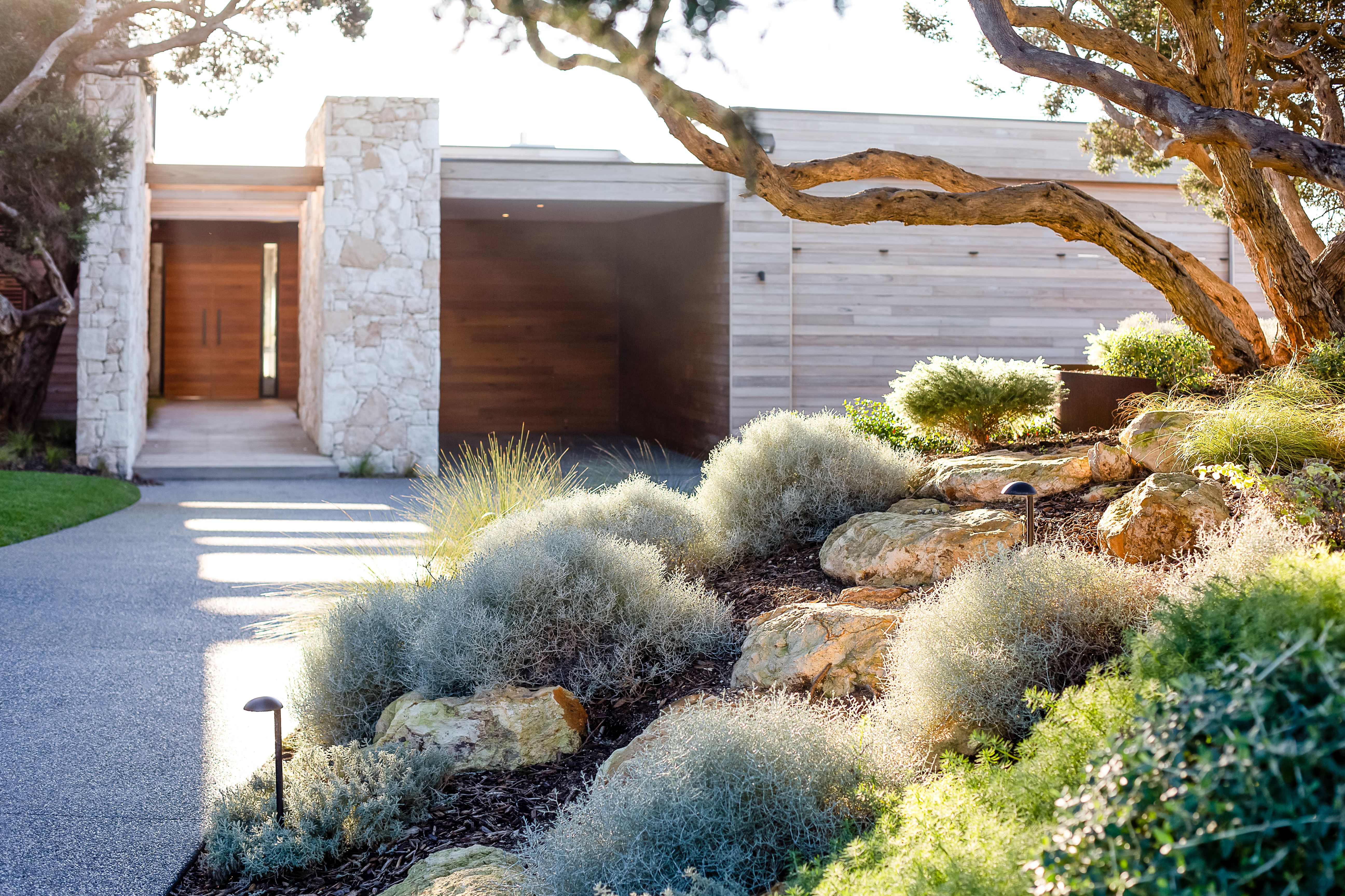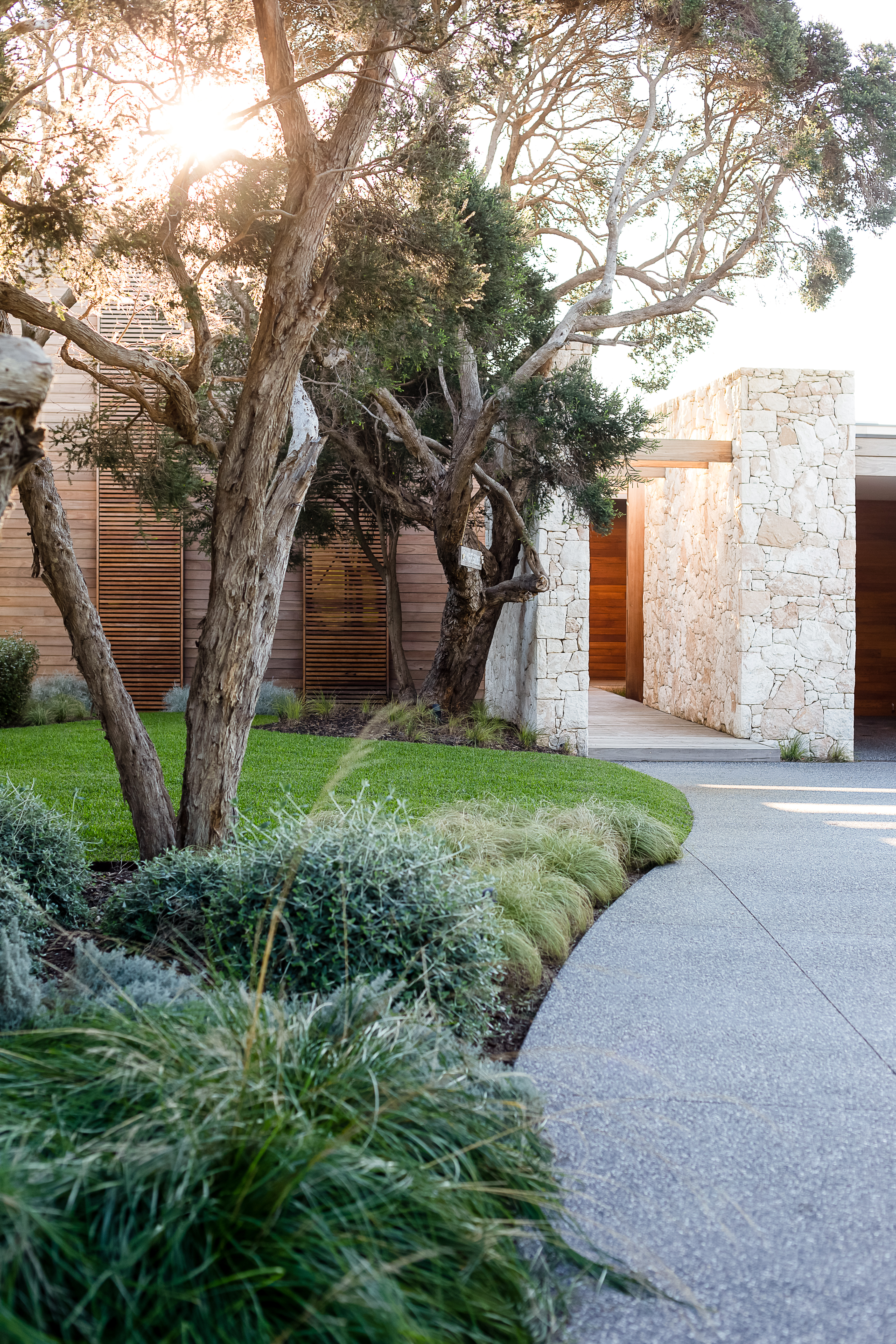 At the front the driveway weaved in and around the stunning tea tree and feature Moonah trees. Curved corten planters, local limestone boulders and plantings soften the steep bank.