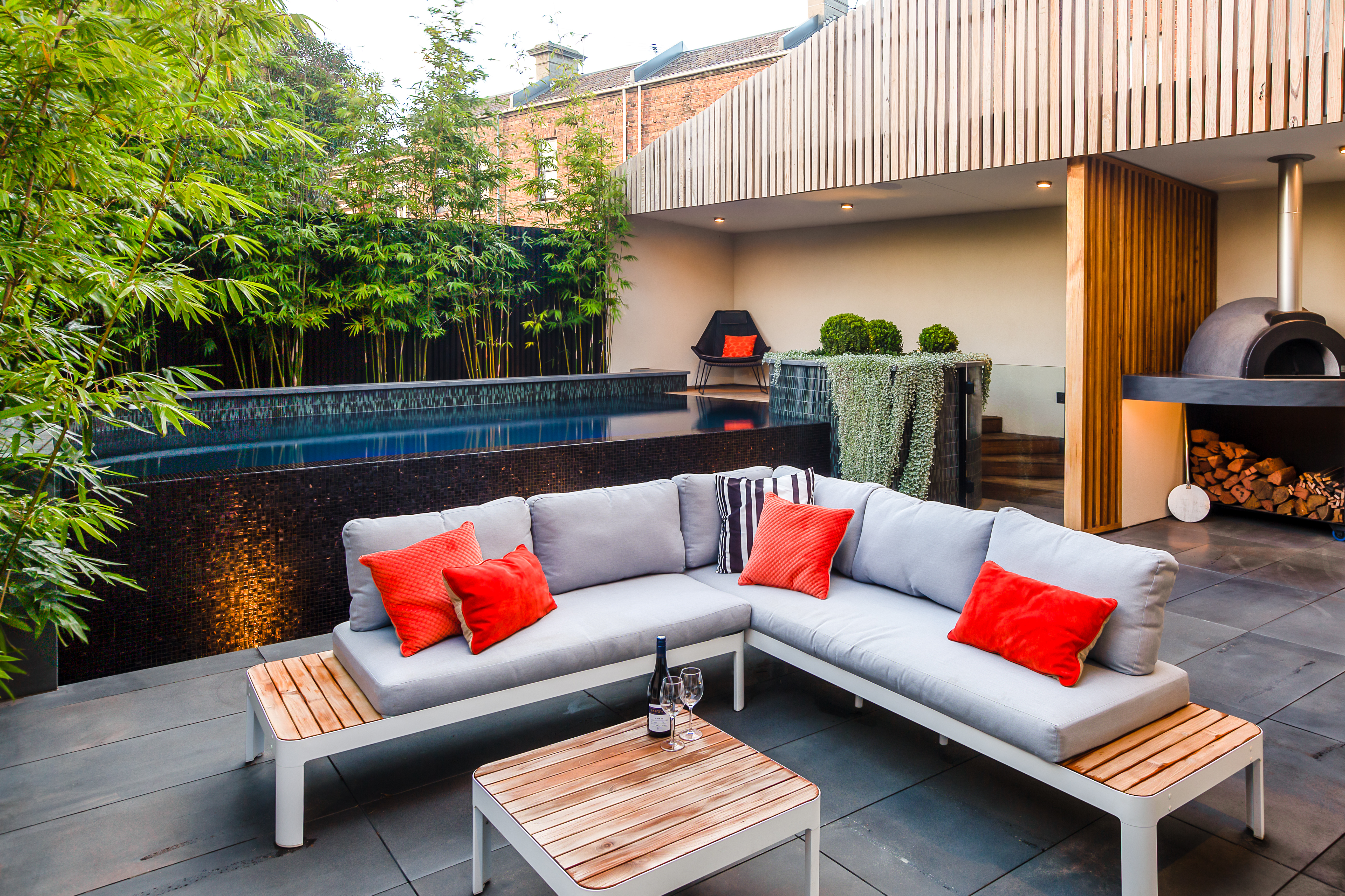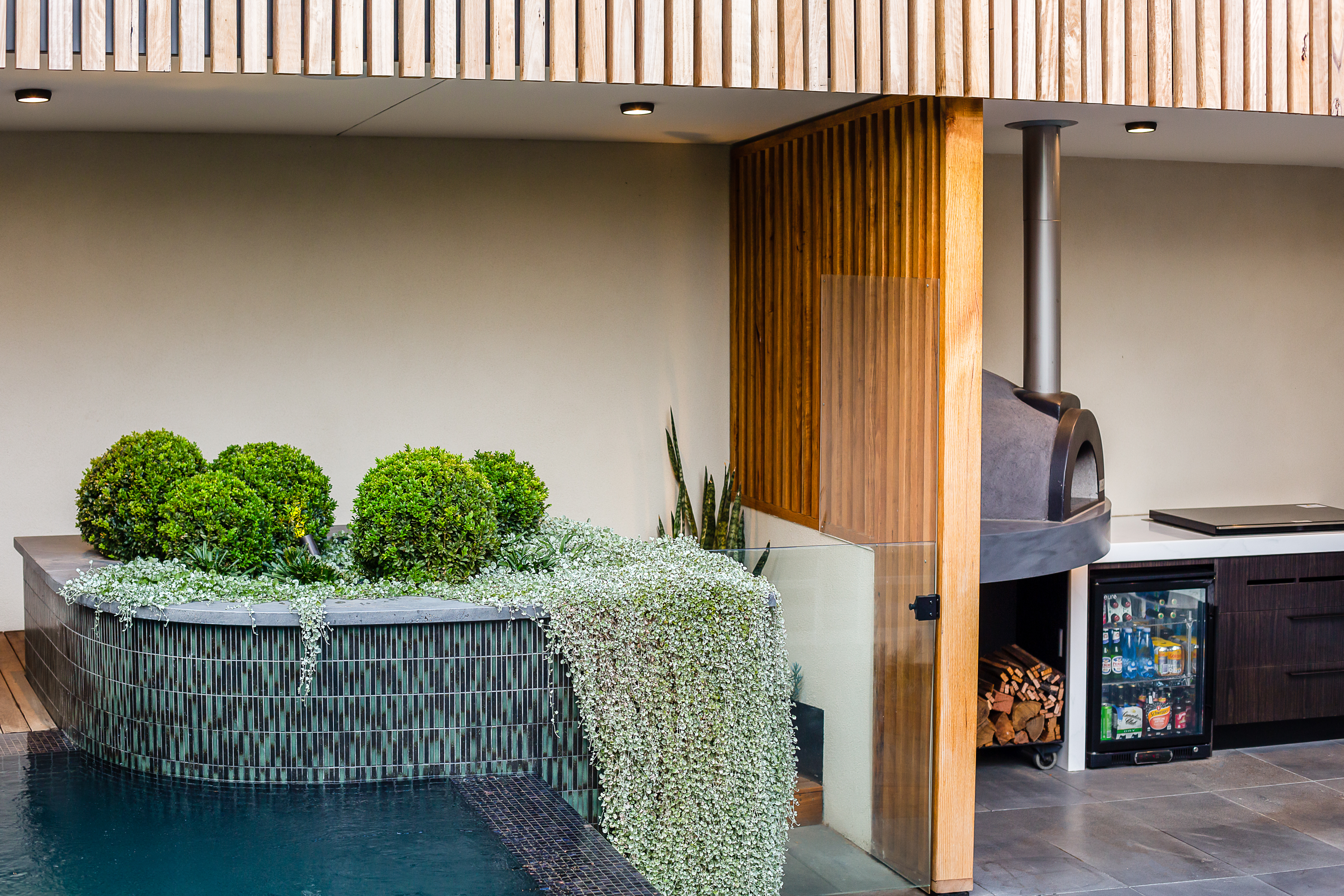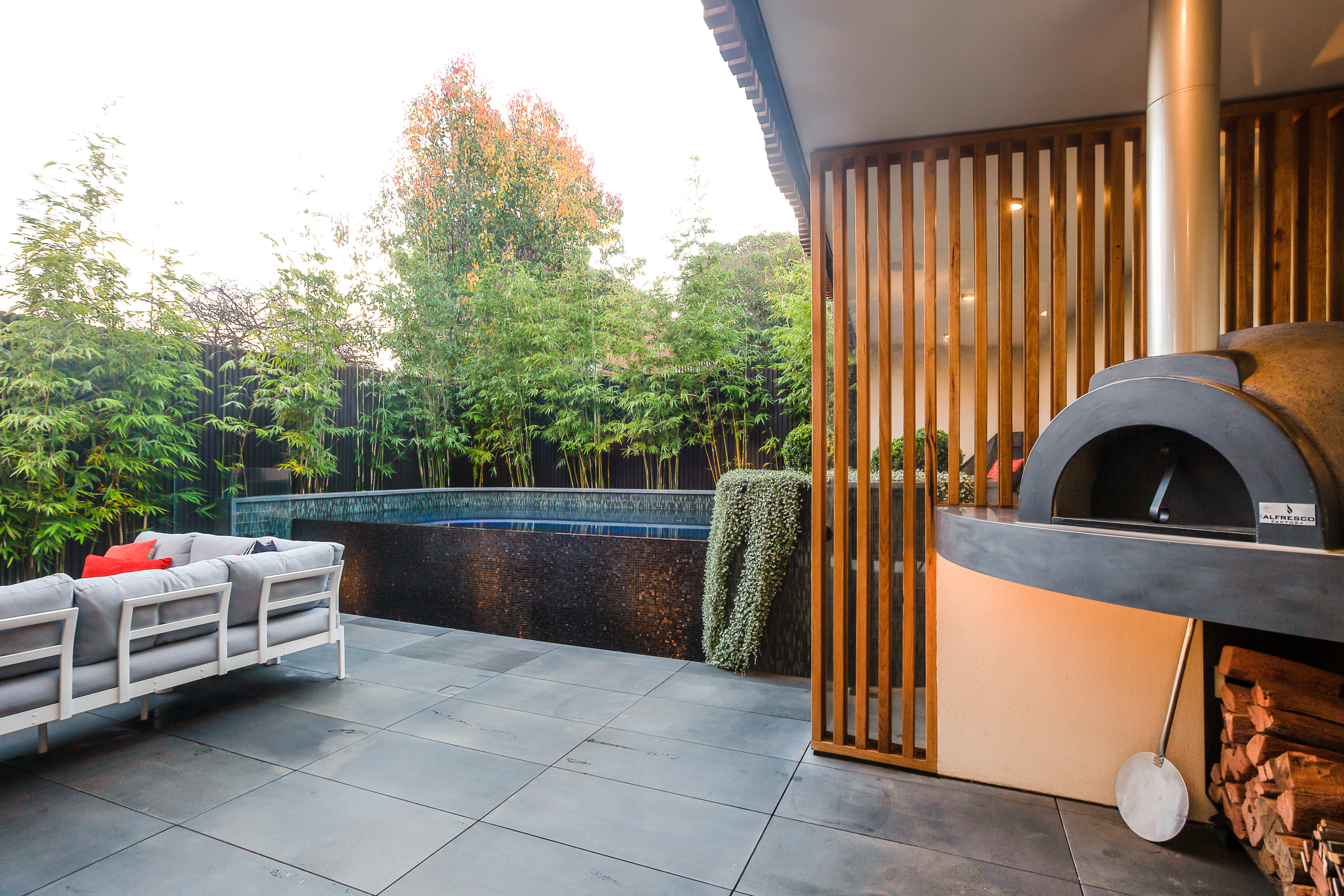 The clients brief was a pool, a large shaded area to create cover and privacy, an outdoor kitchen and pizza oven, fire place, space to entertain, space to simply relax and a direct connection to the internal spaces, interior design and homes architecture. All this had to work in and around strict planning and building guidelines to ensure compliance with all local and state laws.