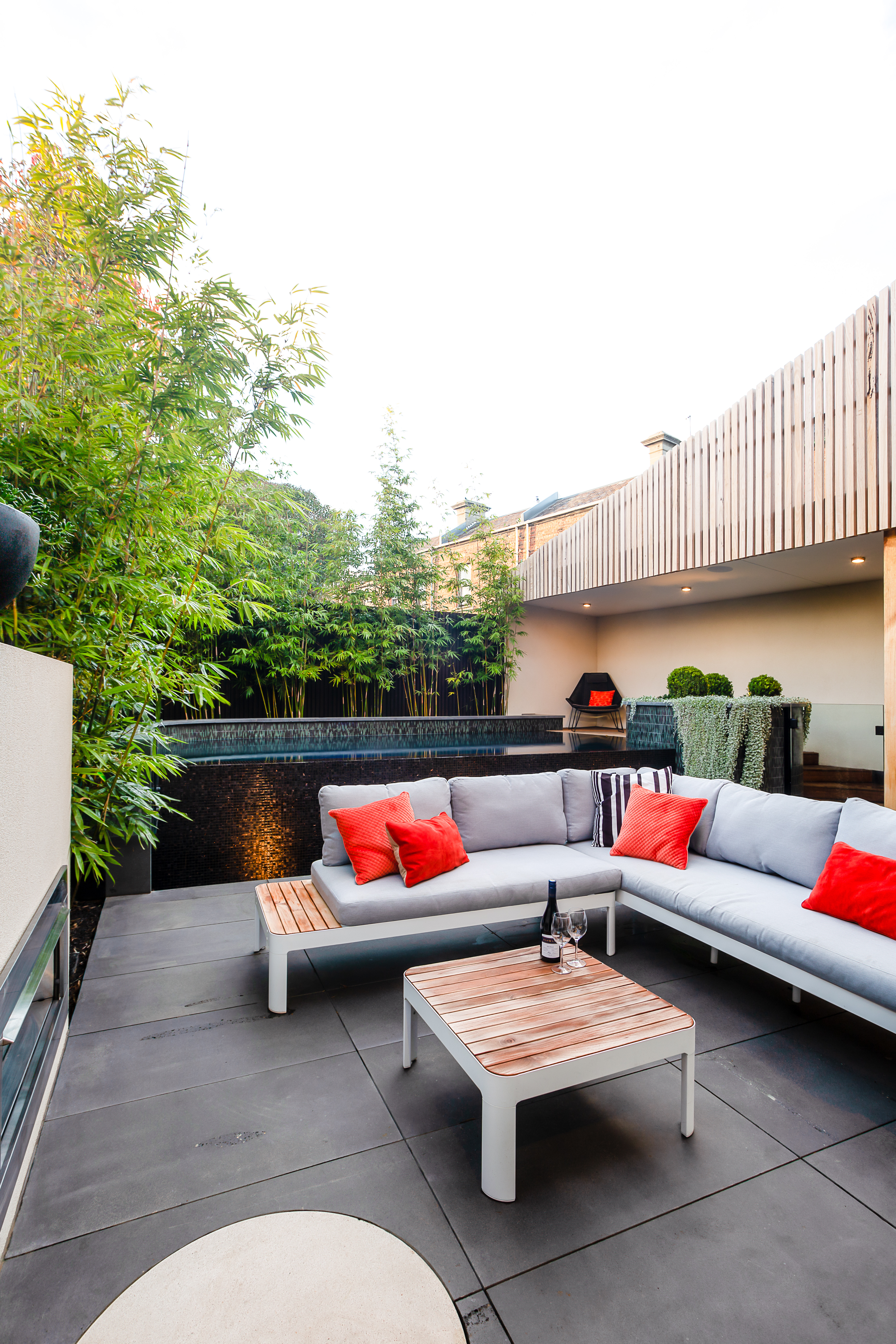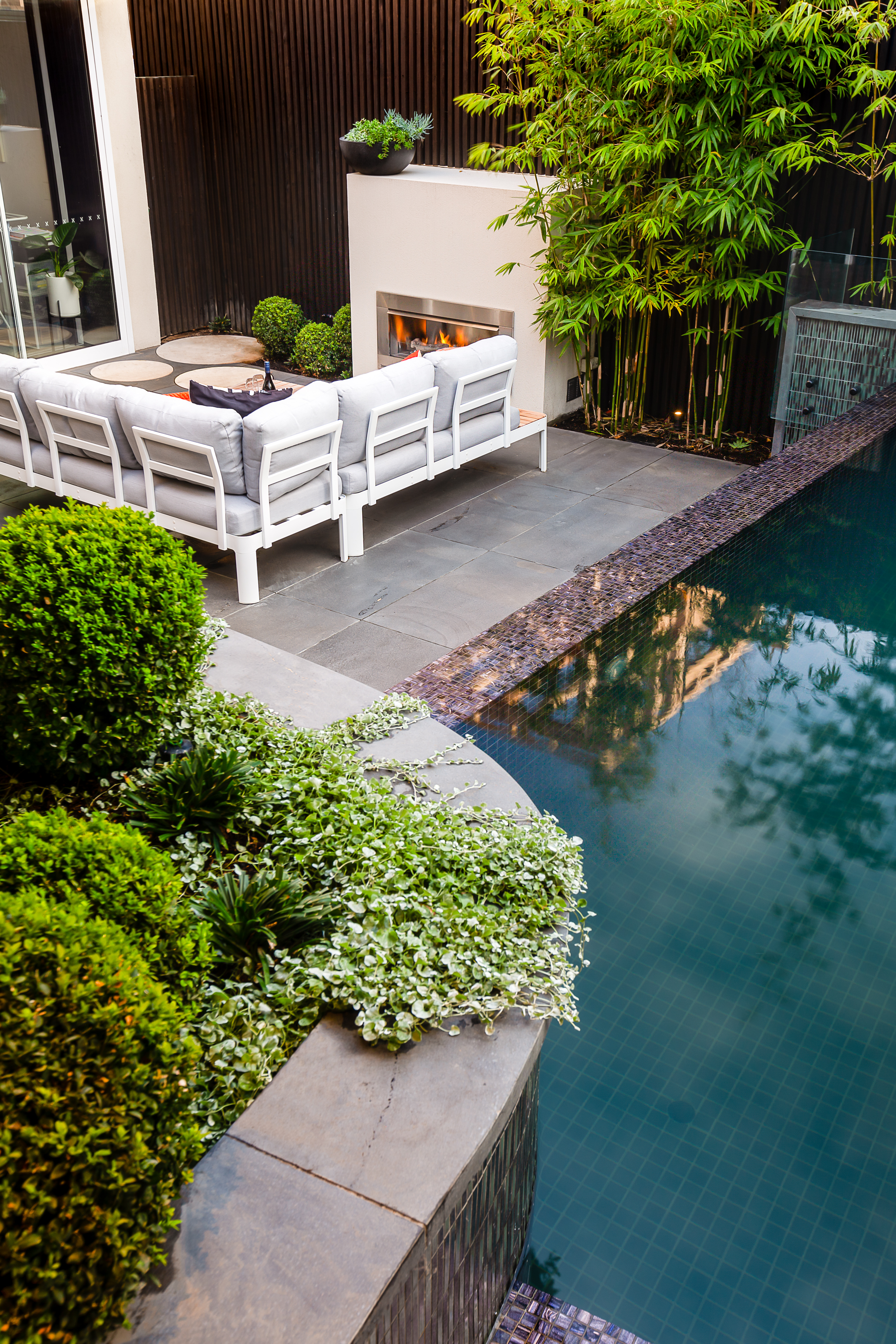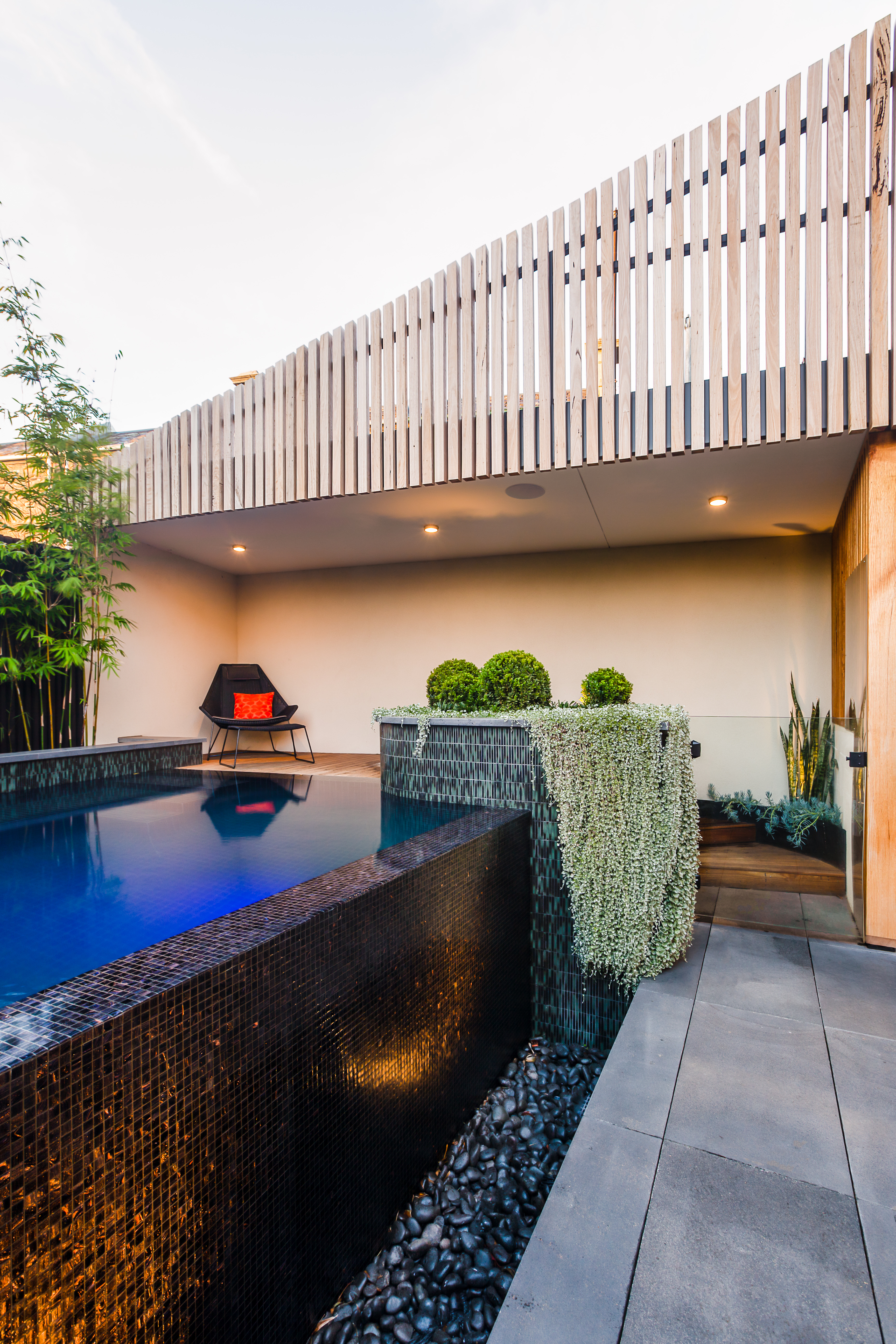 The clients brief was a pool, a large shaded area to create cover and privacy, an outdoor kitchen and pizza oven, fire place, space to entertain, space to simply relax and a direct connection to the internal spaces, interior design and homes architecture. All this had to work in and around strict planning and building guidelines to ensure compliance with all local and state laws.