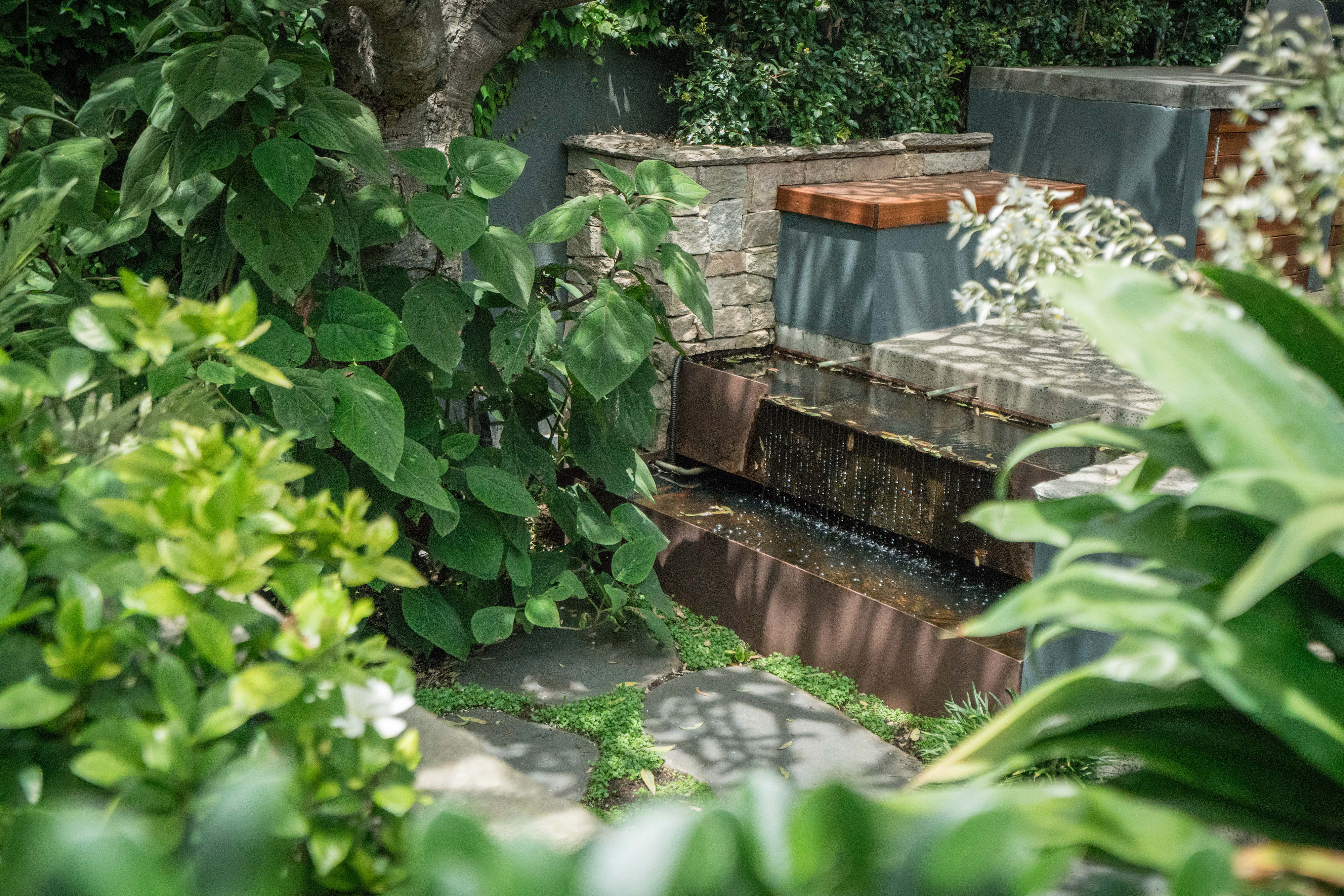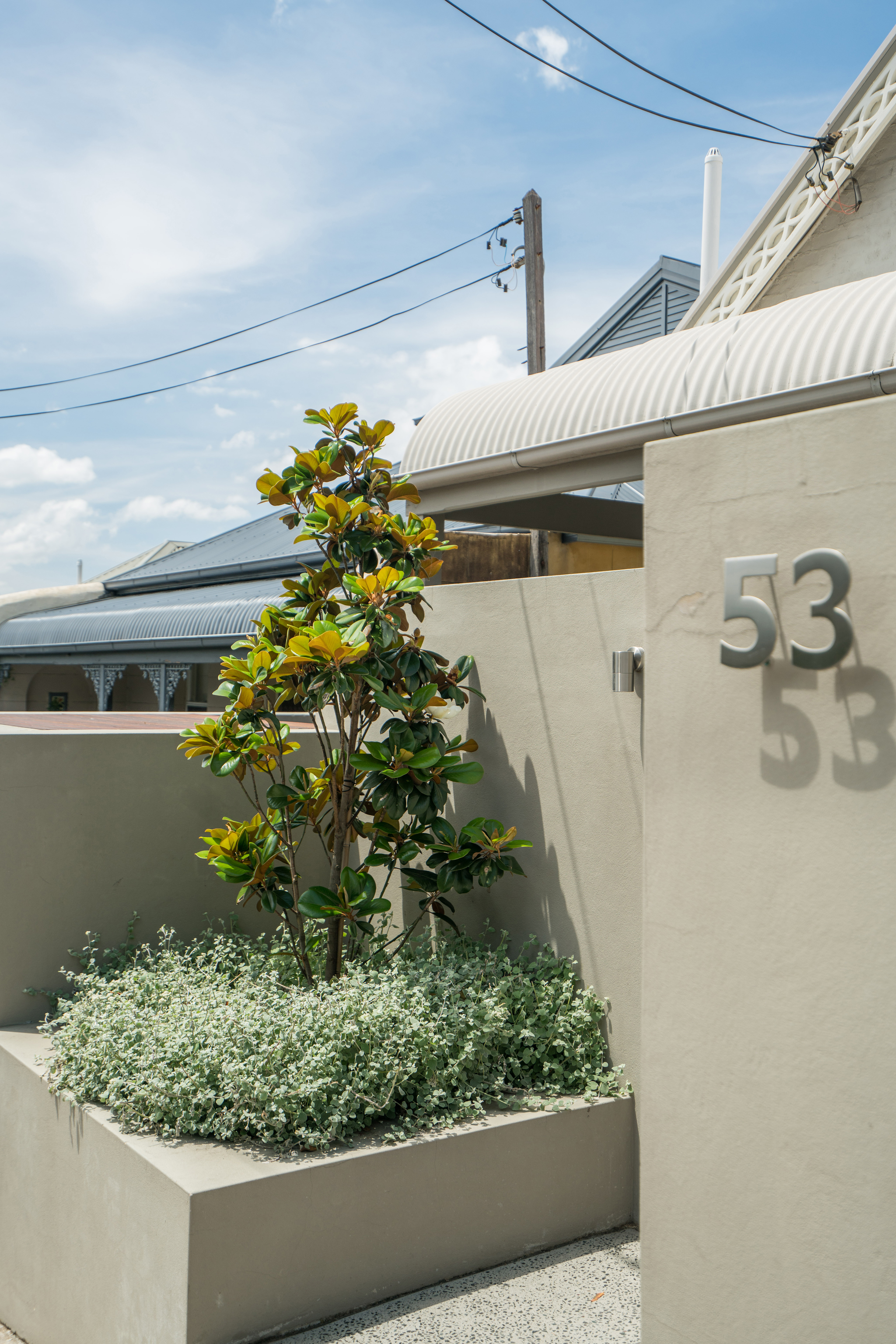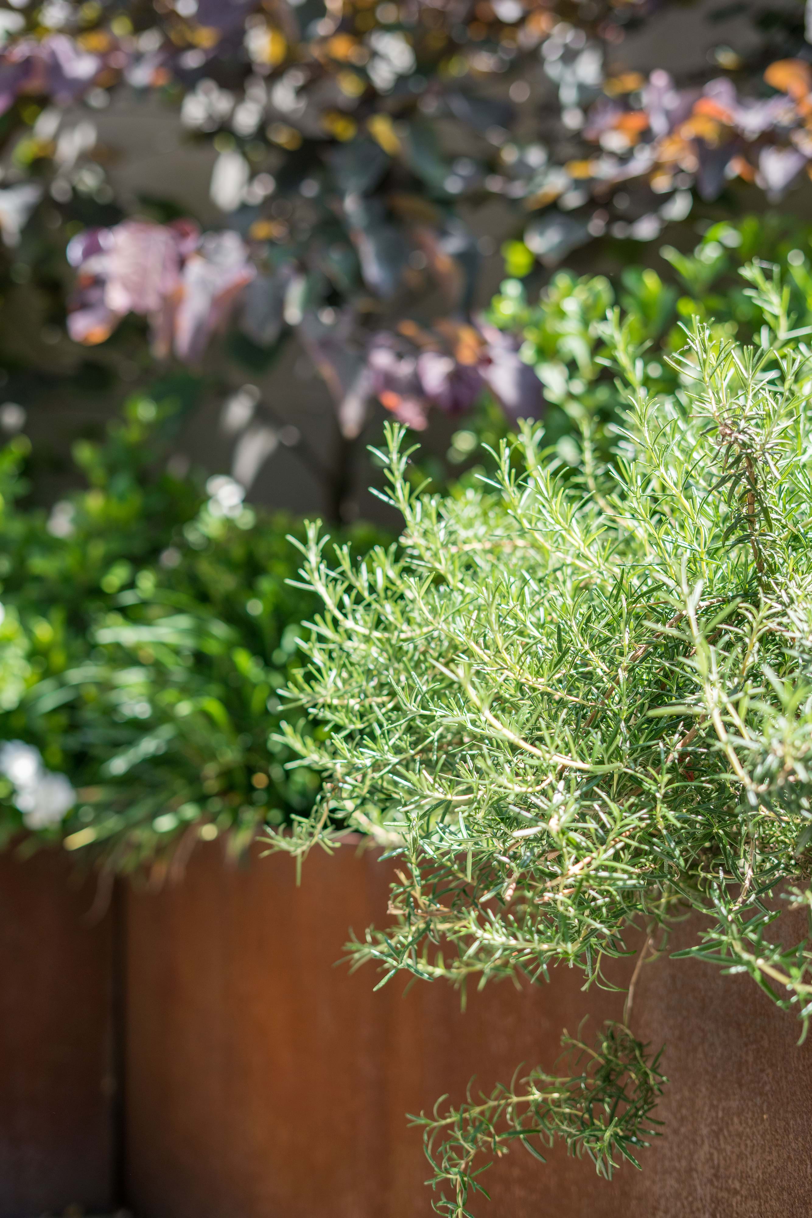 The large corten steel planter troughs in the front courtyard provide a dark contrast to the polished concrete paving, and provides a dark background for the lush green trailing plantings to stand out.