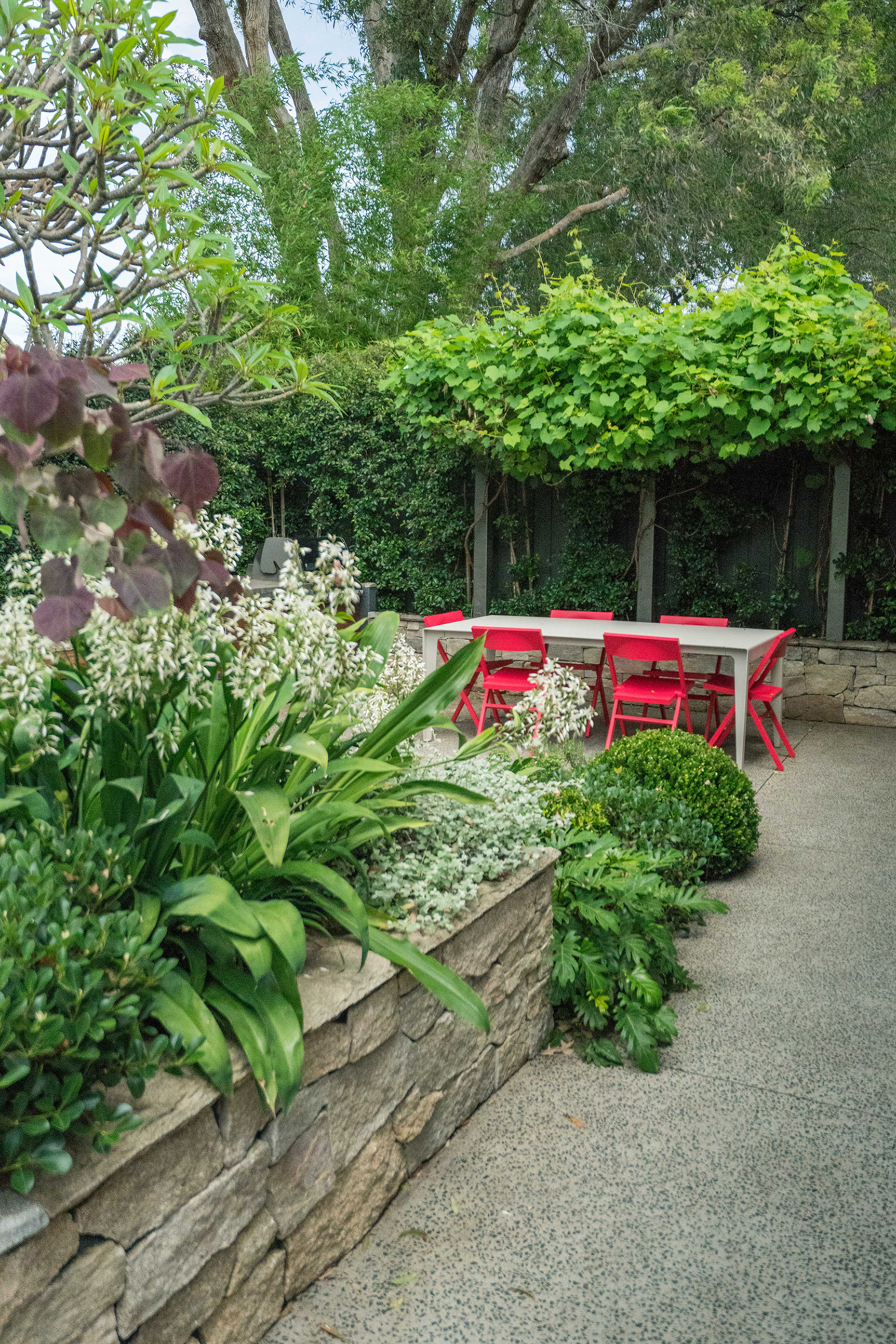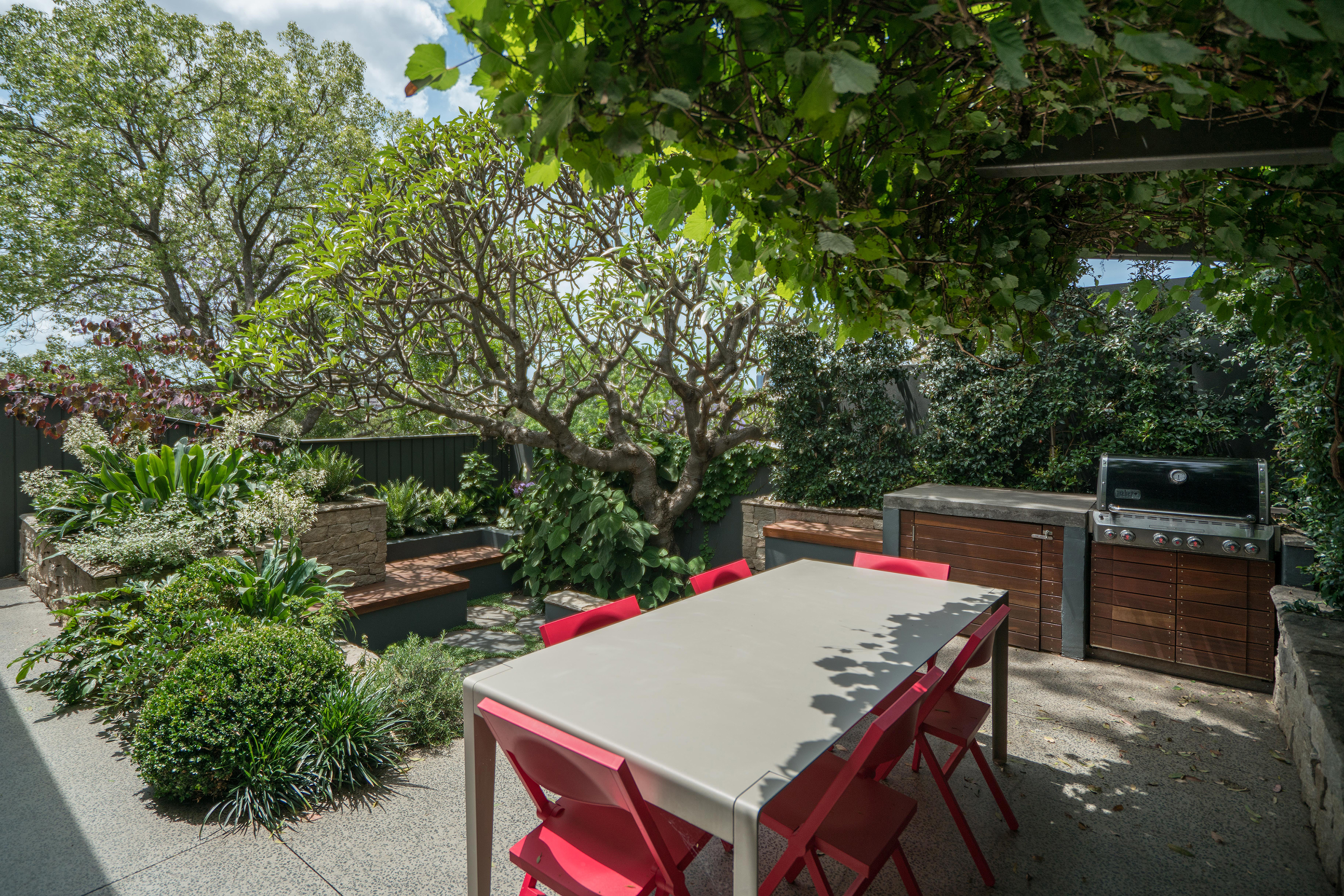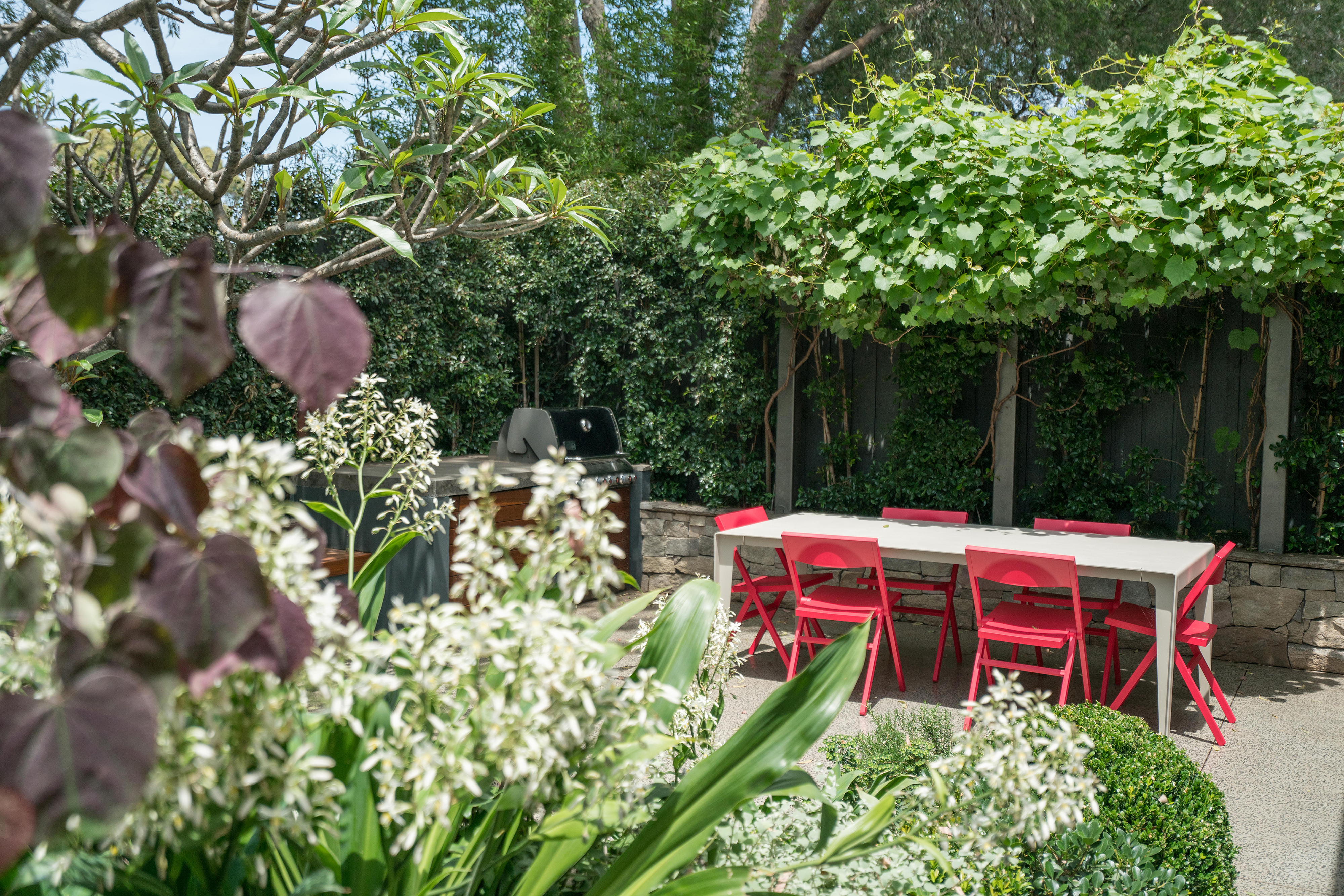 The client wished to create a small sophisticated entertaining area, to include a dining space, outdoor cooking and a connected lounging area.