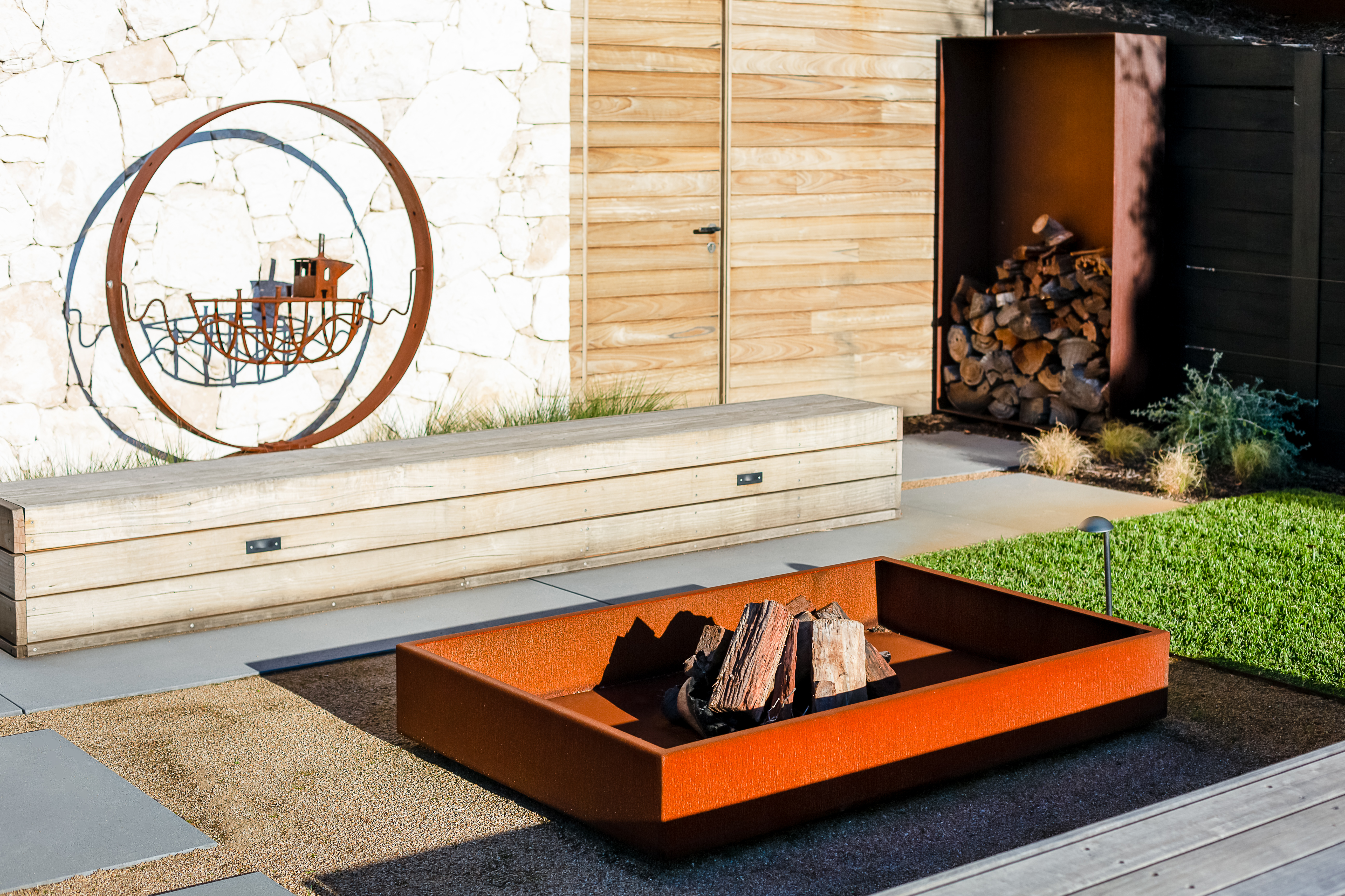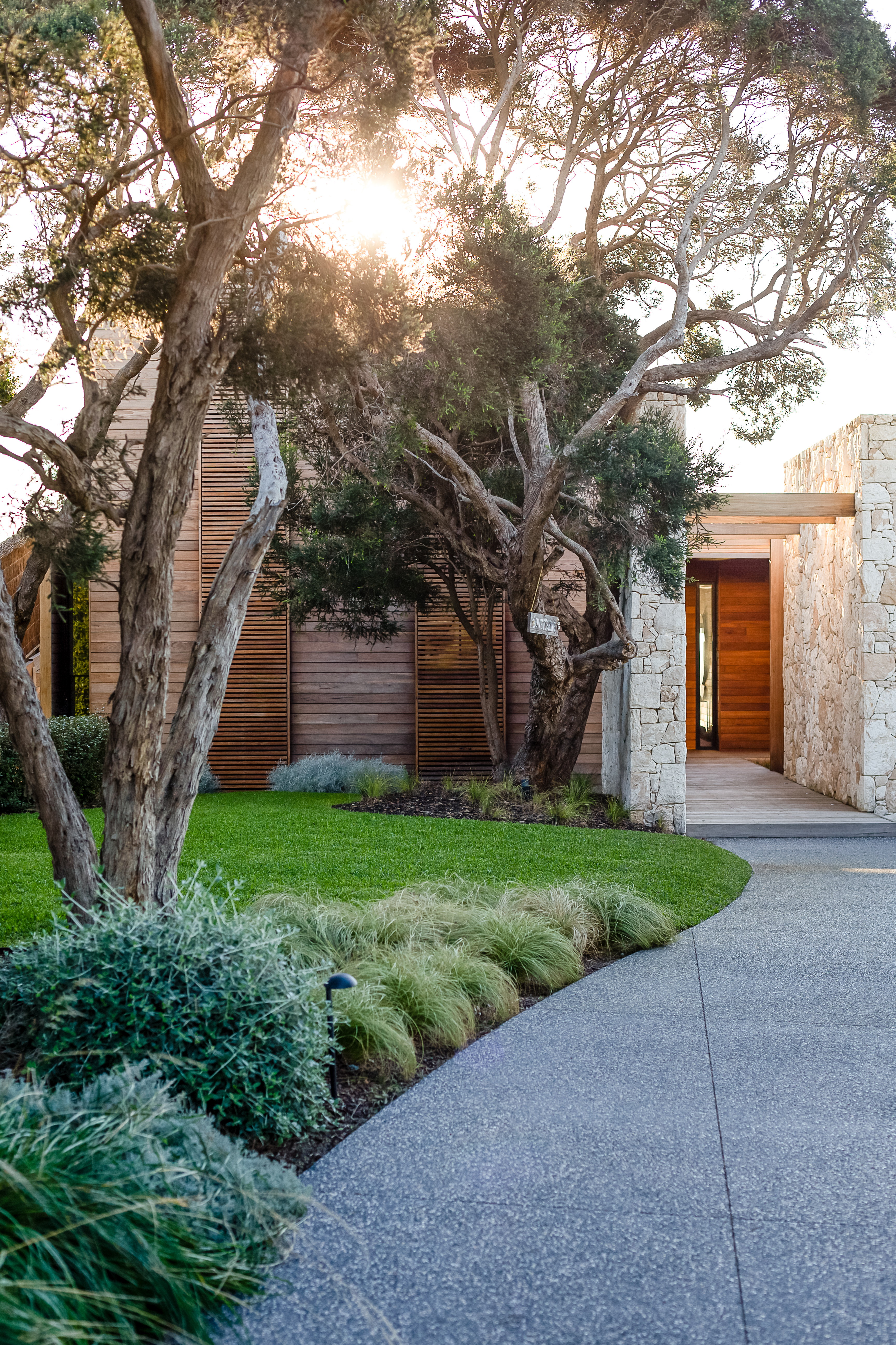 At the front the driveway weaved in and around the stunning tea tree and feature Moonah trees. Curved corten planters, local limestone boulders and plantings soften the steep bank.
