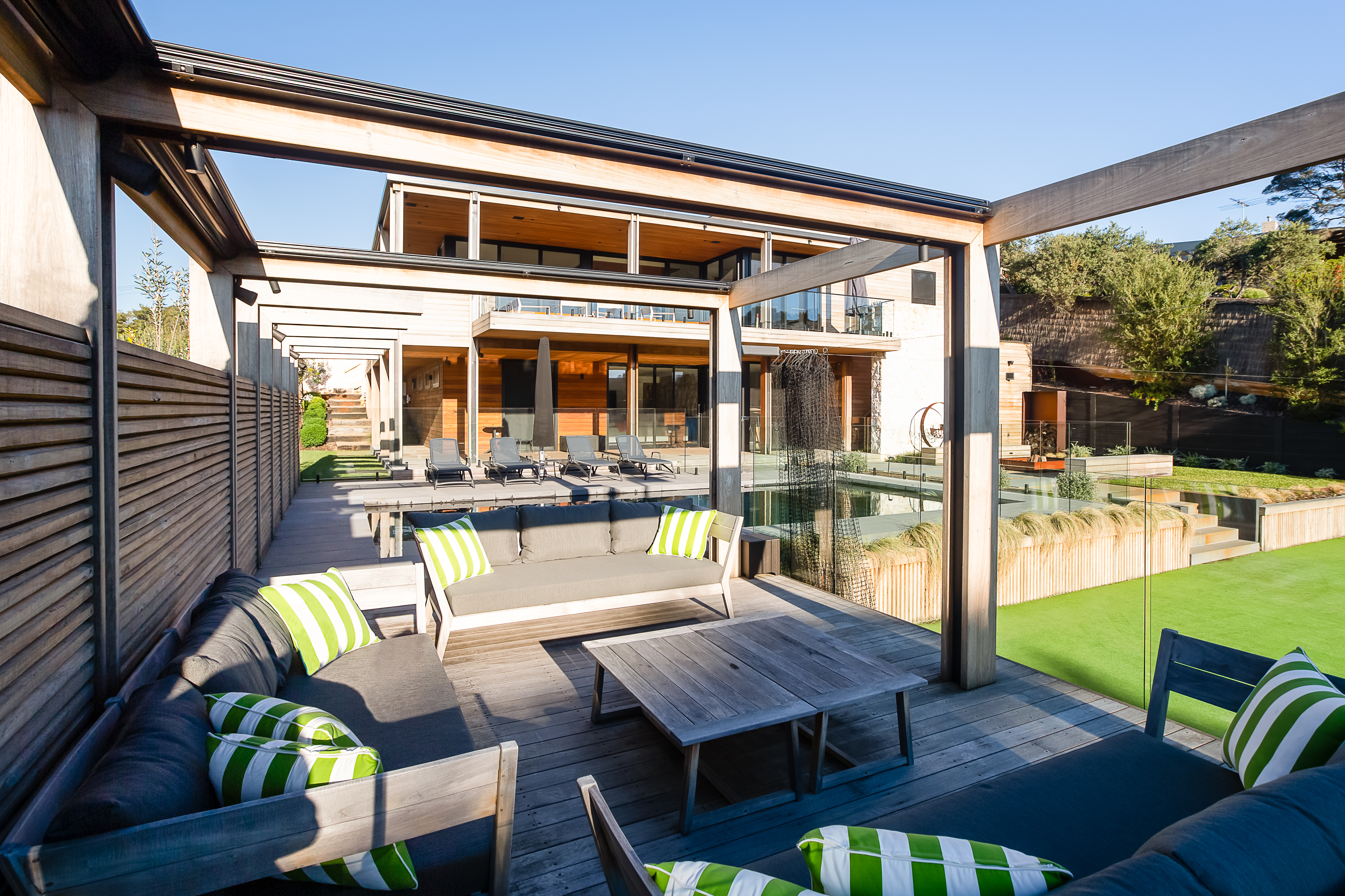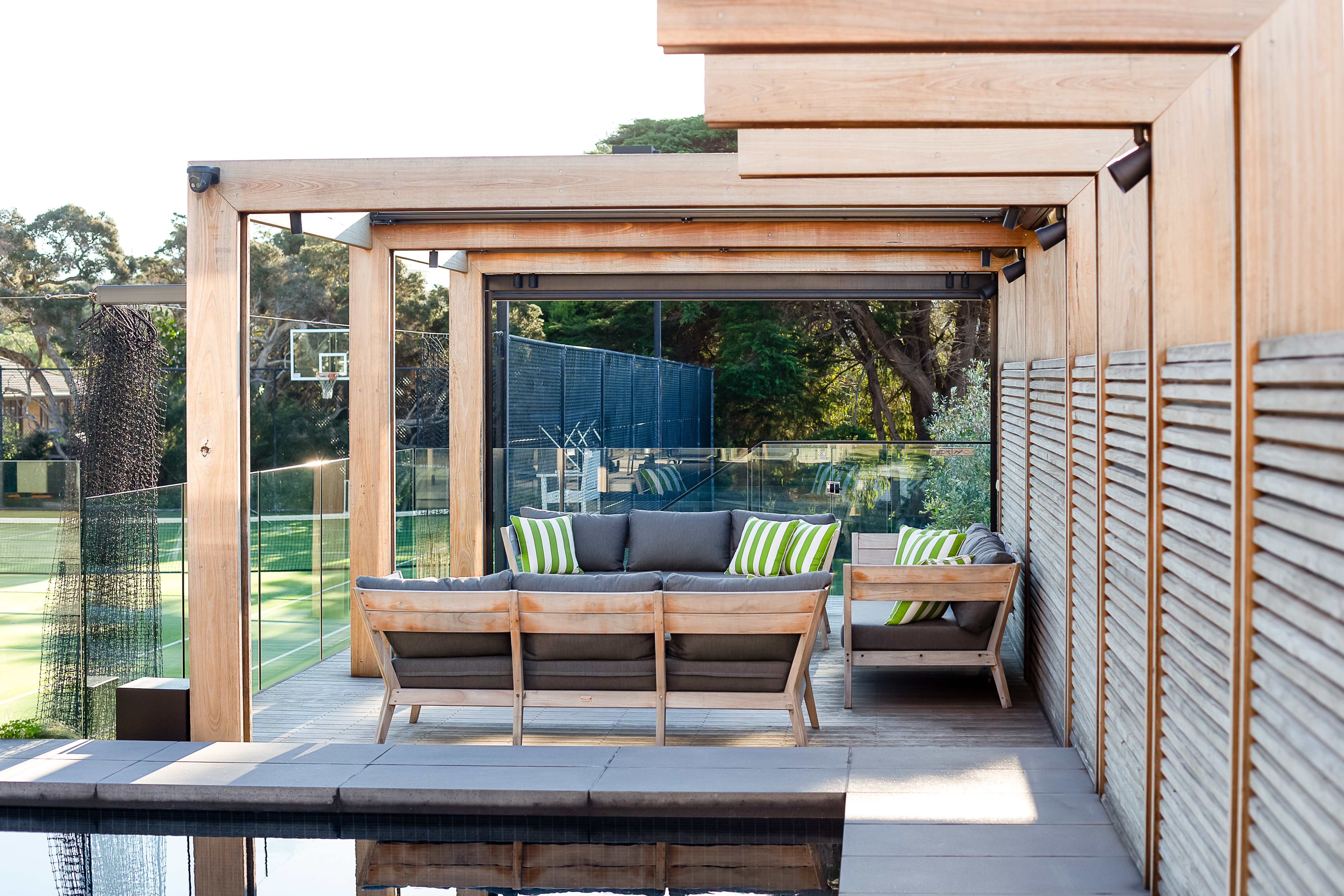 The arbors and the sitting deck service all areas including the the tennis court, trampoline and the pool areas and have built in shade awnings throughout for flexible shade options. Privacy was created using cantilevered arbors and a privacy screen.