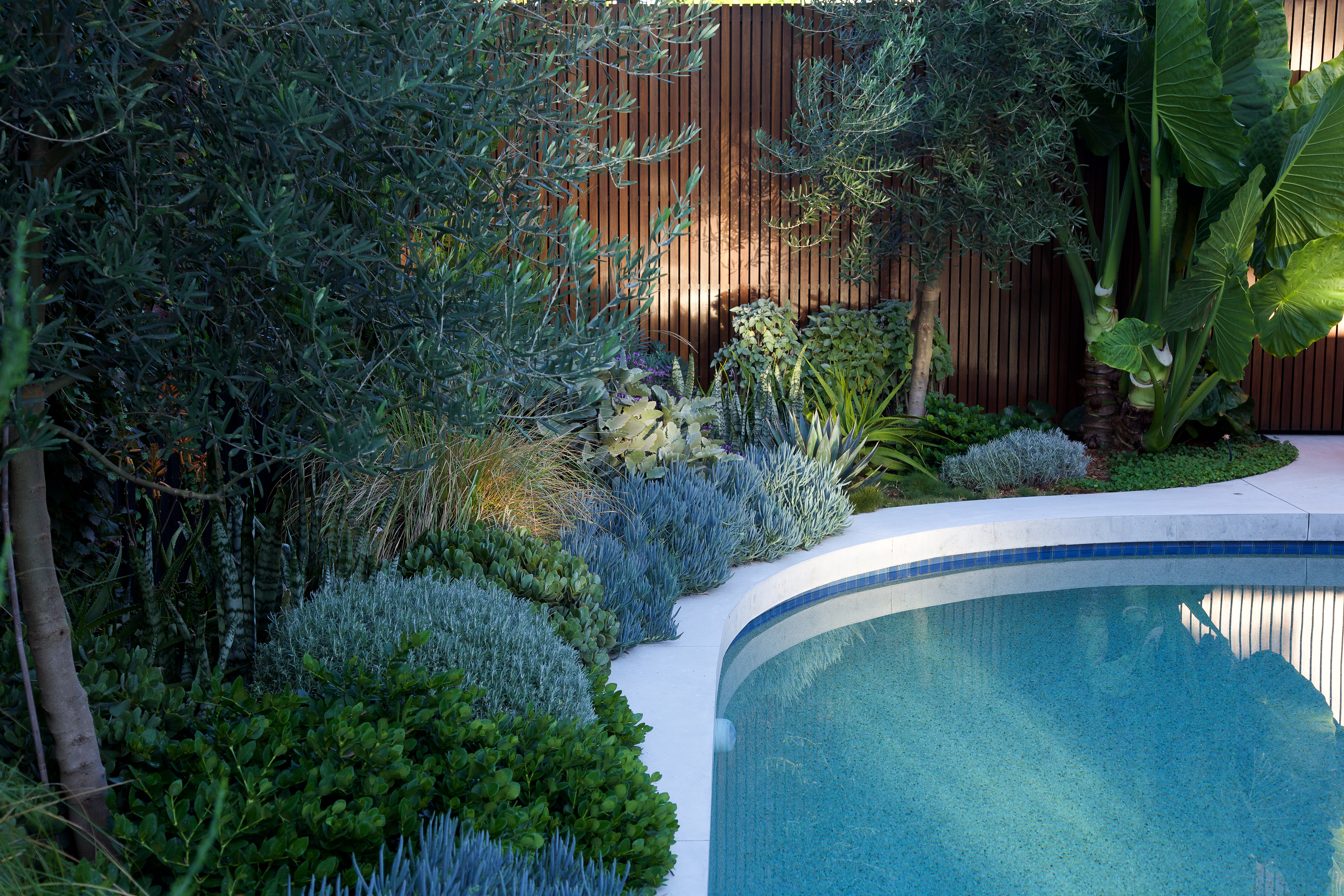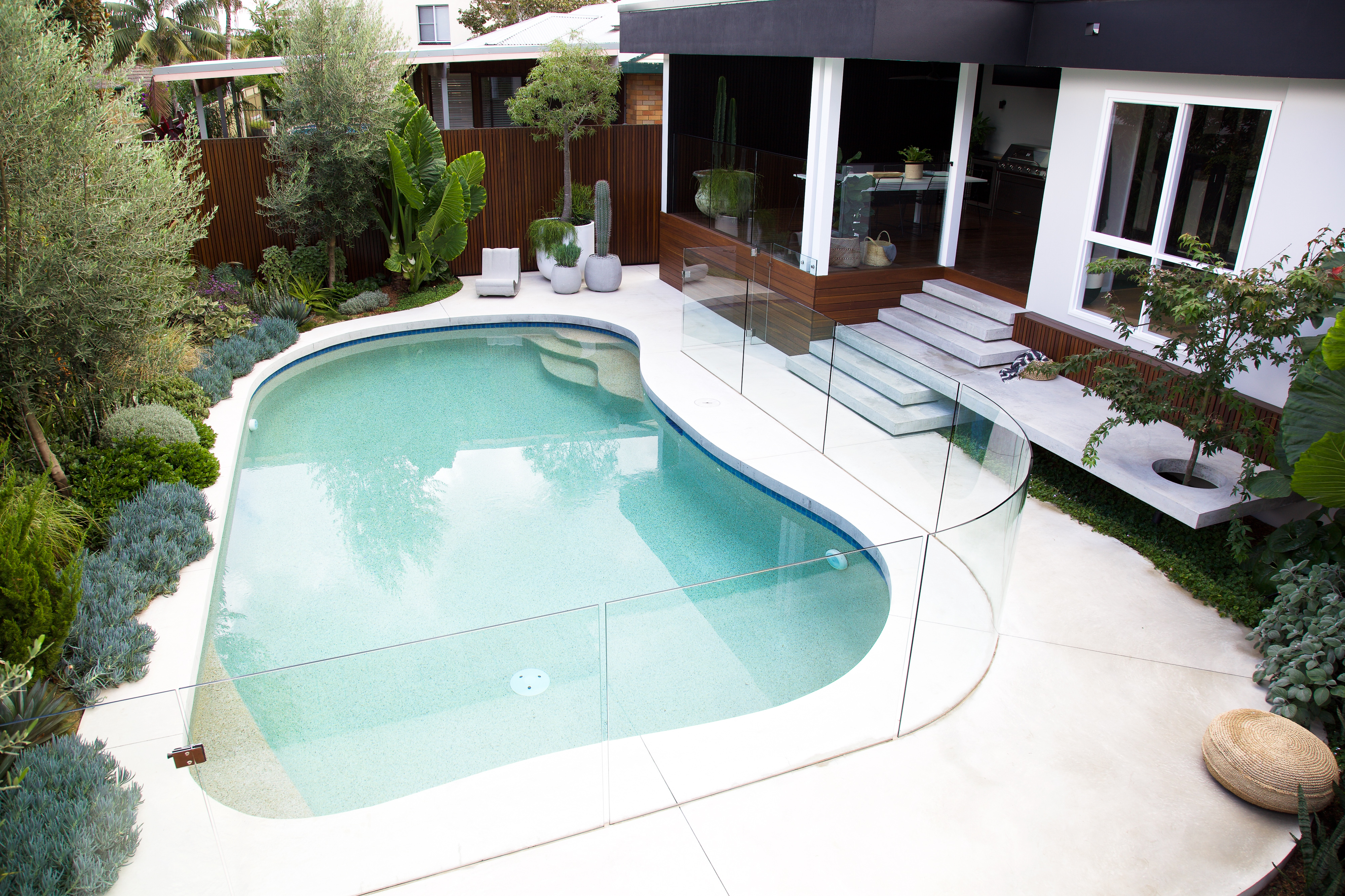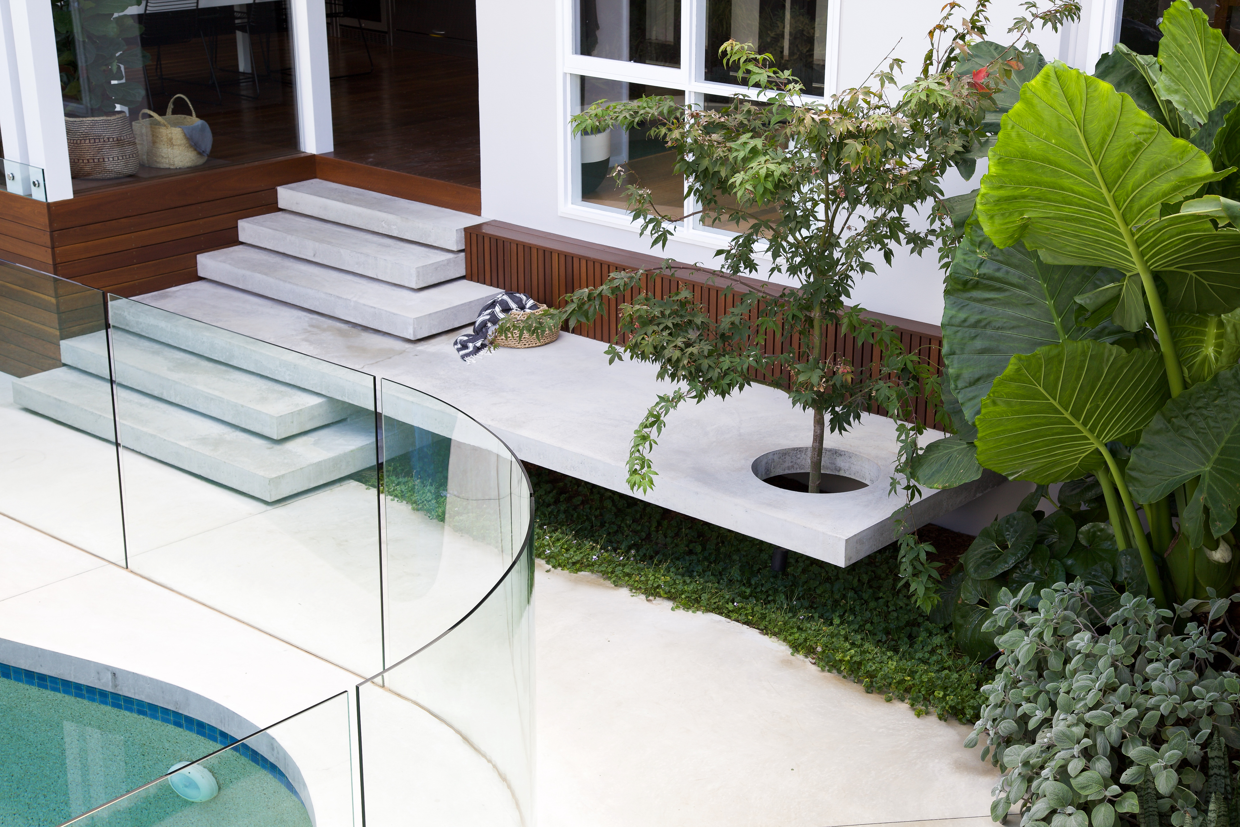 In the back garden a large floating pontoon slab provides a cool casual retreat out of the sun closely located near the pool entry. A curved glass pool fence reduces the impact of pool safety requirements within the back garden space.
