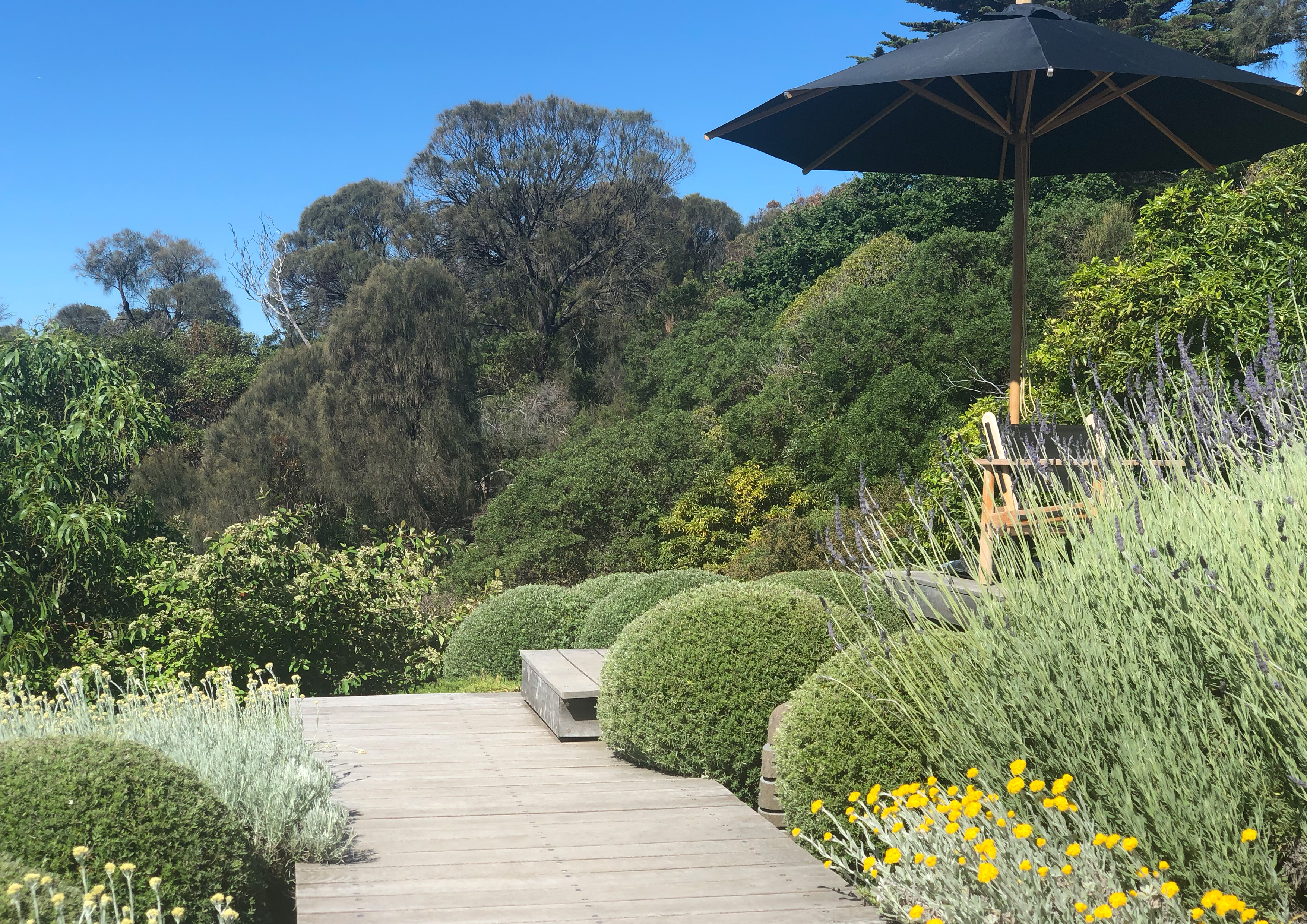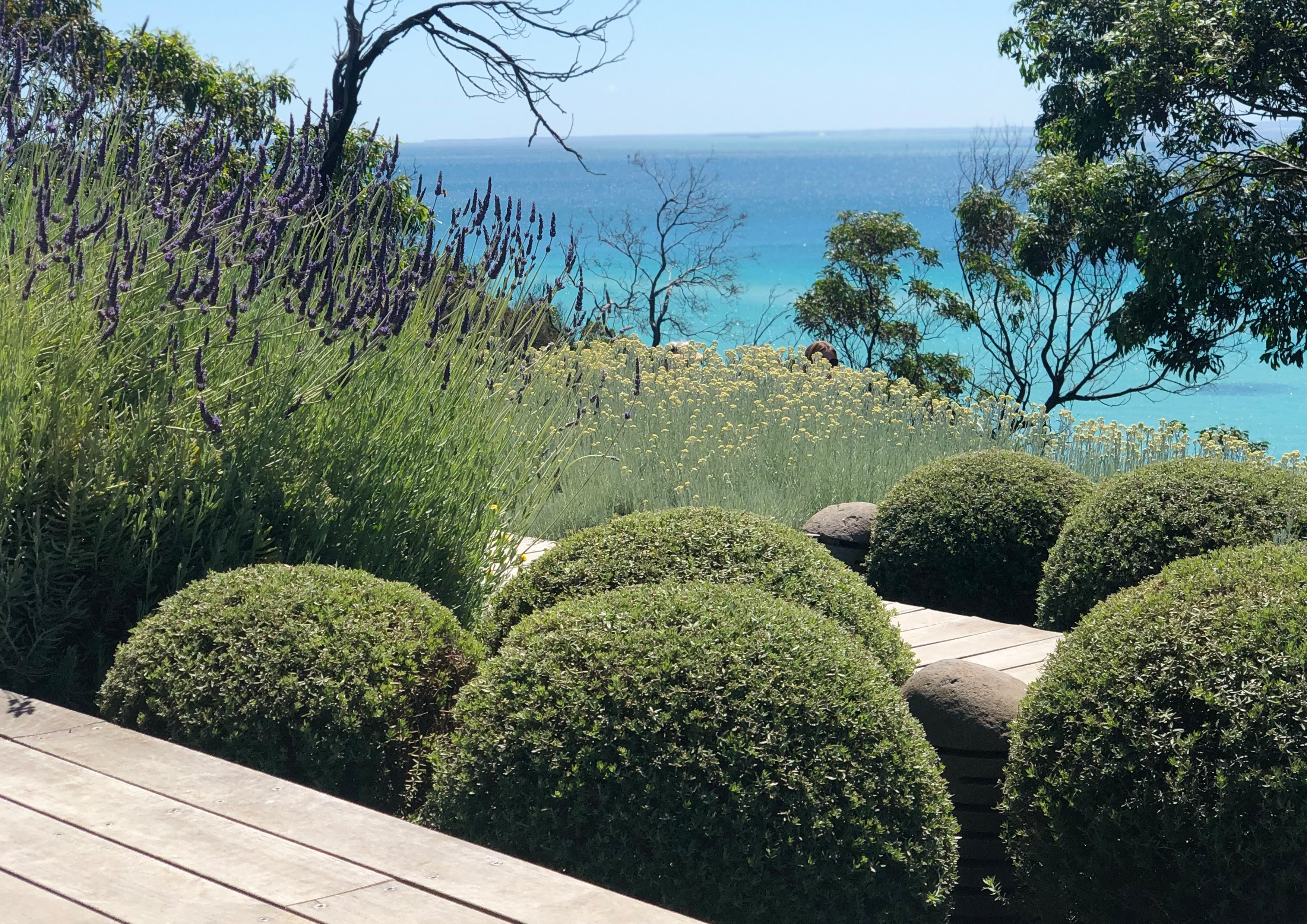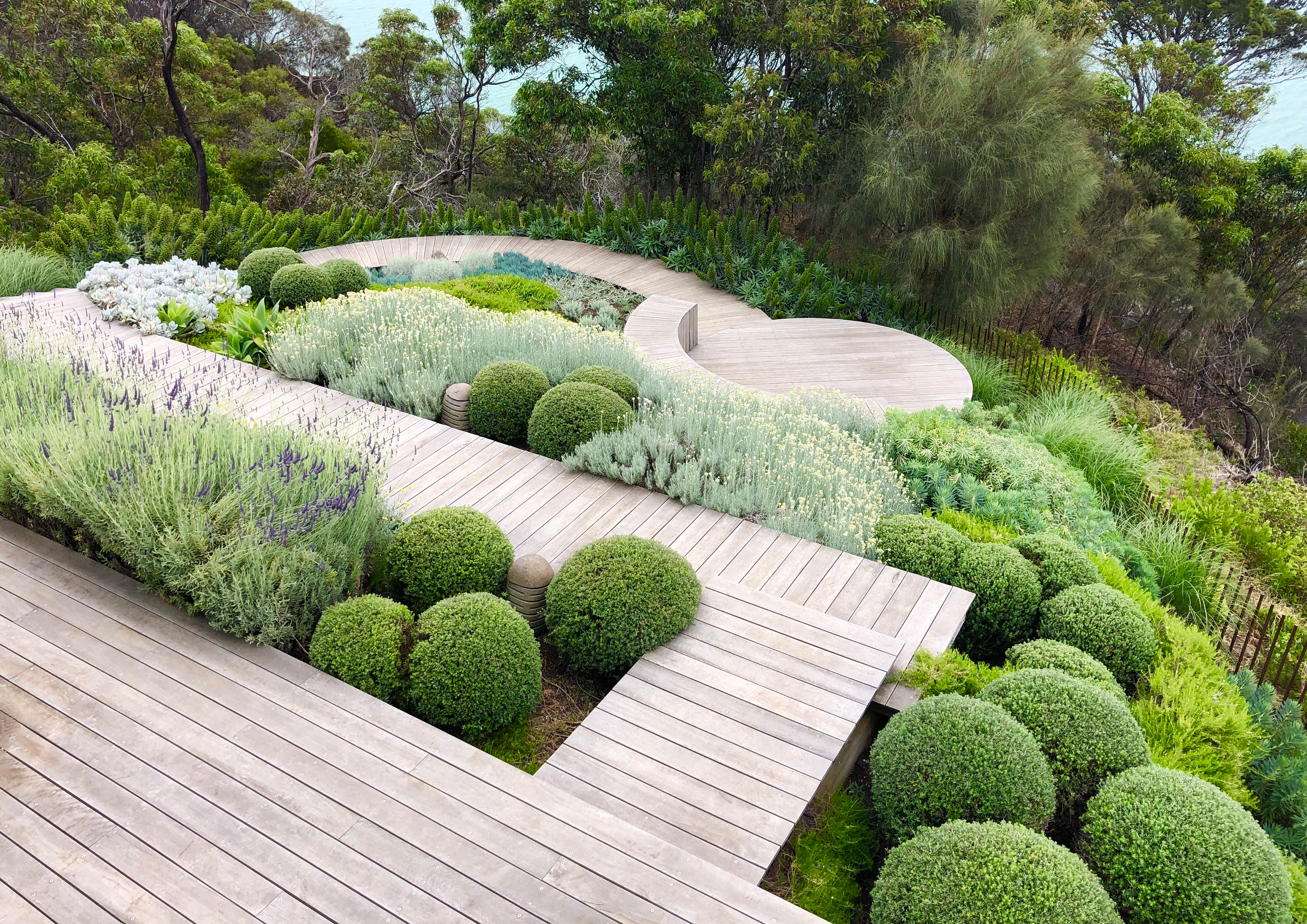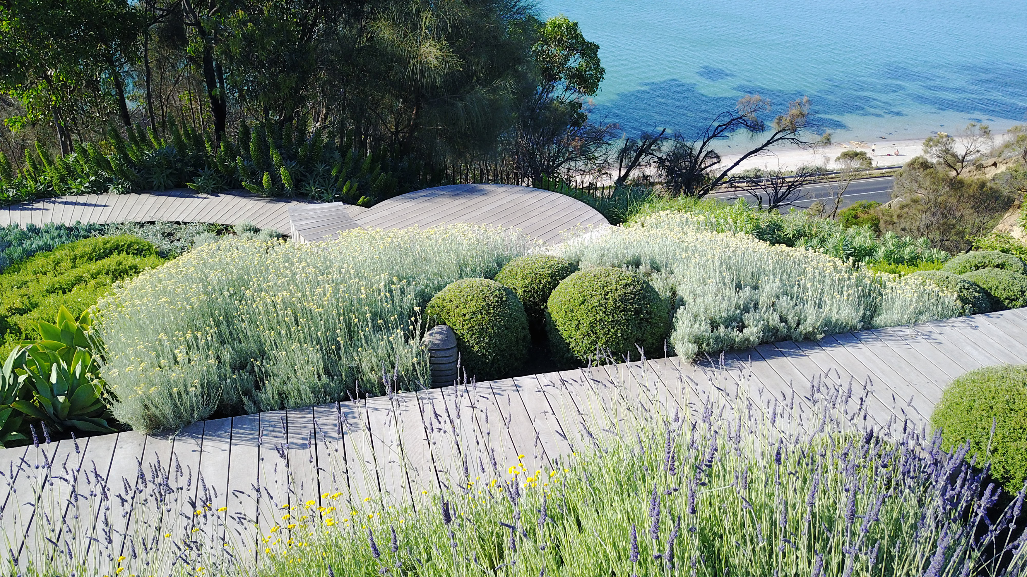 A sweeping timber boardwalk weaves a sculptural form throughout the garden allowing visitors to capture several naturally framed stunning views of the ocean. Plant species such as Westringia, Miscanthus and Lavender provide structure amongst a plethora of silver and green. The curved deck leads down to a viewing platform with breathtaking views of Port Phillip Bay.