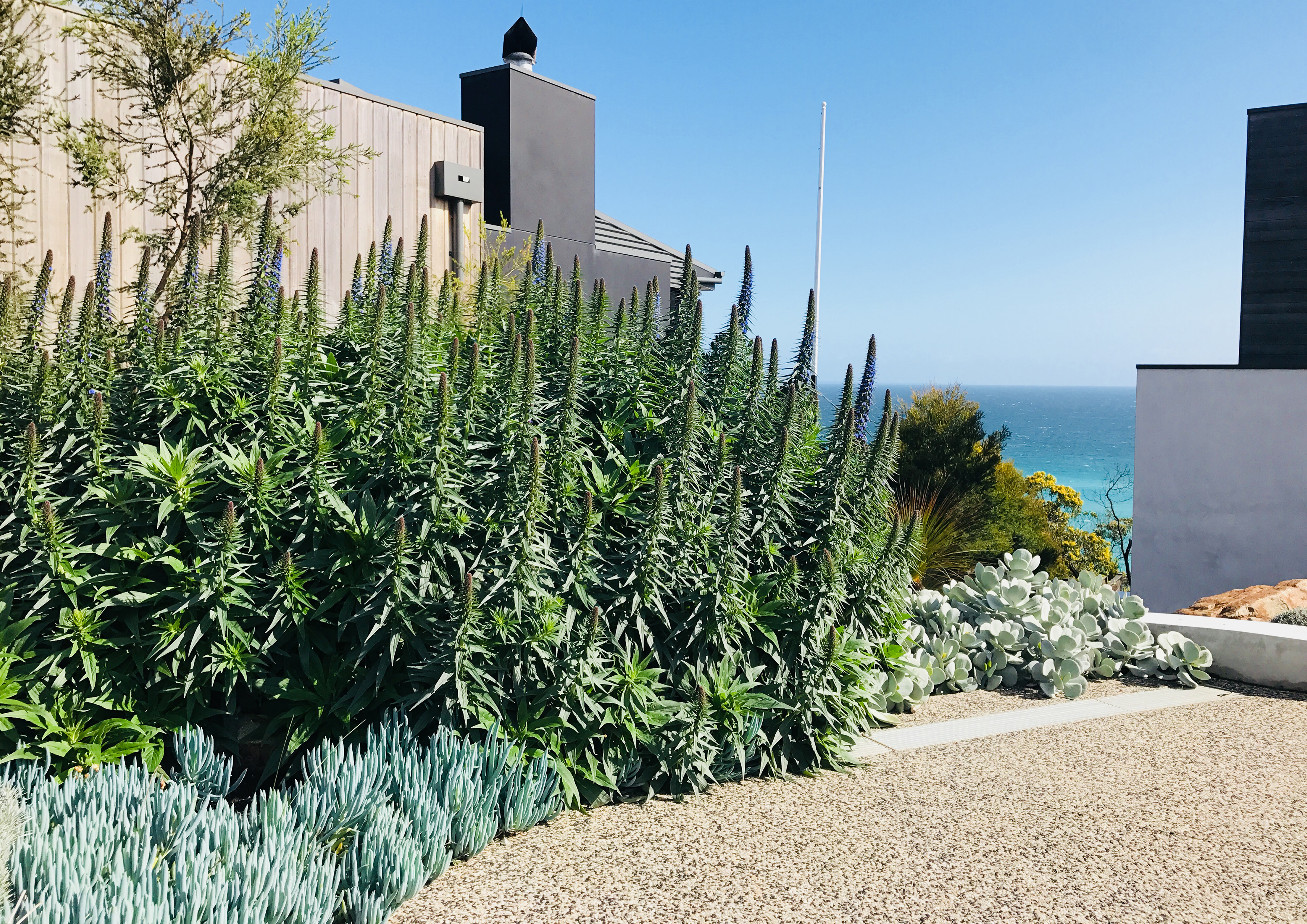 The design was to allow movement throughout an otherwise unusable landslip site and to celebrate the beautiful ocean views, framing them with a broad selection of coastal species.