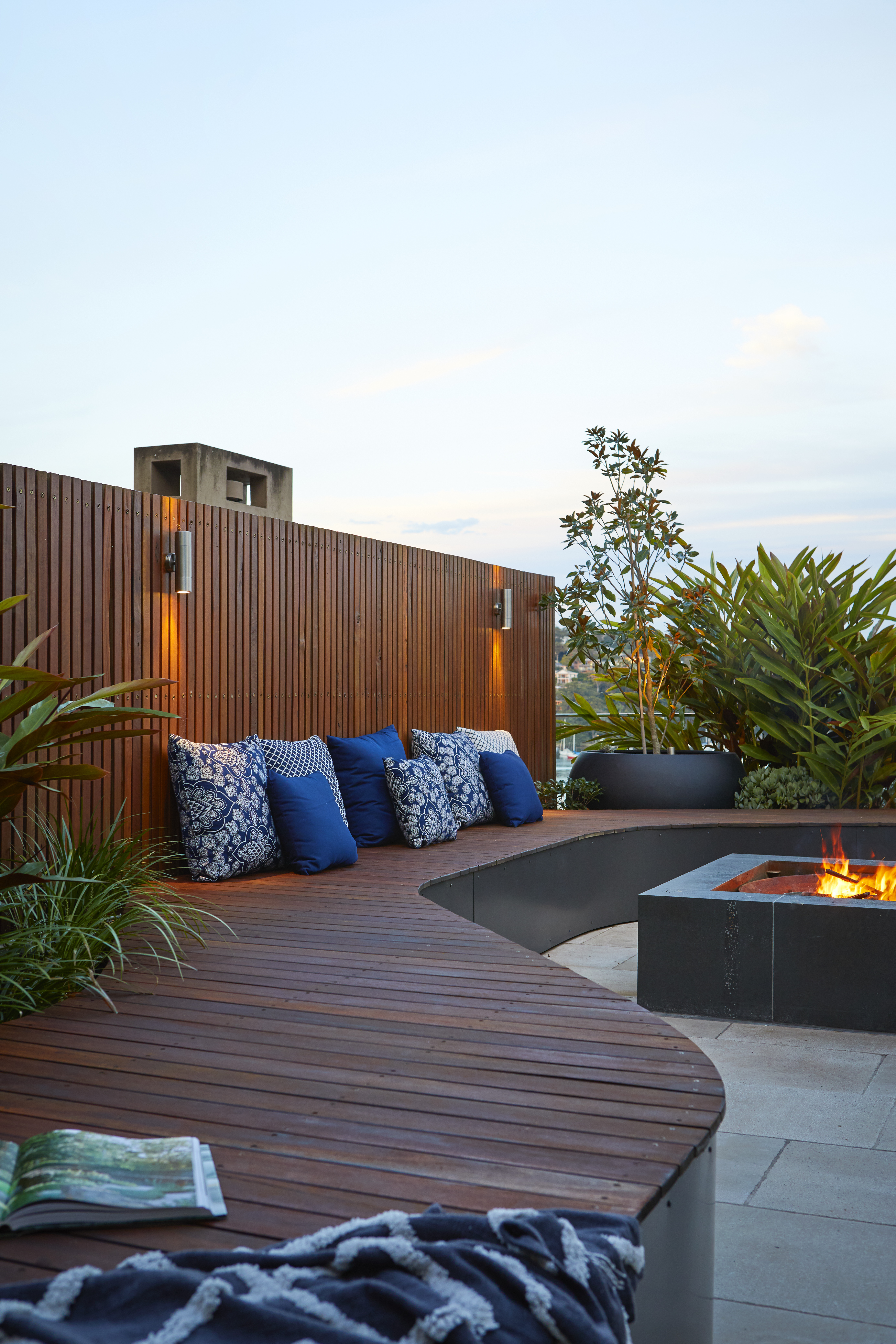 The design brief for this project was to create an area for the whole family to entertain both large groups of friends and more intermit nights around a fire. The designer was asked to create a space that could facilitate people flow while entertaining, to create busy conversation areas and lounging pause spaces. The space was to include a large dining setting, builtin bbq area and lounge seating with a fire pit. He was asked to come up solutions to make this rooftop space useable all year round.