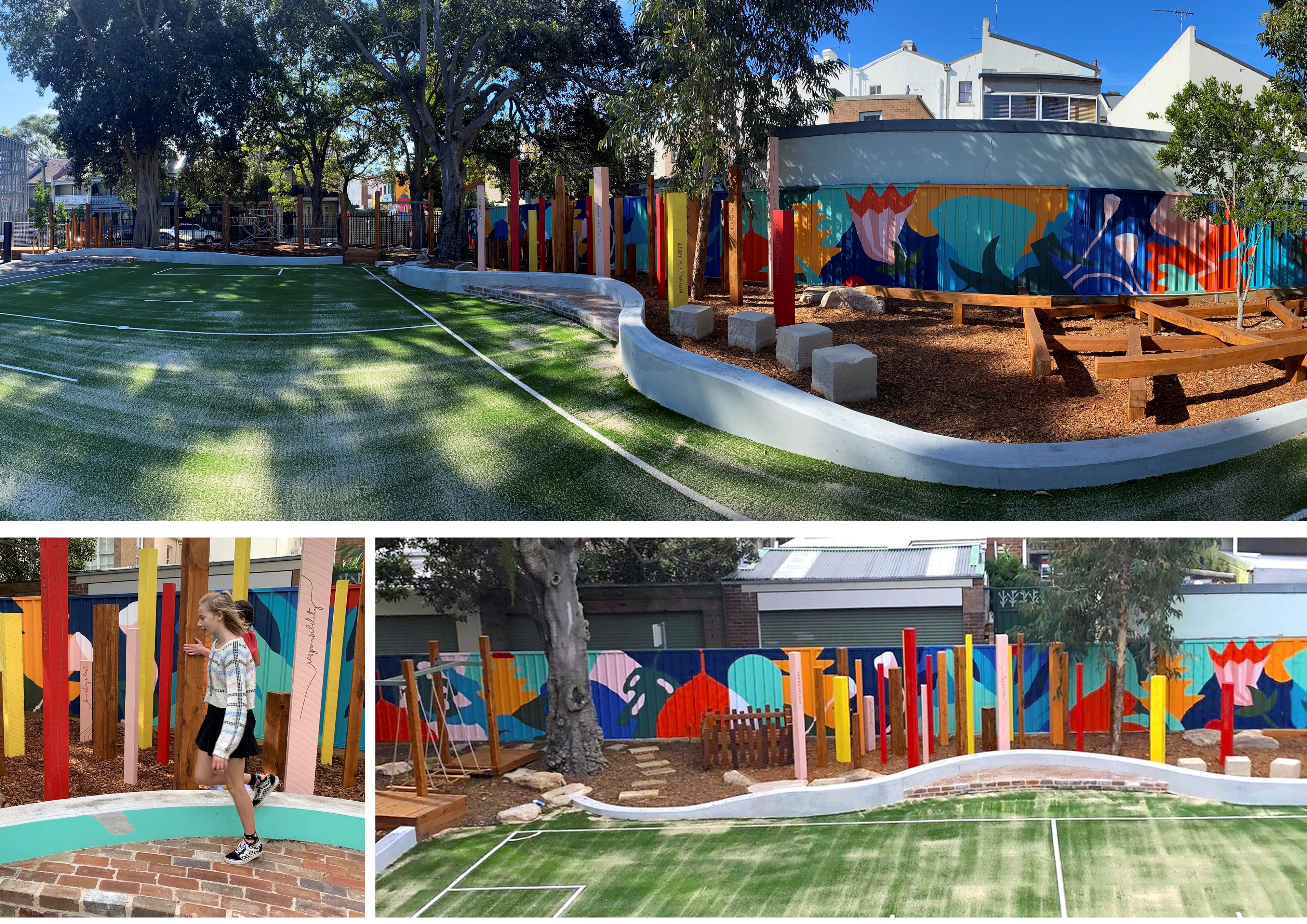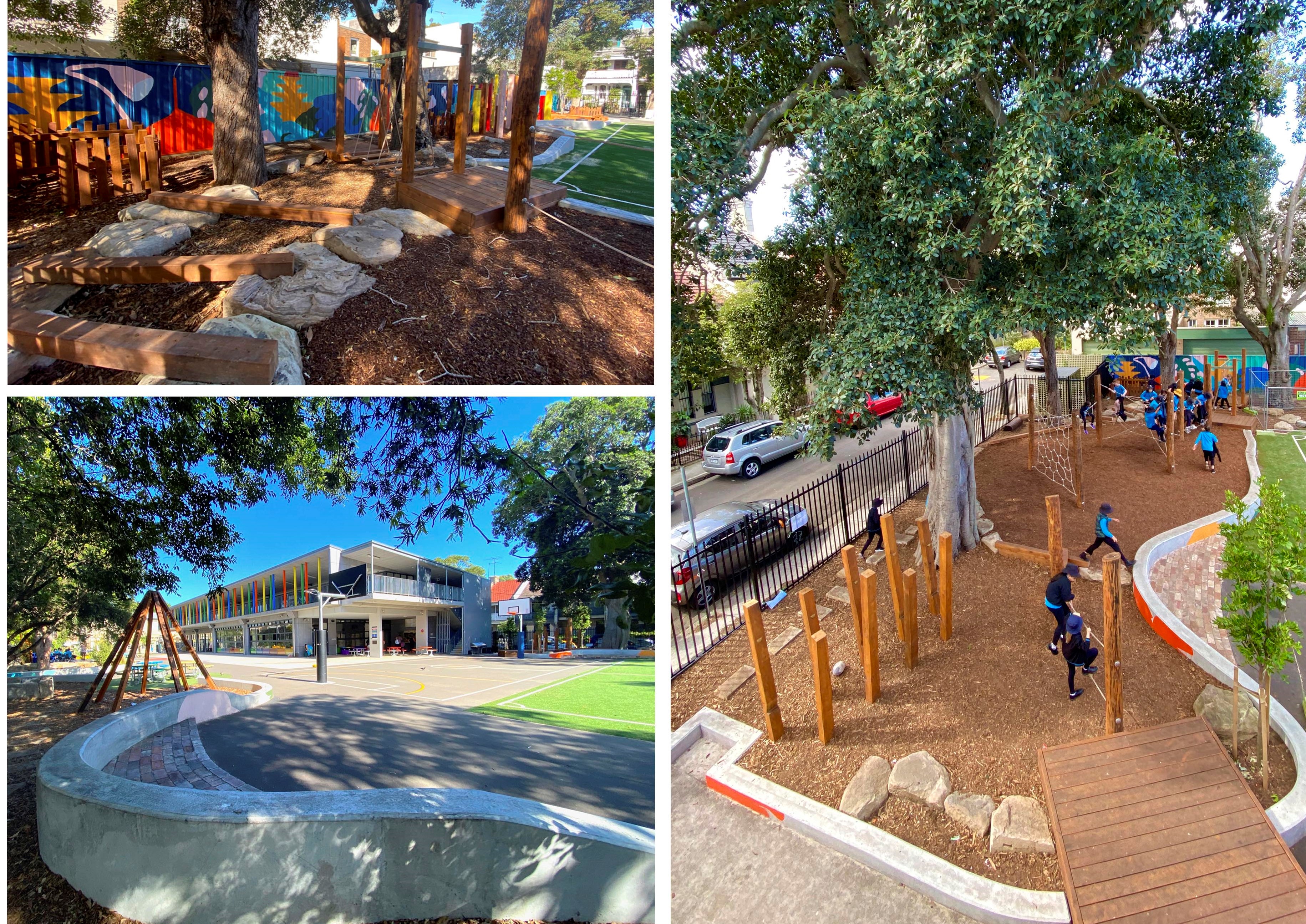 The design for the school in the inner city of Sydney was to maximise the usable outdoor play area to create diverse, engaging areas for learning and play. It was to be mindful of the site's heritage while responding to a large, newly constructed modern building, use reclaimed site materials, provide habitat, contain food producing gardens and create a rustic, natural feel to counterbalance the surrounding high density city scape. Risky play elements for the older children and gross motor and imaginative play elements for the younger children were to be included. Their location was to be carefully considered to create a harmonious play space that avoided conflict between active and passive play types.