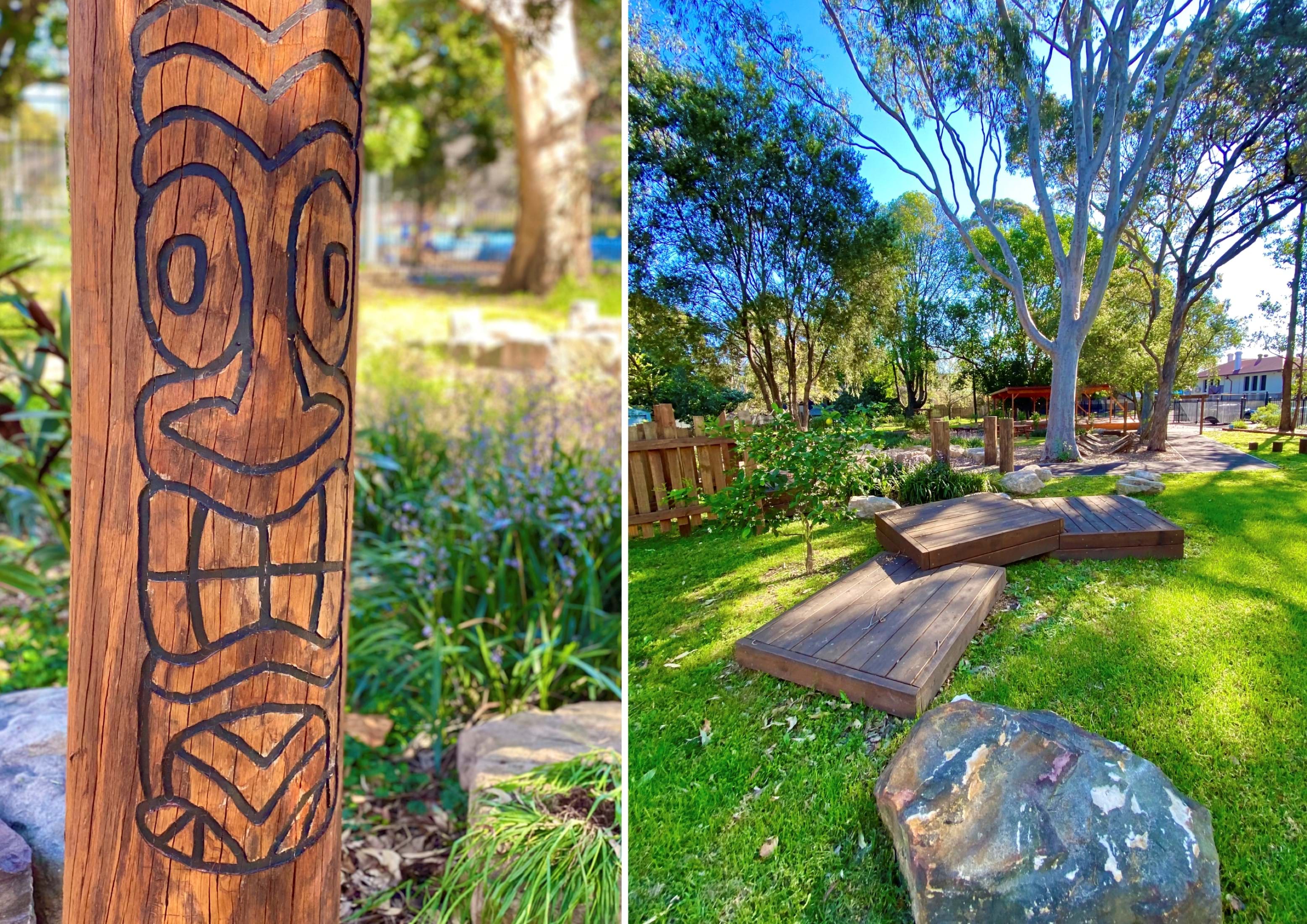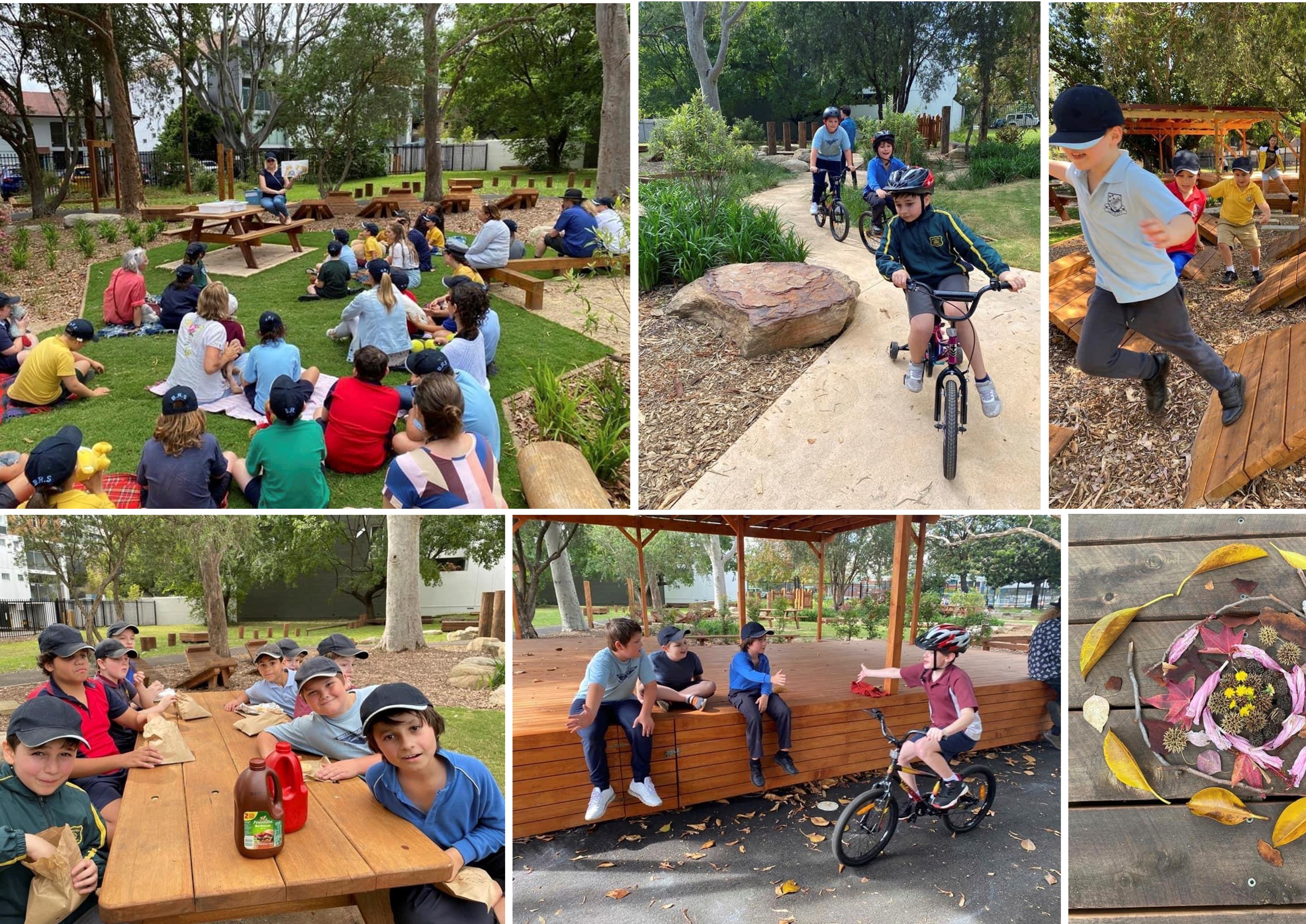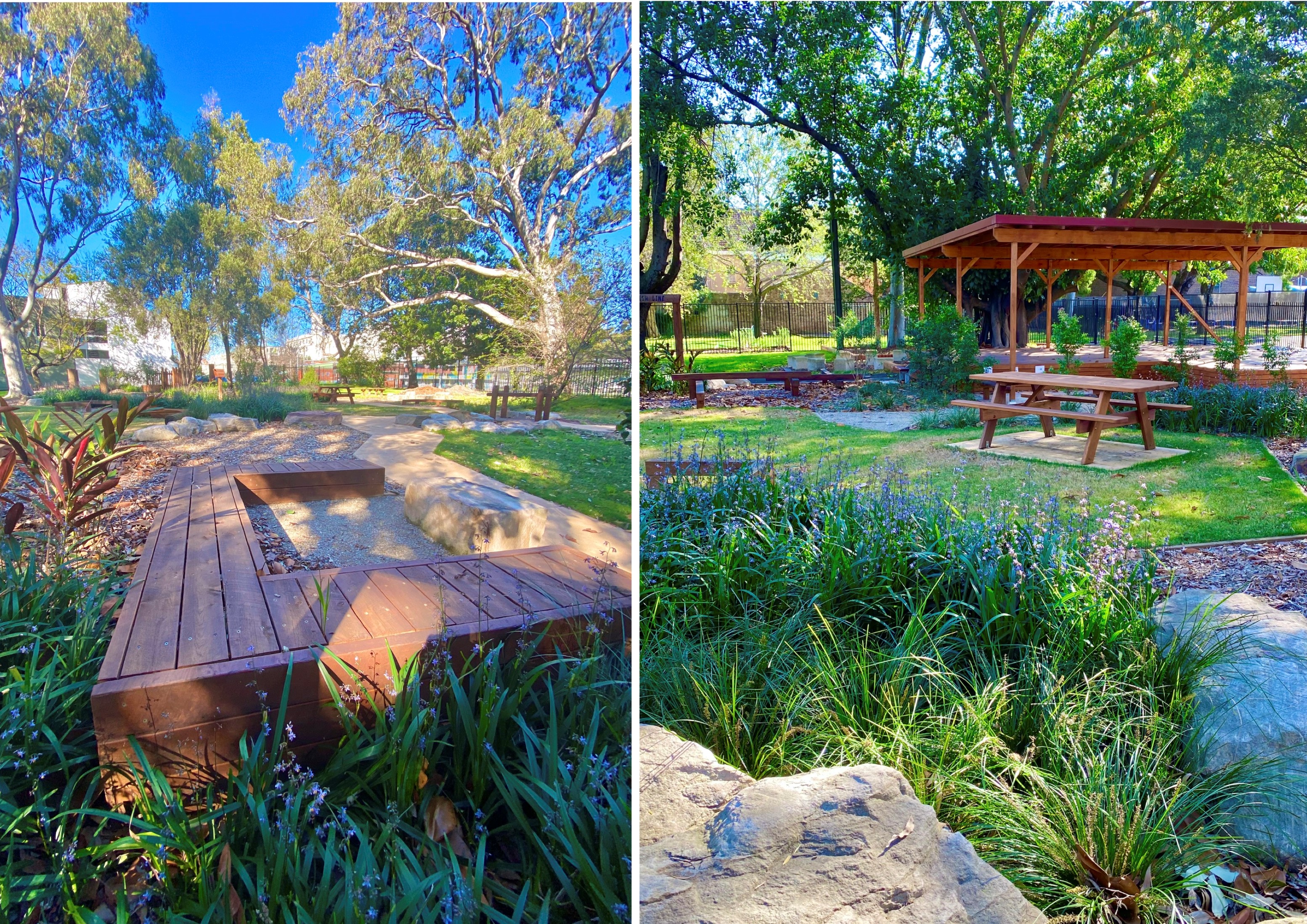 A large, covered deck for School functions, appropriate play equipment, sensory elements, a bike path, storage shed, yarning circle, picnic tables, low maintenance gardens, grass areas for picnicking and a BBQ area were included in the brief. The design was to be subtle and understated and feel like visiting a local community park. All items were to be fixed in place and non-movable by the children. Plant selection and turf had to tolerate moderate-heavy shade due to the existing heavy tree canopy.