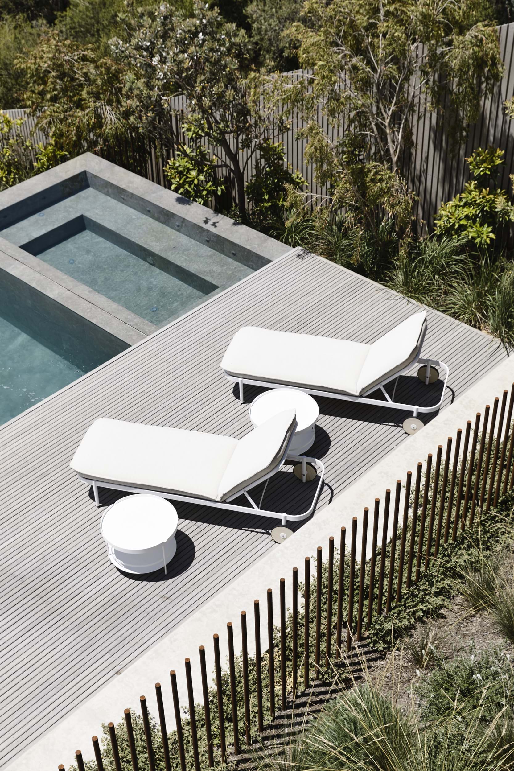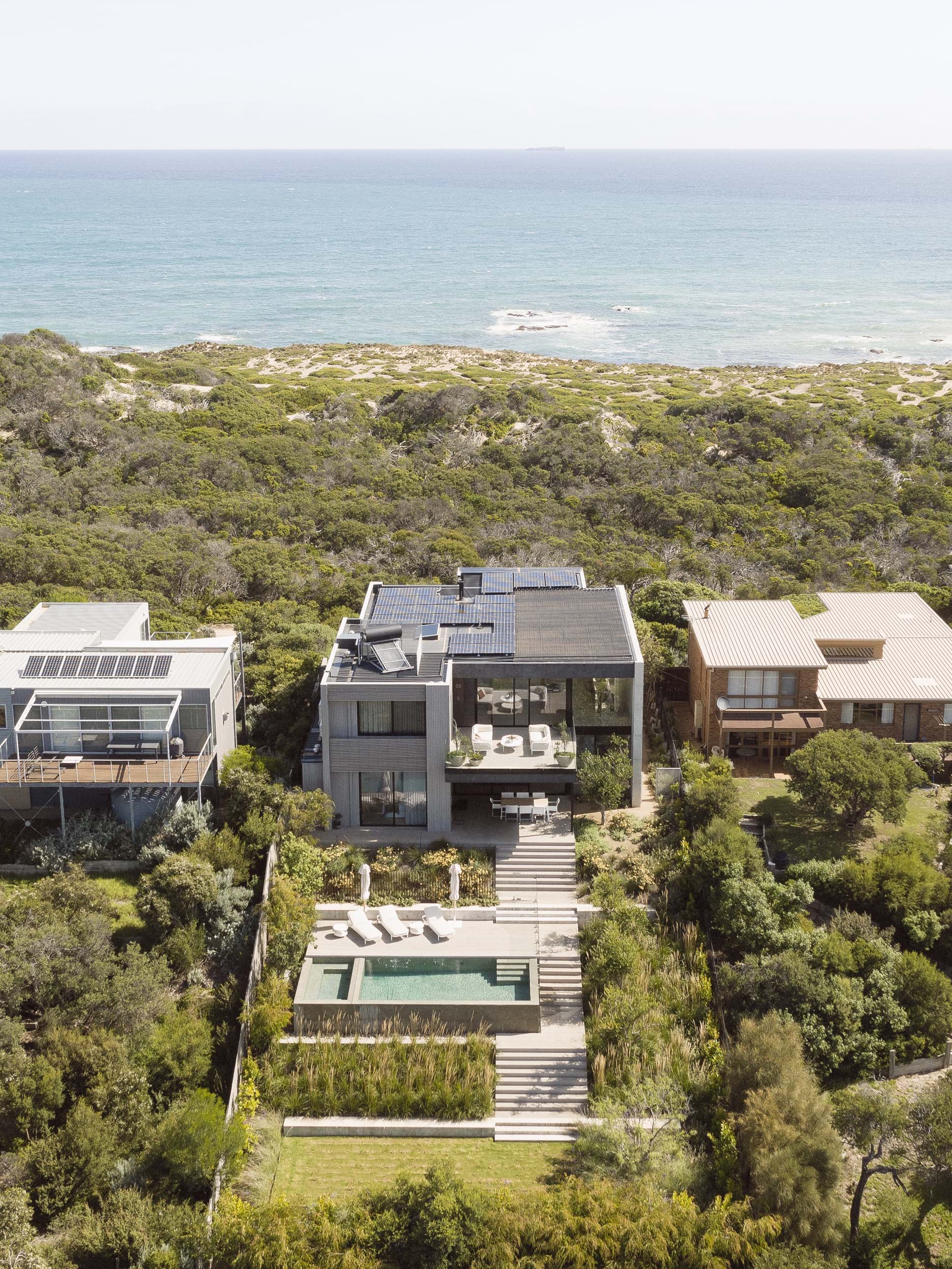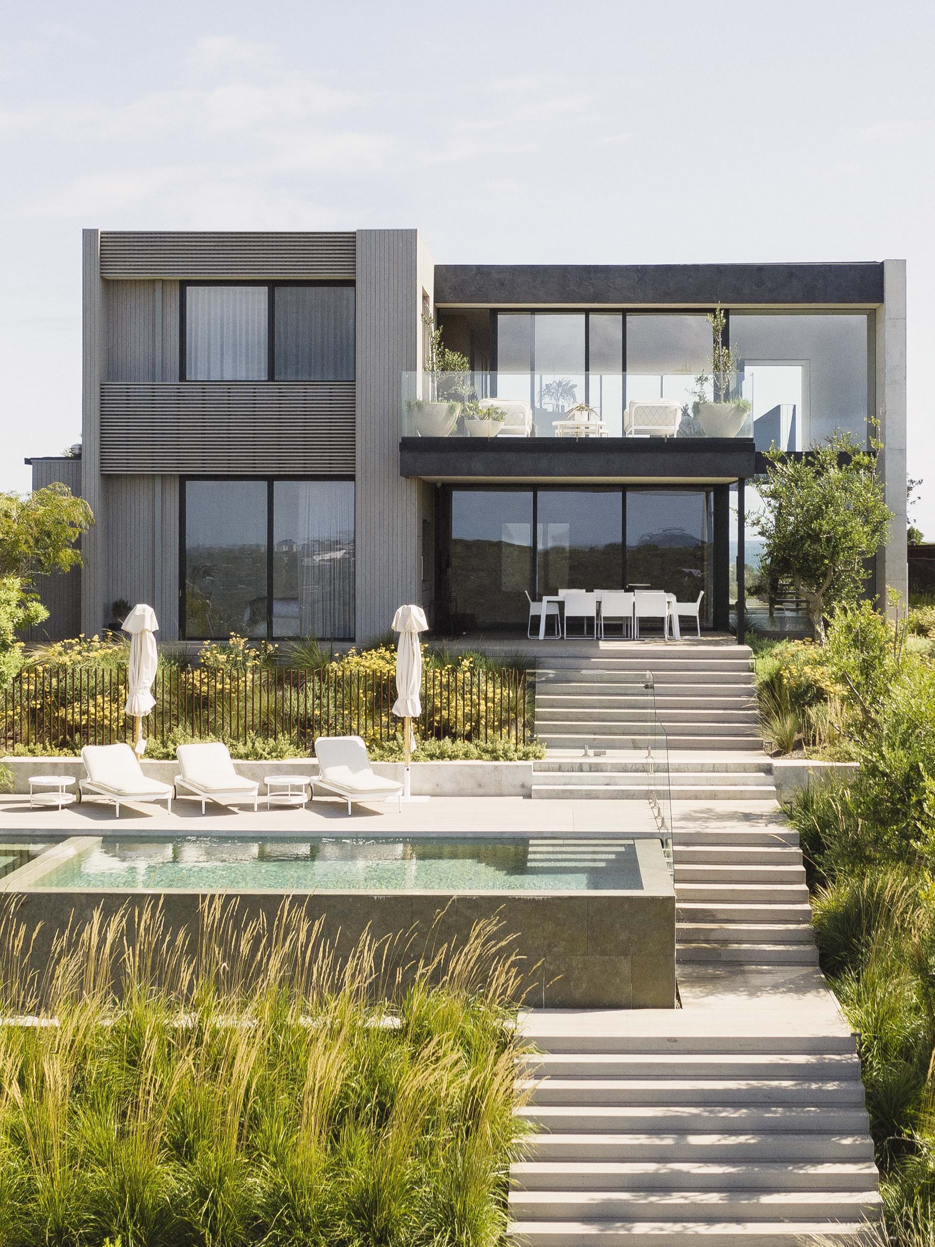 This project was about connecting the architecture to the coastal conditions. Being coastal, the site was exposed and received brutal winds that whip off the ocean so a landscape that was sympathetic to the site context was important. The pool is multipurpose acting as a beautiful water feature to look on to from the house above and helping to terrace the site, activating the backyard by creating levels that can be used by the family.