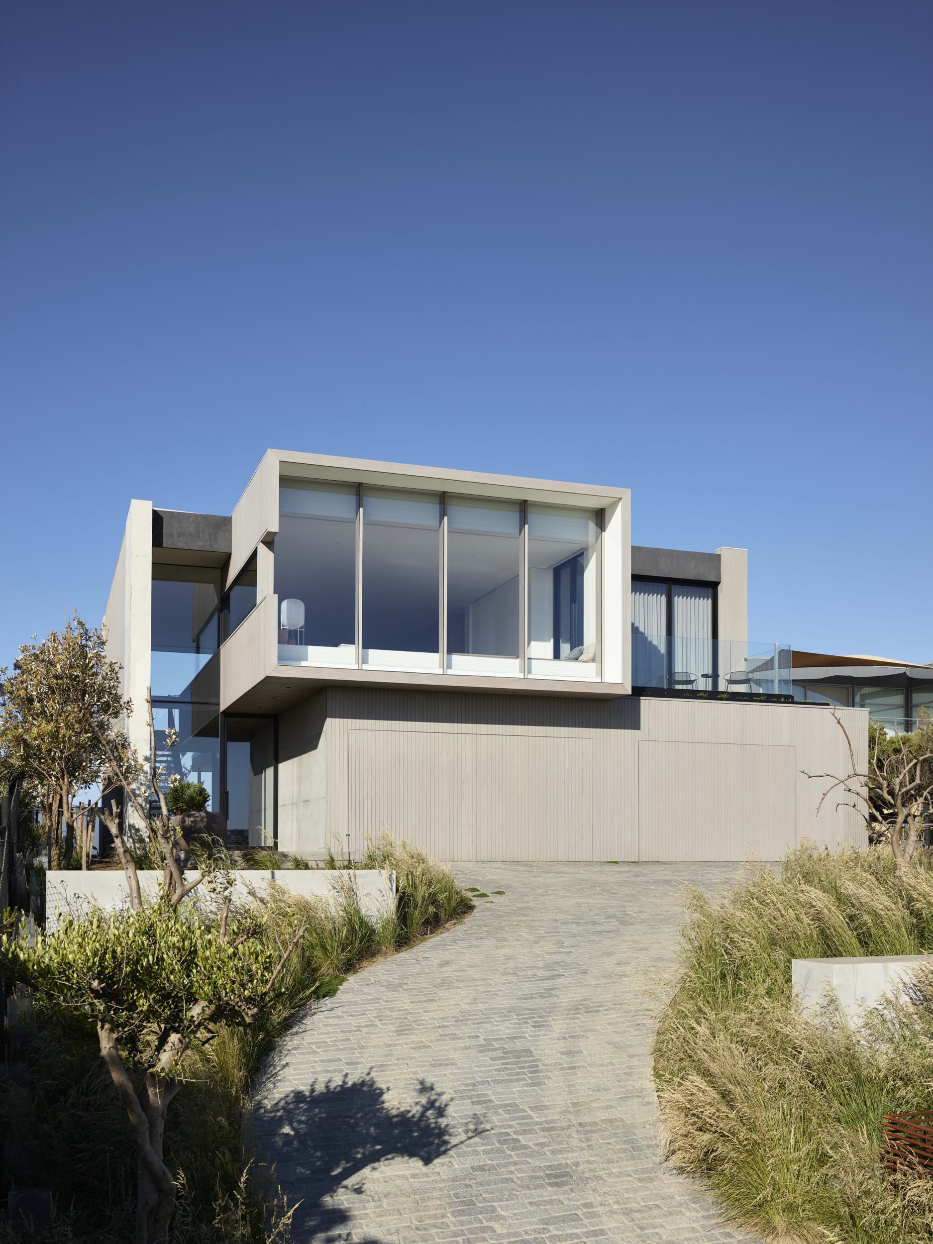 The bold, simple staircase mediating the transition from the house at the top of the site down to the bottom of the landscape is a stand-out feature. Elegant in its simplicity, reflecting the character of the concrete house into the landscape with large swathes of simple planting which evoke the coastal character of the site. The design sits beautifully in its seaside environment. The colours of the house blend into the environment and the outdoor areas are functional and visually appealing.