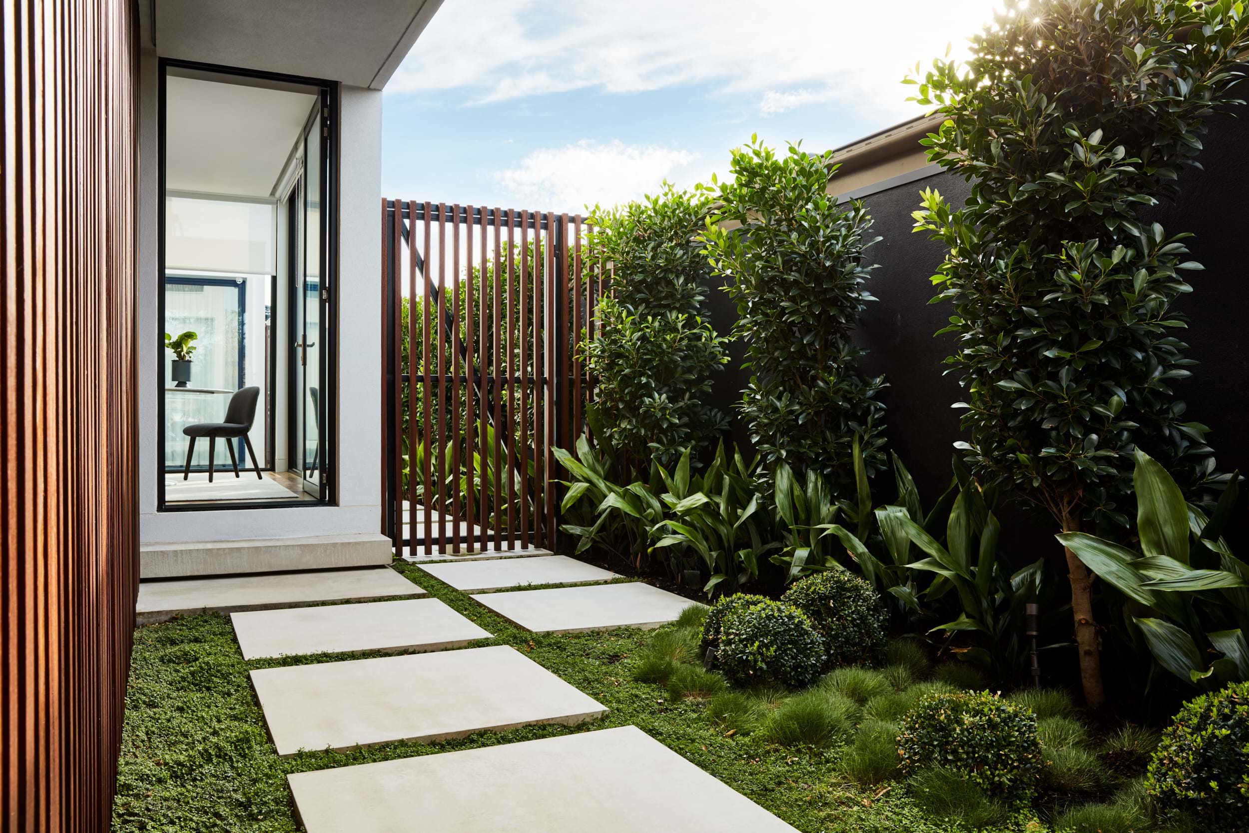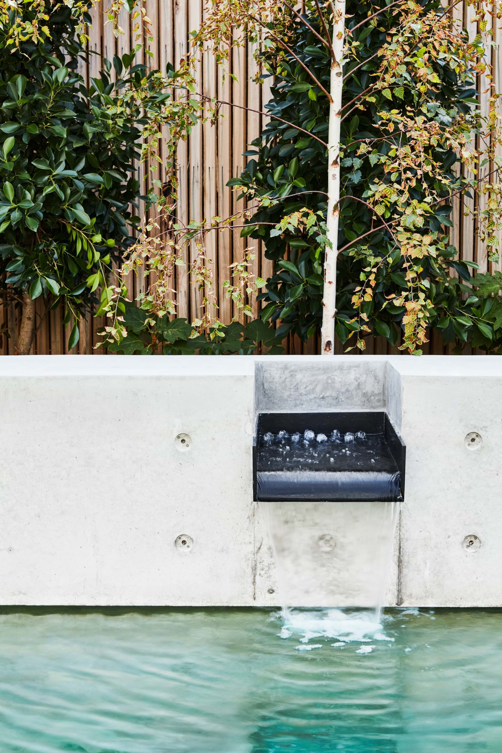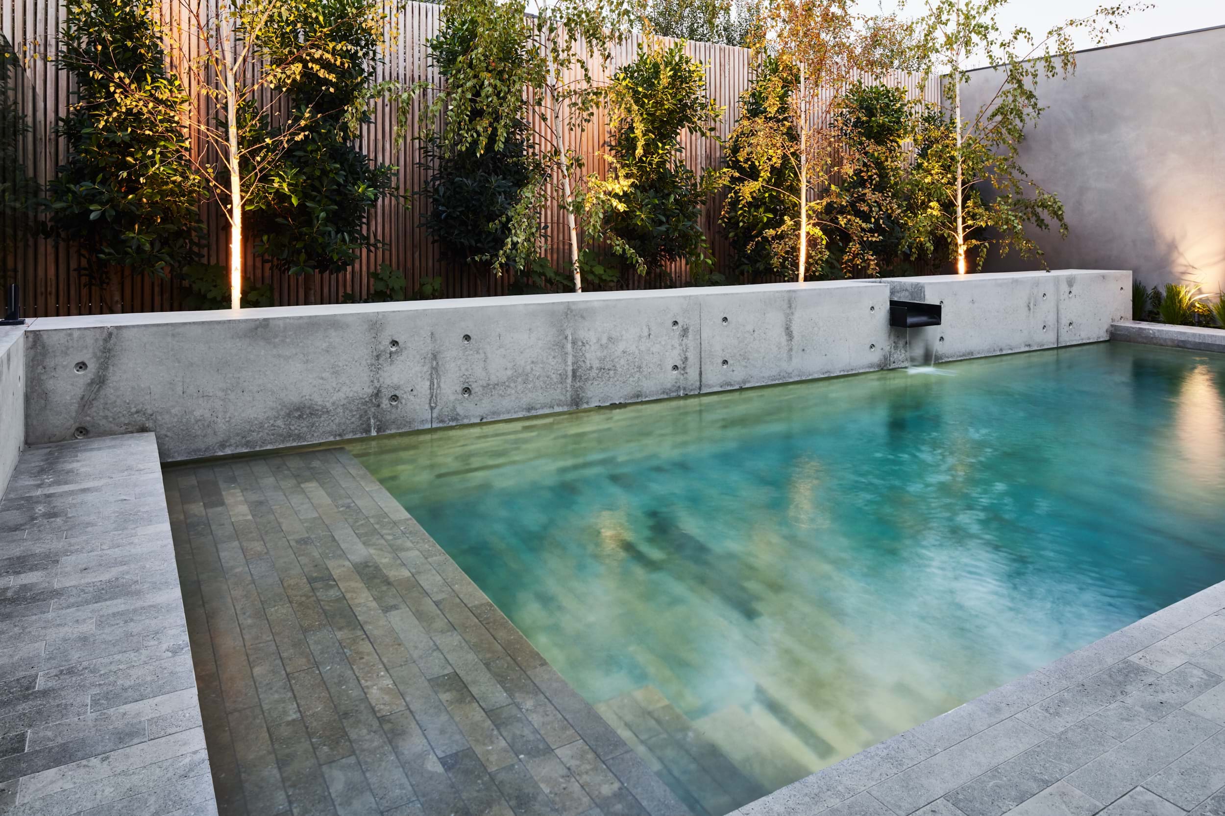 In the front, a stylised forest was created to help soften the façade and give semi-permeable privacy for the residence when inside. The sideway was about greening the boundaries and layering the tight garden beds with all year-round greenery and lushness. In the rear, the main focus was the swimming pool and its surround. The Andorra limestone is a key feature running through the pool and items like the outdoor kitchen and pool water feature - all oversized to replicate the details of the home.
