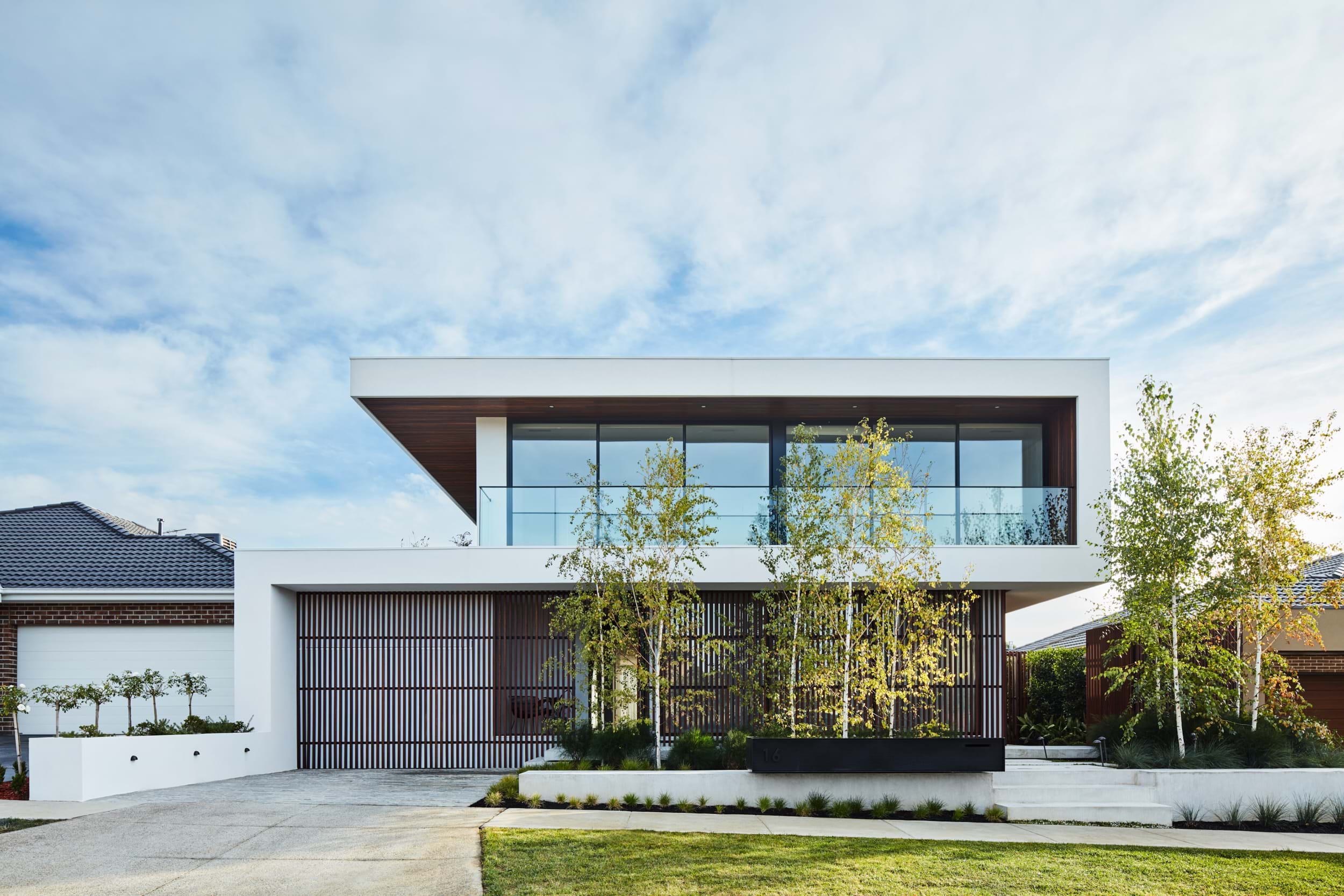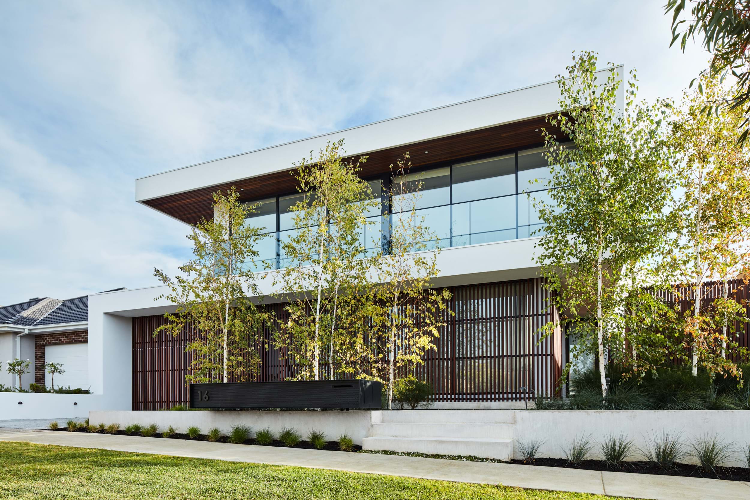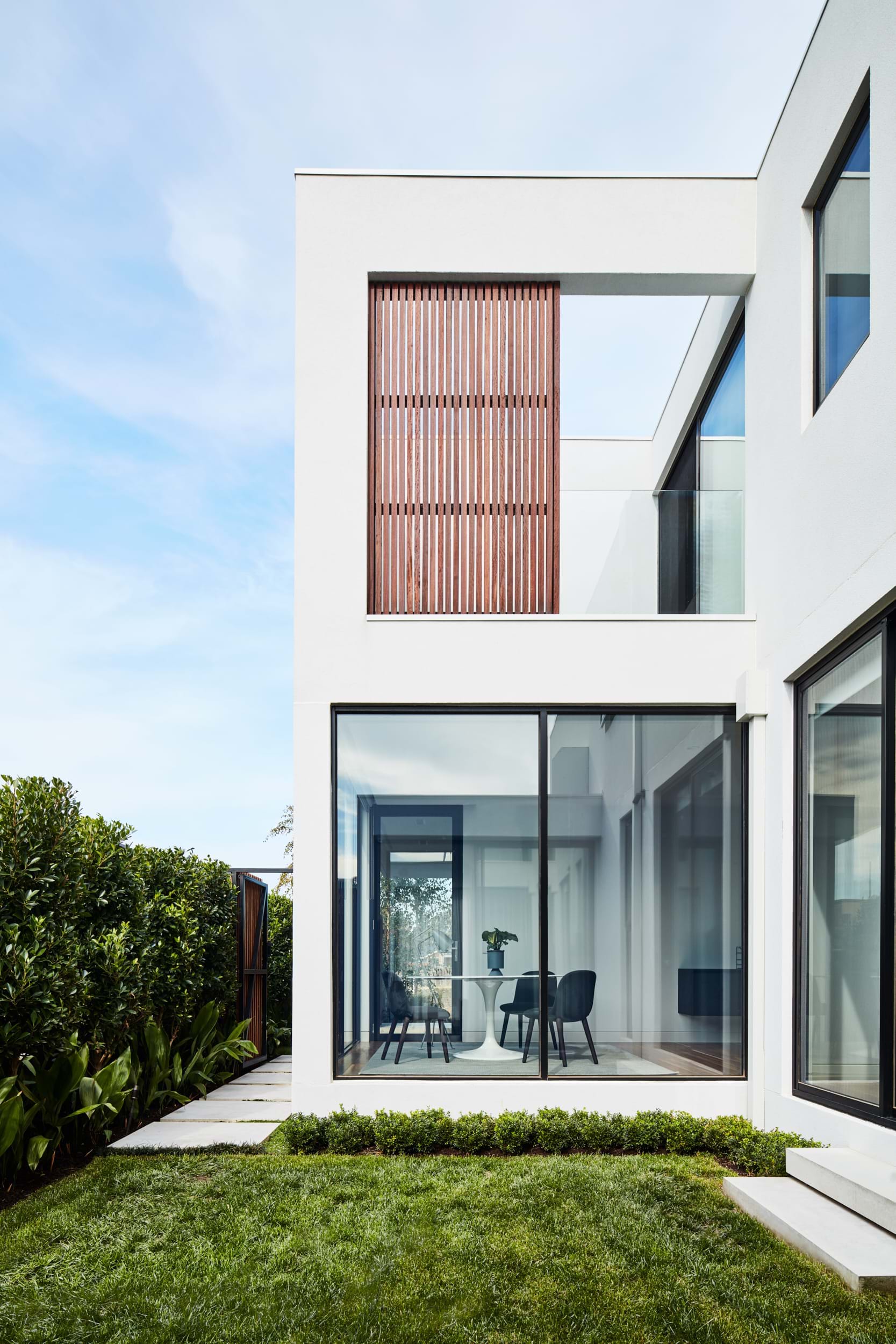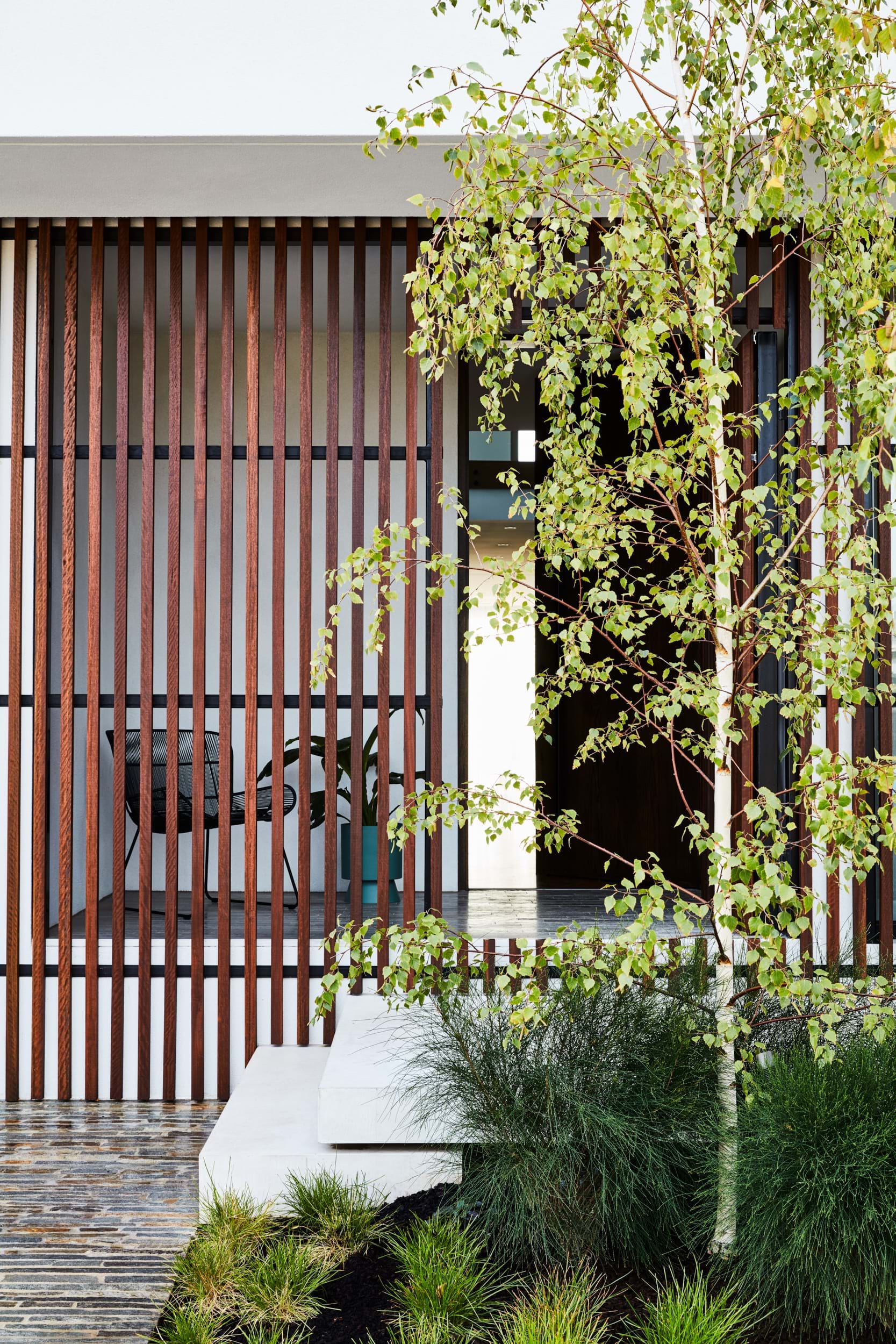 In the front, a stylised forest was created to help soften the façade and give semi-permeable privacy for the residence when inside. The sideway was about greening the boundaries and layering the tight garden beds with all year-round greenery and lushness. In the rear, the main focus was the swimming pool and its surround. The Andorra limestone is a key feature running through the pool and items like the outdoor kitchen and pool water feature - all oversized to replicate the details of the home.