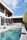 There is a clever placement of plants inviting the garden indoors. The steps at the front of the house lend themselves to the design, simple and stylish as is the selection of trees. Plants almost cocoon the entire house providing privacy and a sense of calm. The design works well with the monolithic architecture of the home. There is an interesting use of bricks going into the pool as cladding rather than pool tiles. Thoughtful detailing of concrete showing evidence of the construction process adds to the industrial vibe.