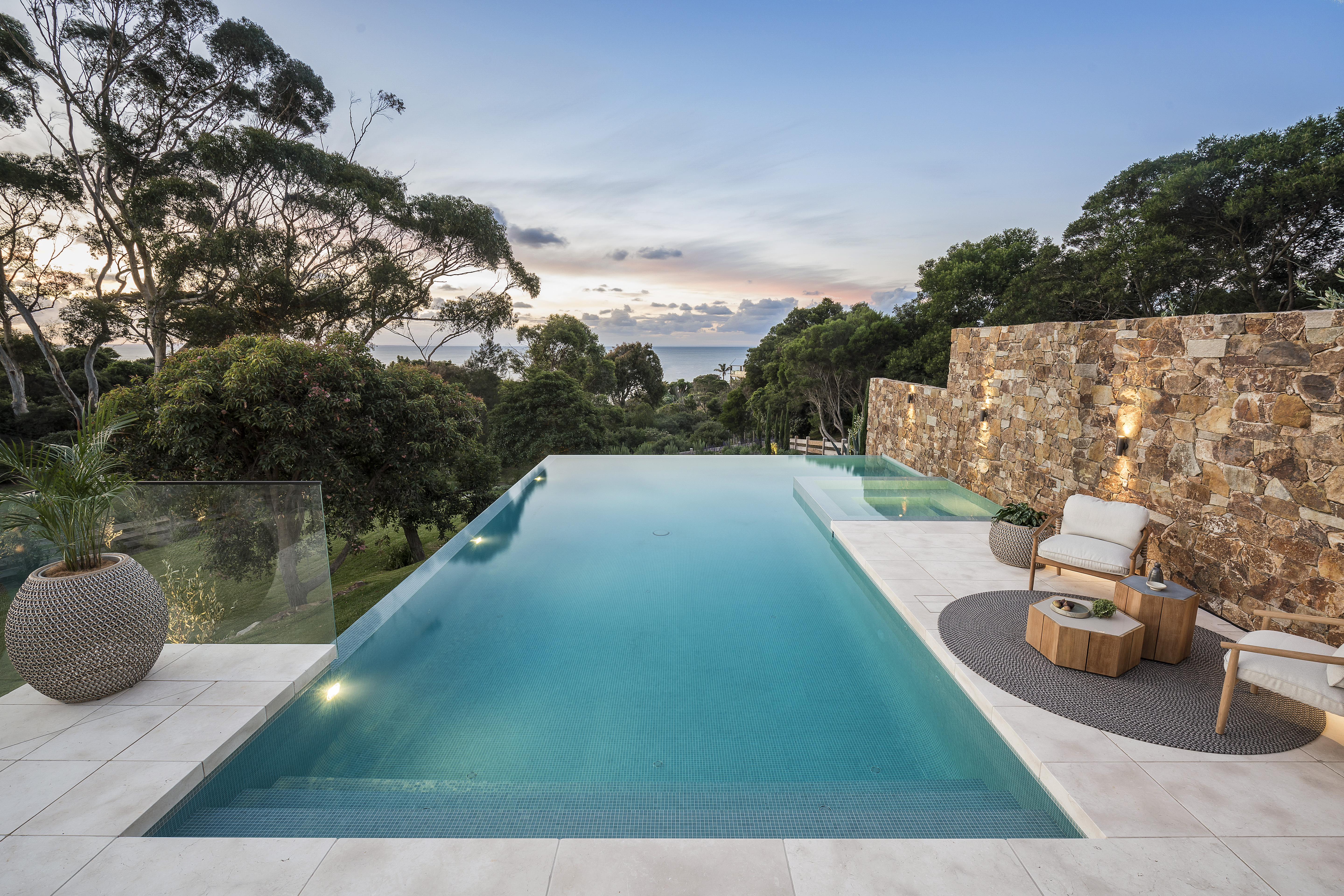 The client required a landscape and pool design for their sloping block of land. The first challenge was the 8.5 metre fall from the top to the bottom. The other challenge was to design a landscape to fit with the architecture of the house and surrounding coastal environment.