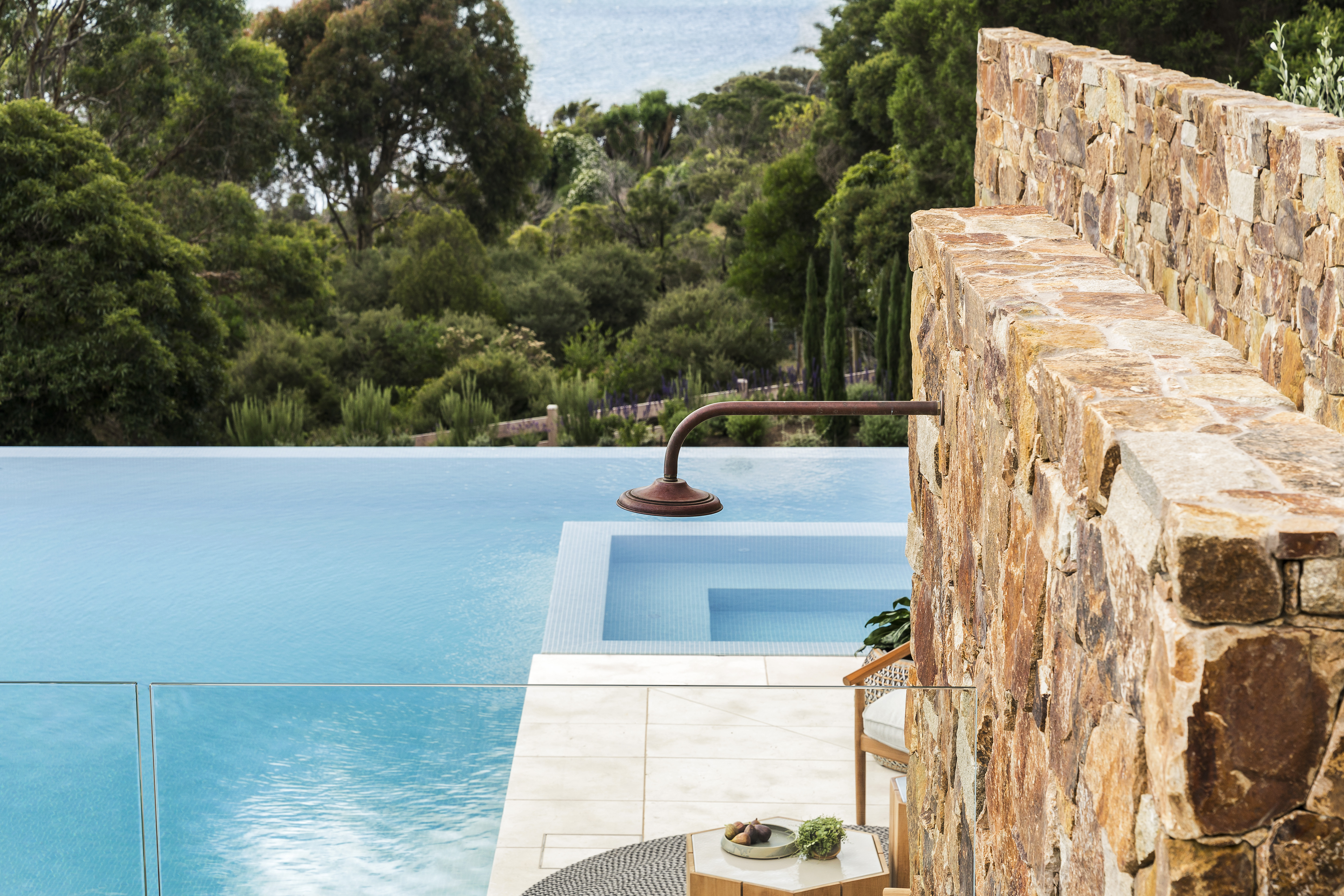 The brief specs included a large family-sized pool and spa with a wet edge that captured the view, a reworking of the rear deck to make it more liveable, level terraces to make the rear yard more user friendly, a basketball area, fire pit, built in trampolene, level lawn areas, and an eclectic, textural plant palette, natural coastal textures and materials, an outdoor shower, intimacy and privacy. A relaxed coastal, yet sophisticated feel throughout.