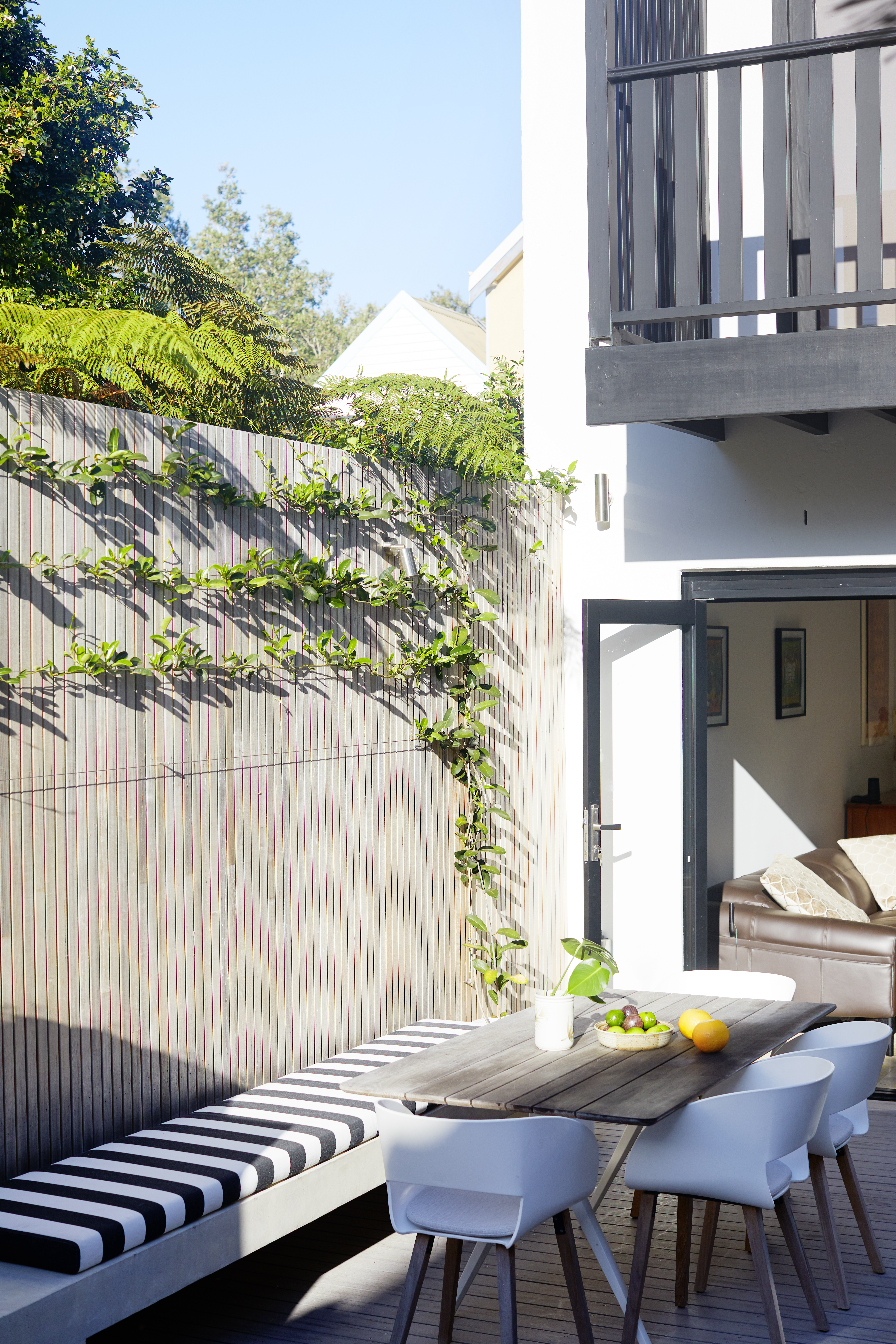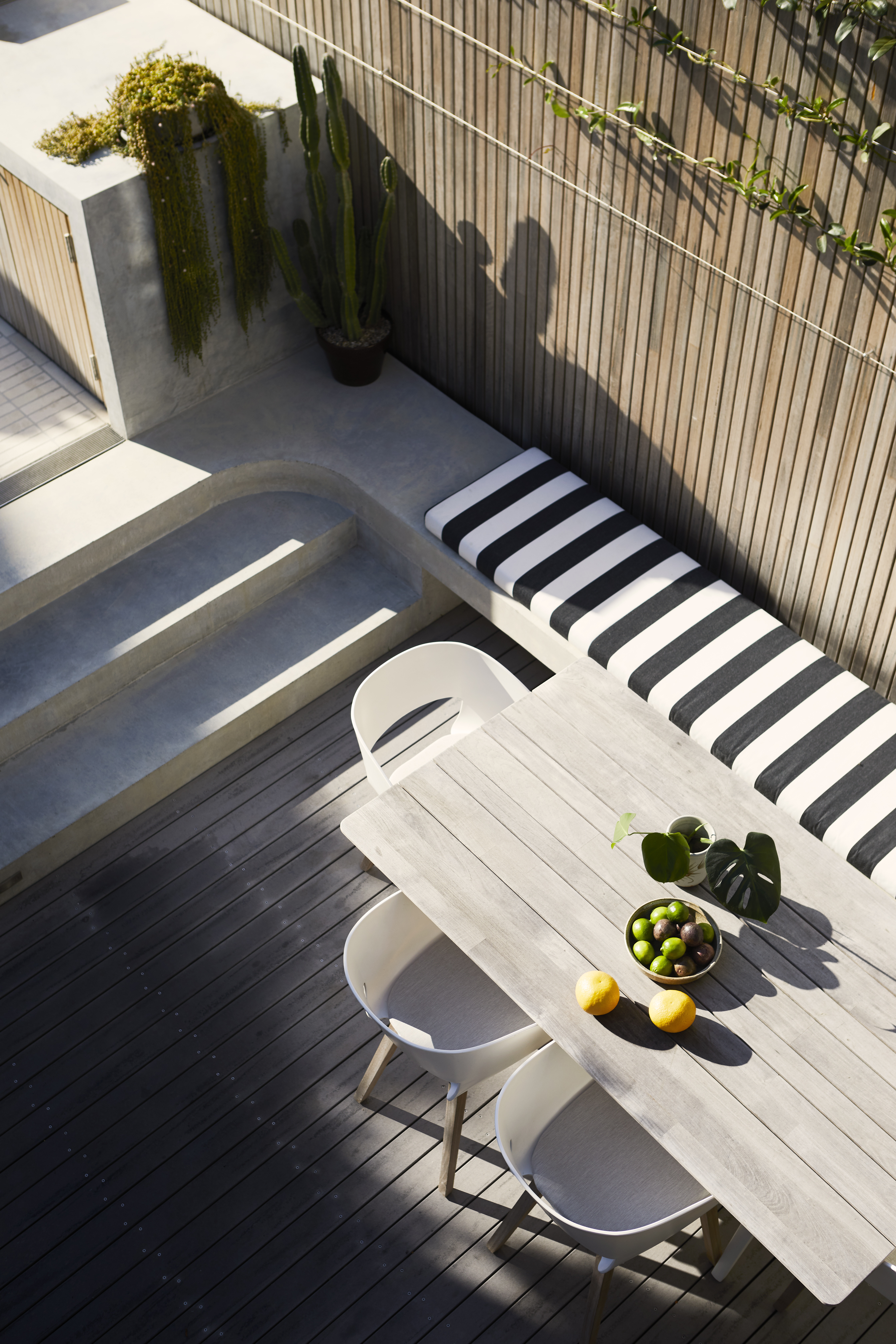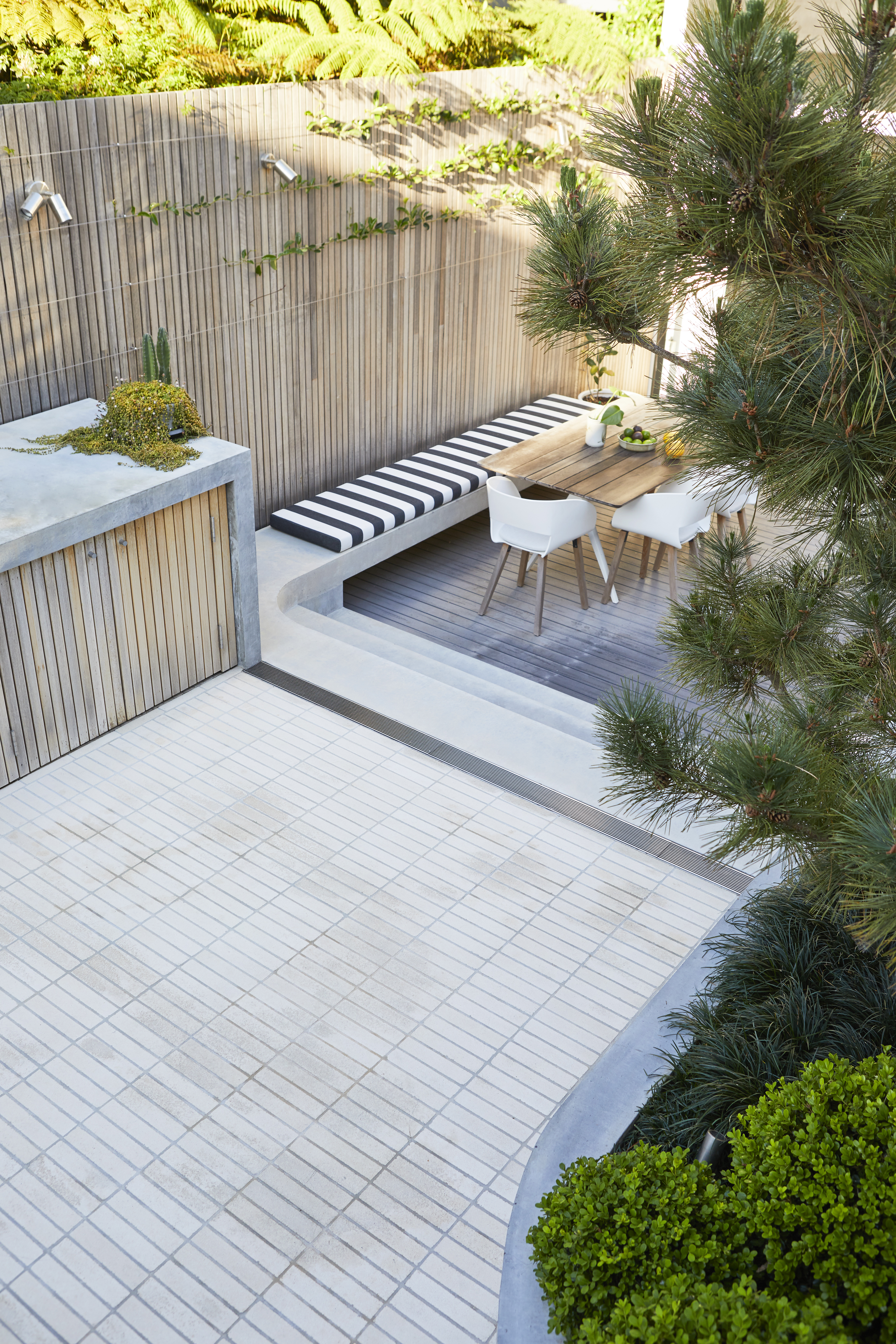 This is a deceptively simple and seemingly effortless but carefully and beautifully curated courtyard garden. The use of subtle silvers, greys and creams in the hardscape finishes bring in borrowed landscape elements such as the greying timber of a neighbouring home, making the courtyard feel larger and more expansive. Beautiful construction details, such as the insitu concrete bench seamlessly curving around to become a perpendicular landing step make this a high-end project befitting its location.