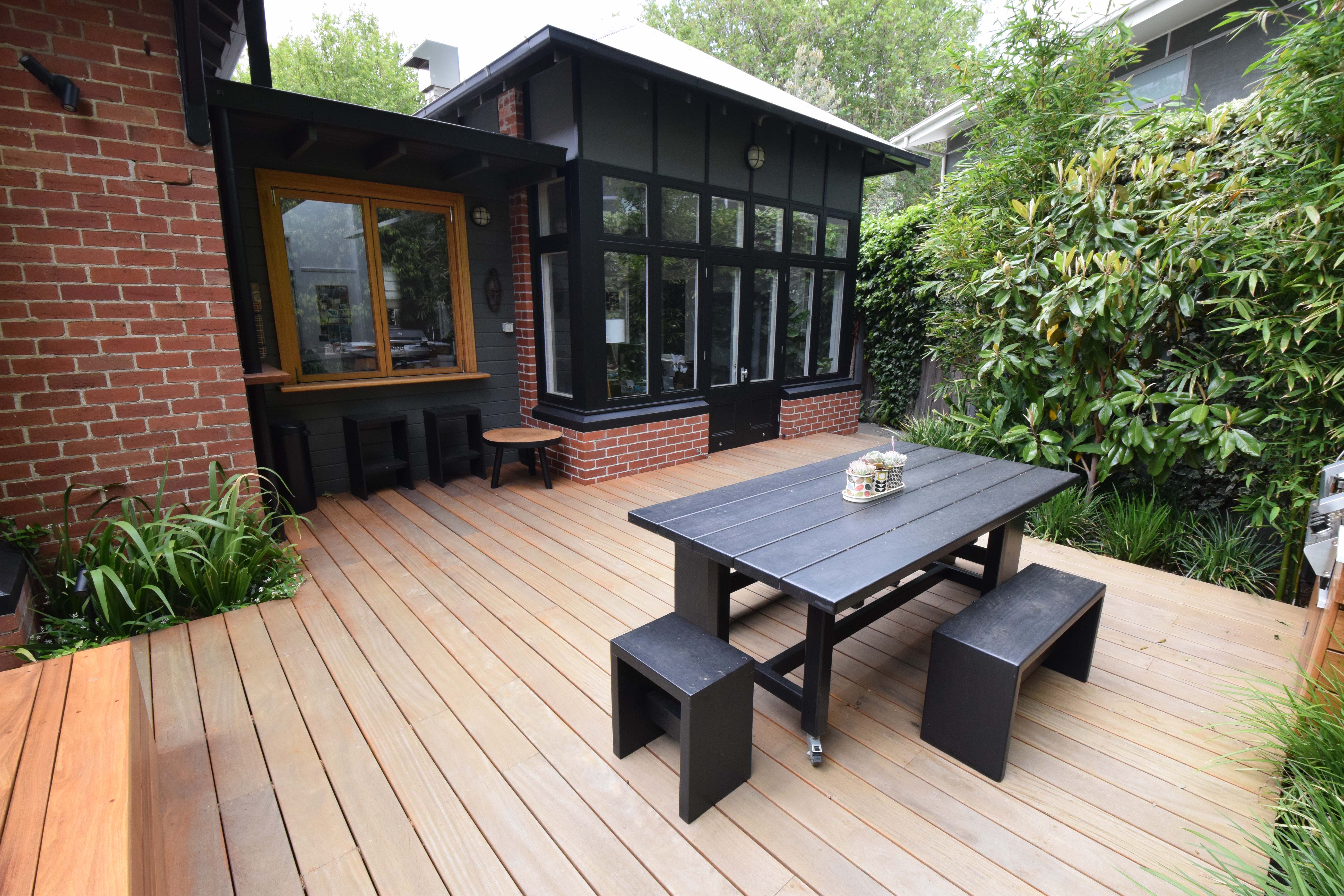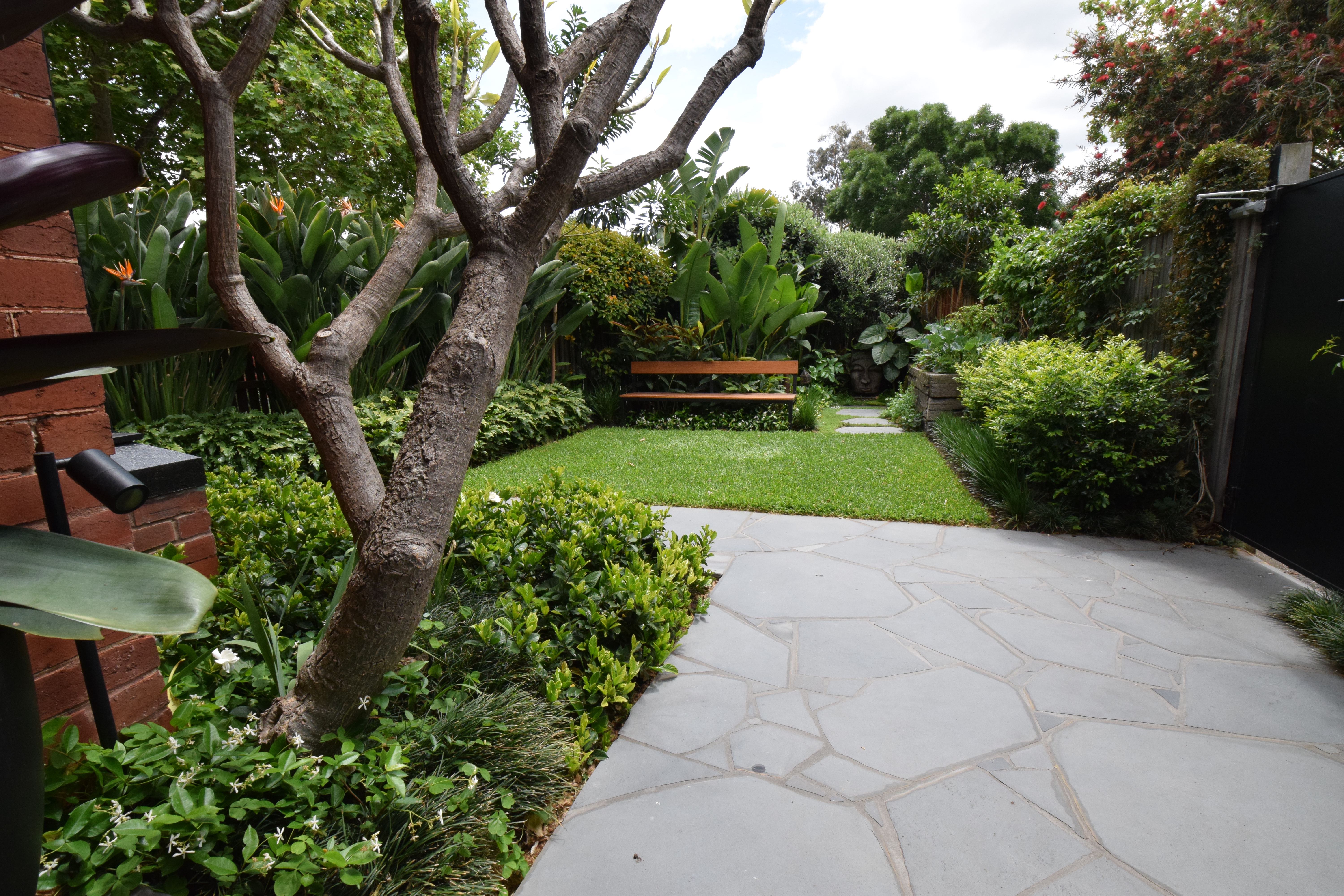 The layout of this garden draws heavily on the architectural lines of the house, projecting them into the garden. The illusion of space is created while dissolving any awareness of the tapering boundaries. An entrance court in Victorian bluestone serves to showcase the attractive façade, Frangipani tree, and garden beyond and invites engagement in all directions.
