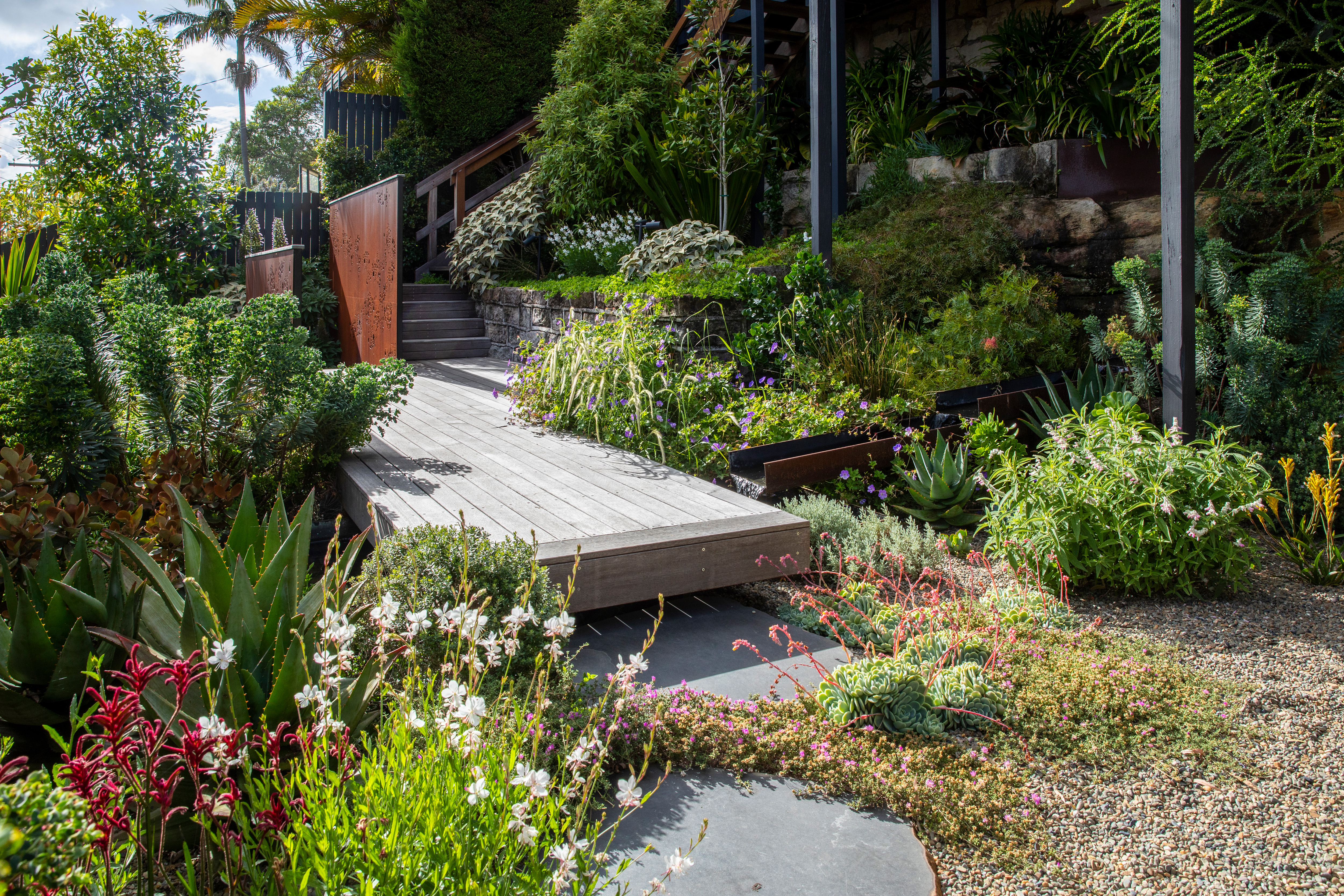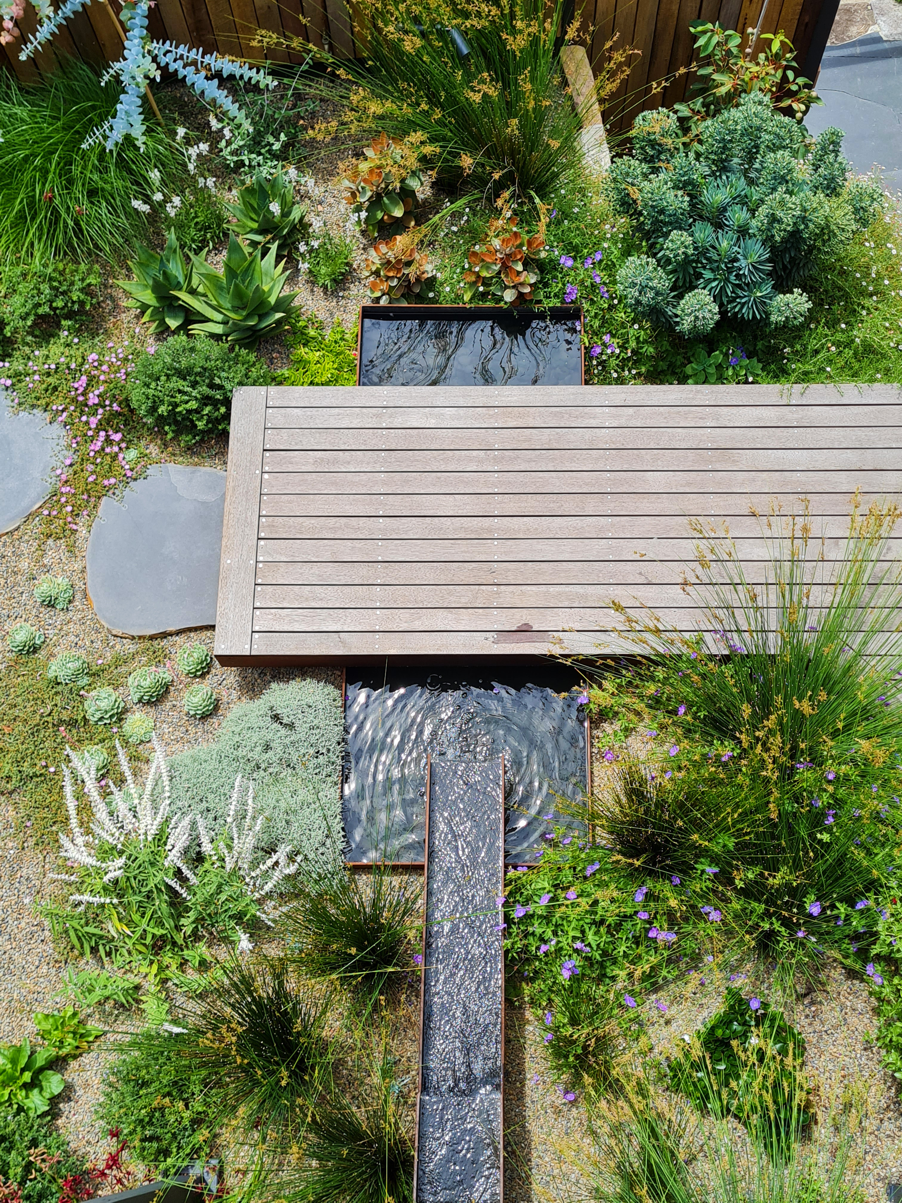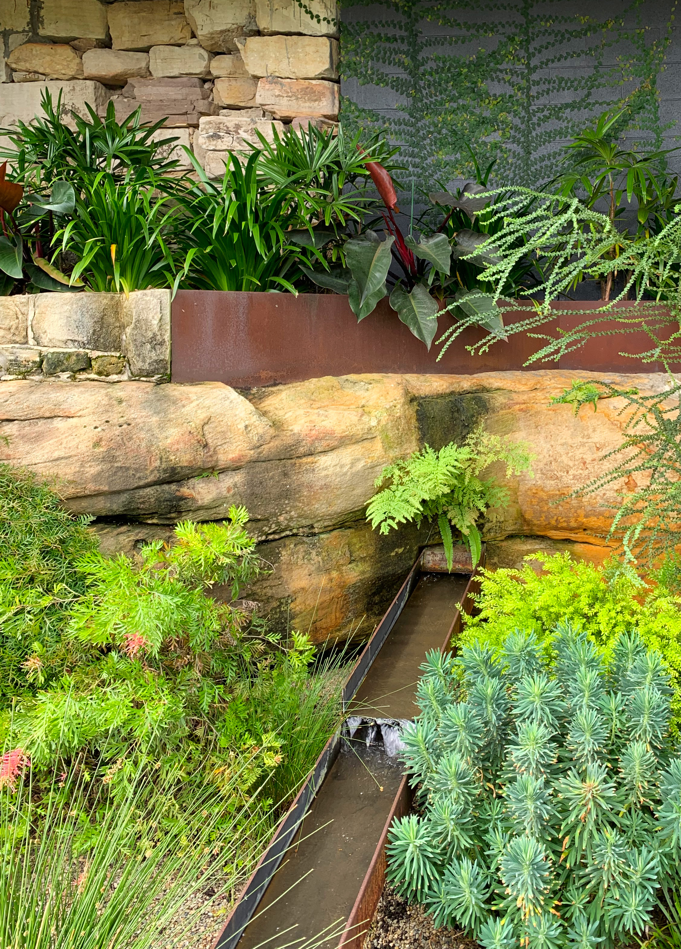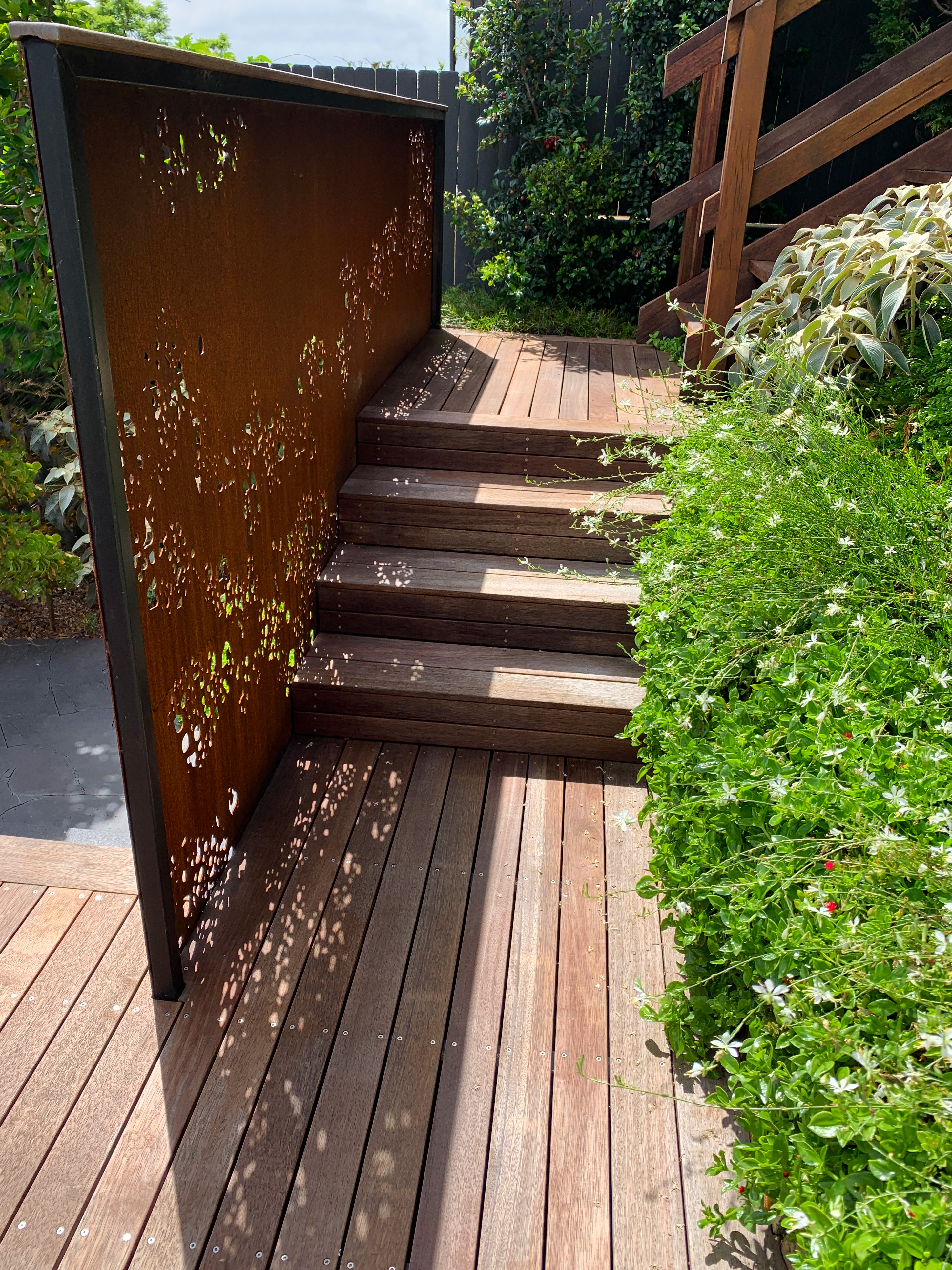 The stair ways were to be easy and comfortable to navigate. The garden was to be a beautiful and interesting ‘artwork’ to look down into from the main deck of house above, incorporating existing sandstone and include a water feature. The clients requested that there be no lawn.