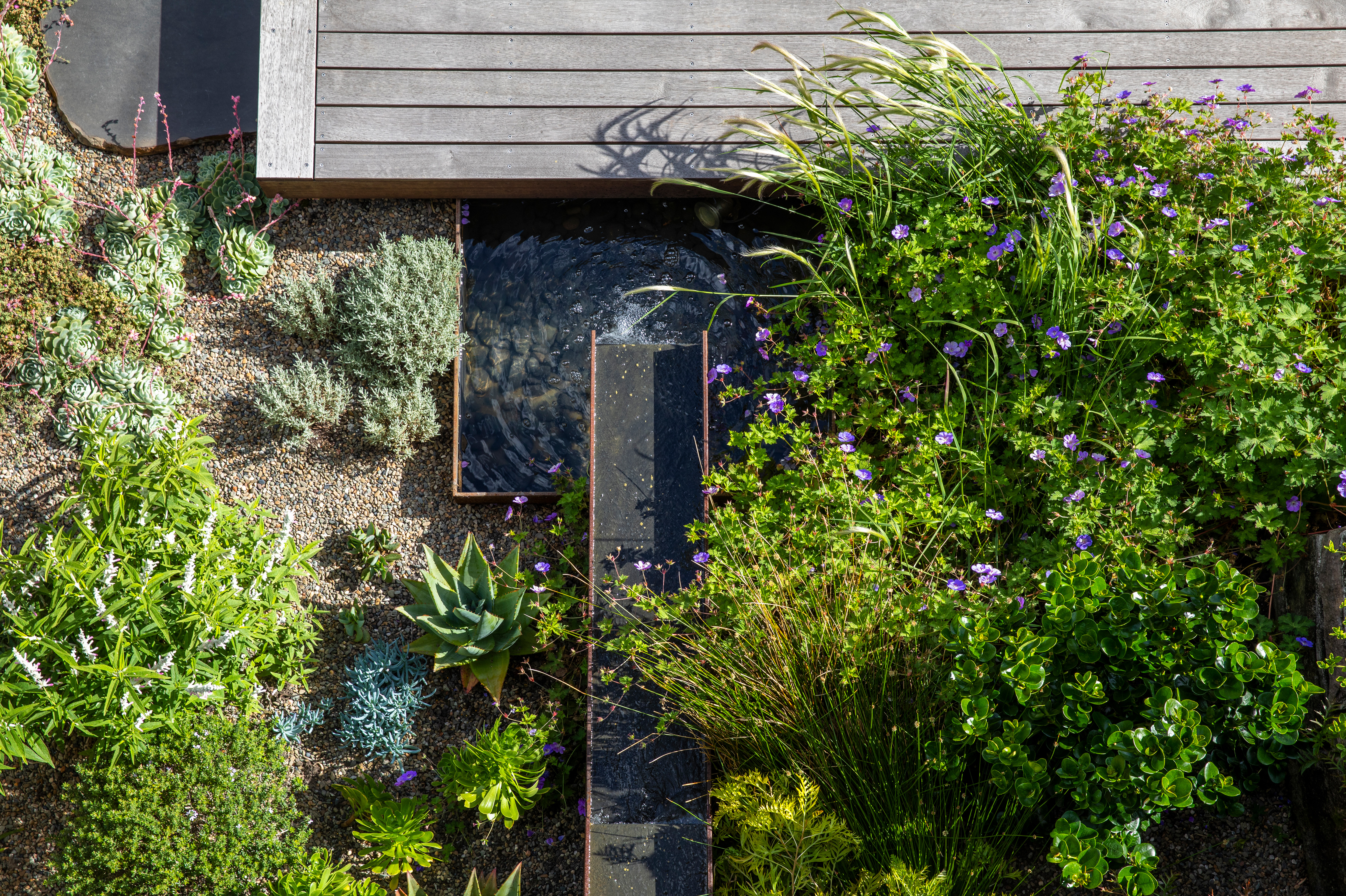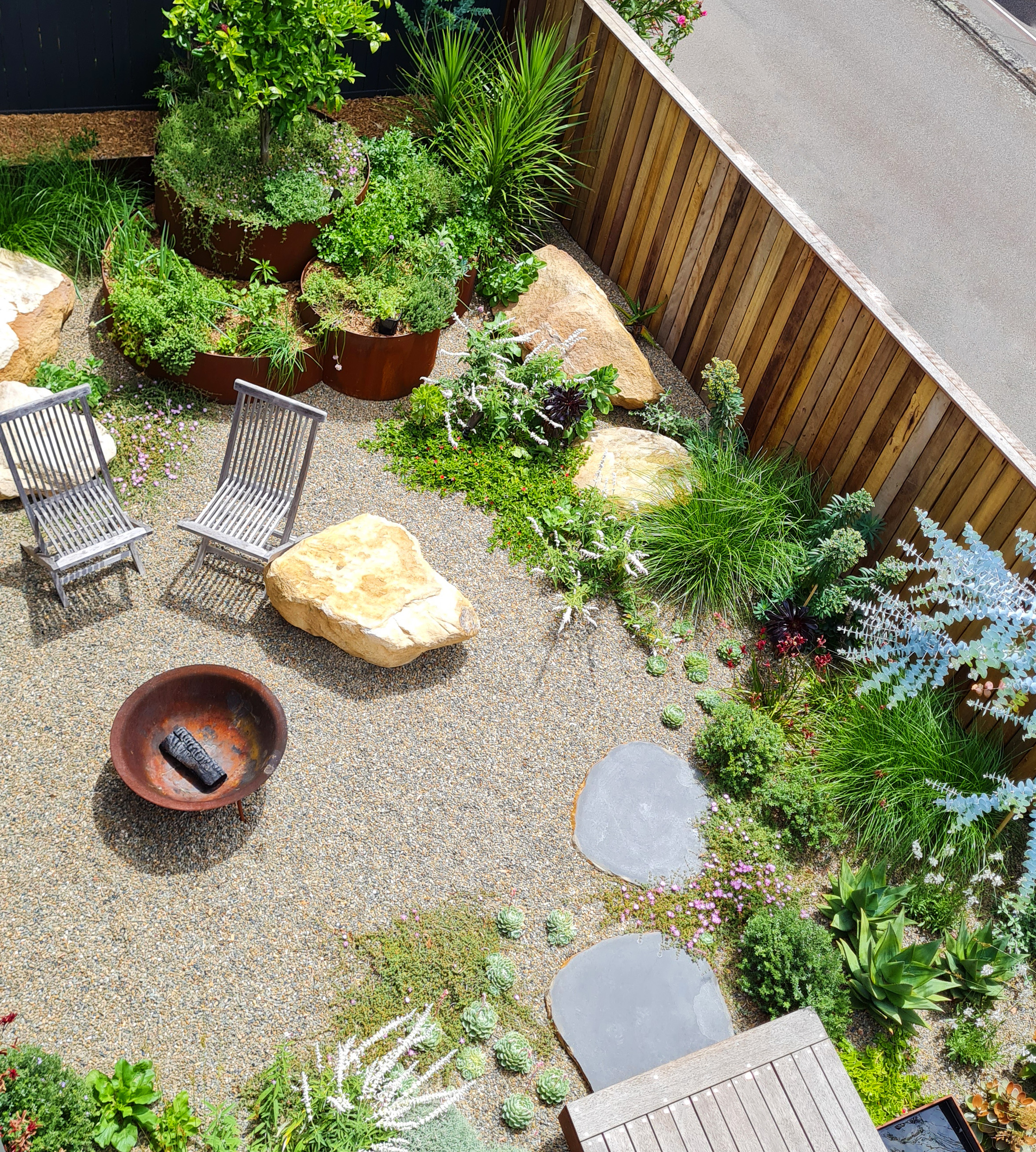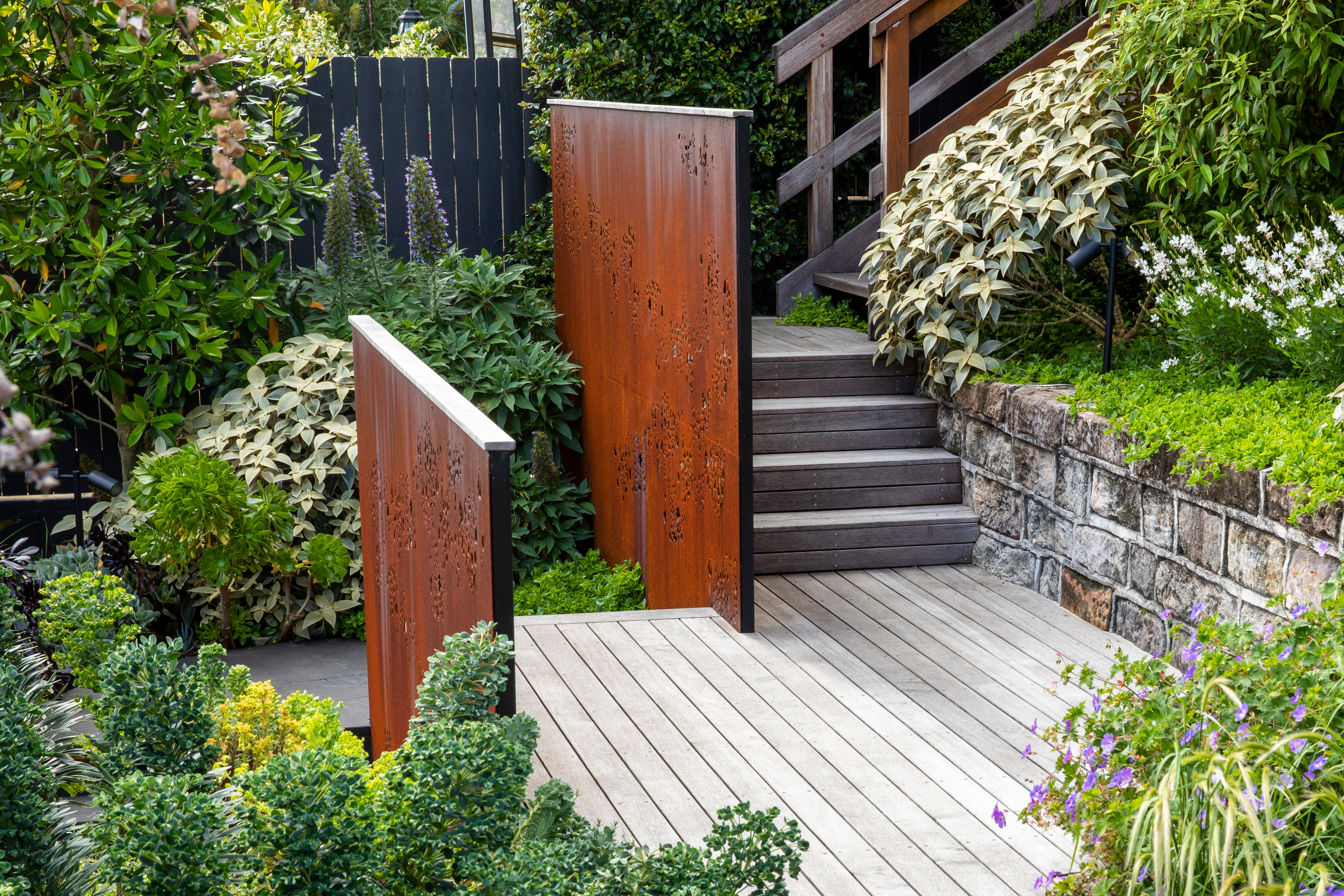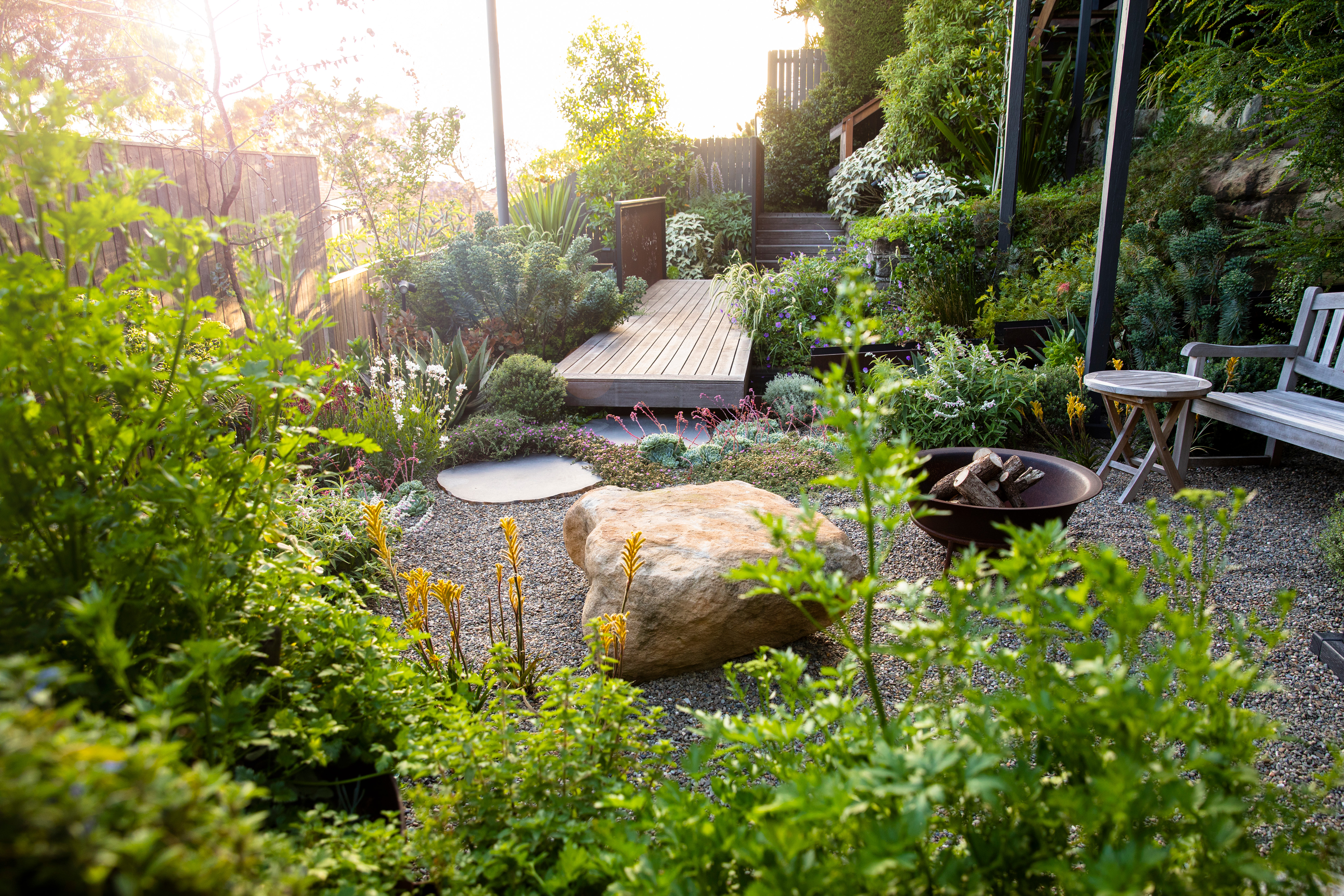 The stair ways were to be easy and comfortable to navigate. The garden was to be a beautiful and interesting ‘artwork’ to look down into from the main deck of house above, incorporating existing sandstone and include a water feature. The clients requested that there be no lawn.